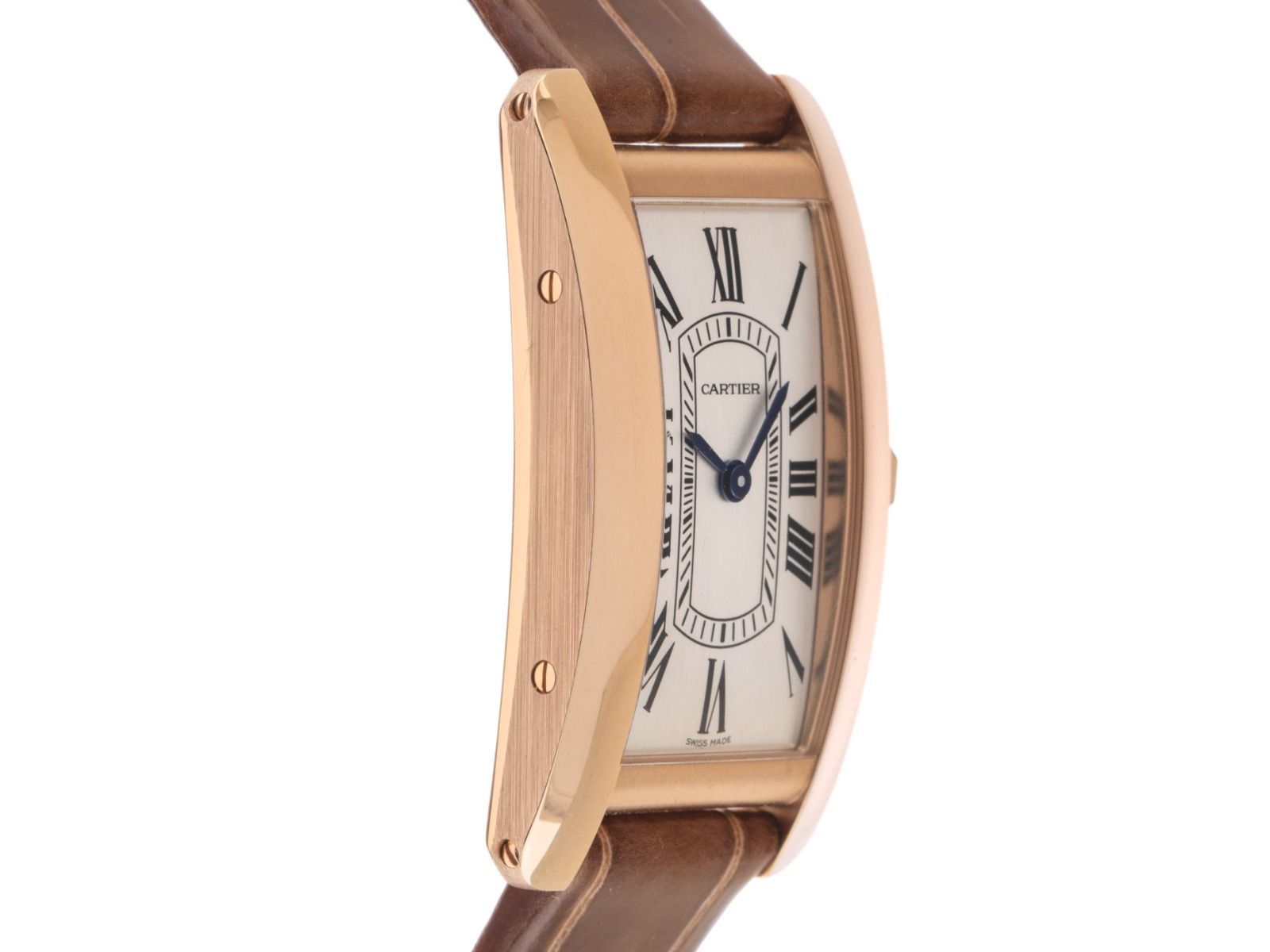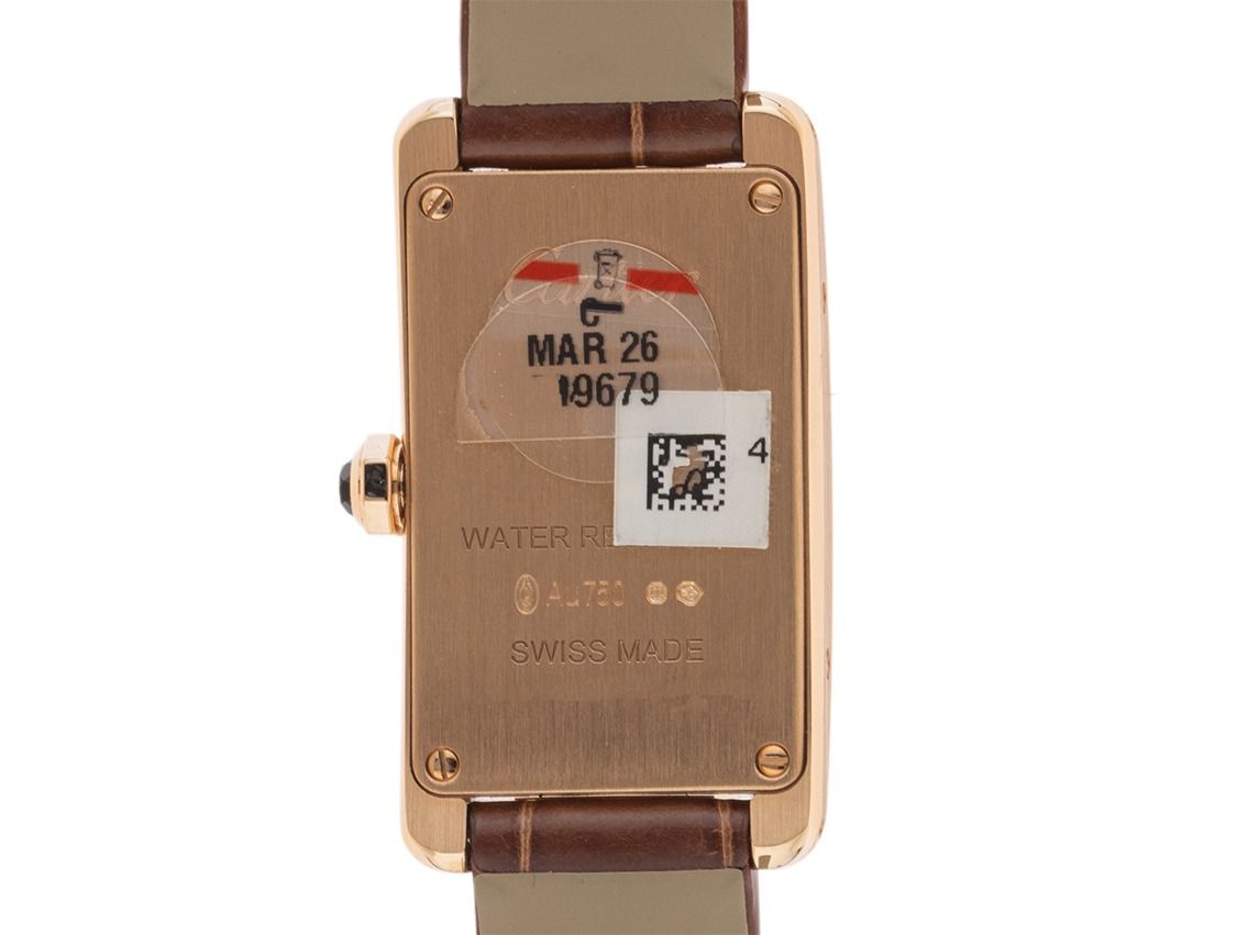 Gehäuse 18kt Roségold poliert und satiniert, rechteckig, Gehäusemaße ohne Krone (L x B x H) 35,4 x 19,4 x 6,8mm. Armband Leder braun, Anstoßbreite 13mm, Cartier Stiftschließe 18kt Roségold. Zifferblatt silberfarben mit schwarzen römischen Ziffern und gebläuten Zeigern. Uhrwerk quarzgesteuert, Kaliber Cartier. Anzeige von Stunde und Minute über Zeiger aus der Mitte. Saphirglas. Krone mit Saphir. Boden 18kt Roségold 4-fach verschraubt und graviert. Gewicht der Uhr inklusive Armband 37g. Wasserdicht bis 3 ATM. Referenznummer: WGTA0133, ID: ST1160192581125H-12900, Artikelnummer: 10000083333. Original Cartier Box mit Umkarton und Garantie Papiere von September 2025, Full Set. Ungetragen. Lieferzeit sofort.