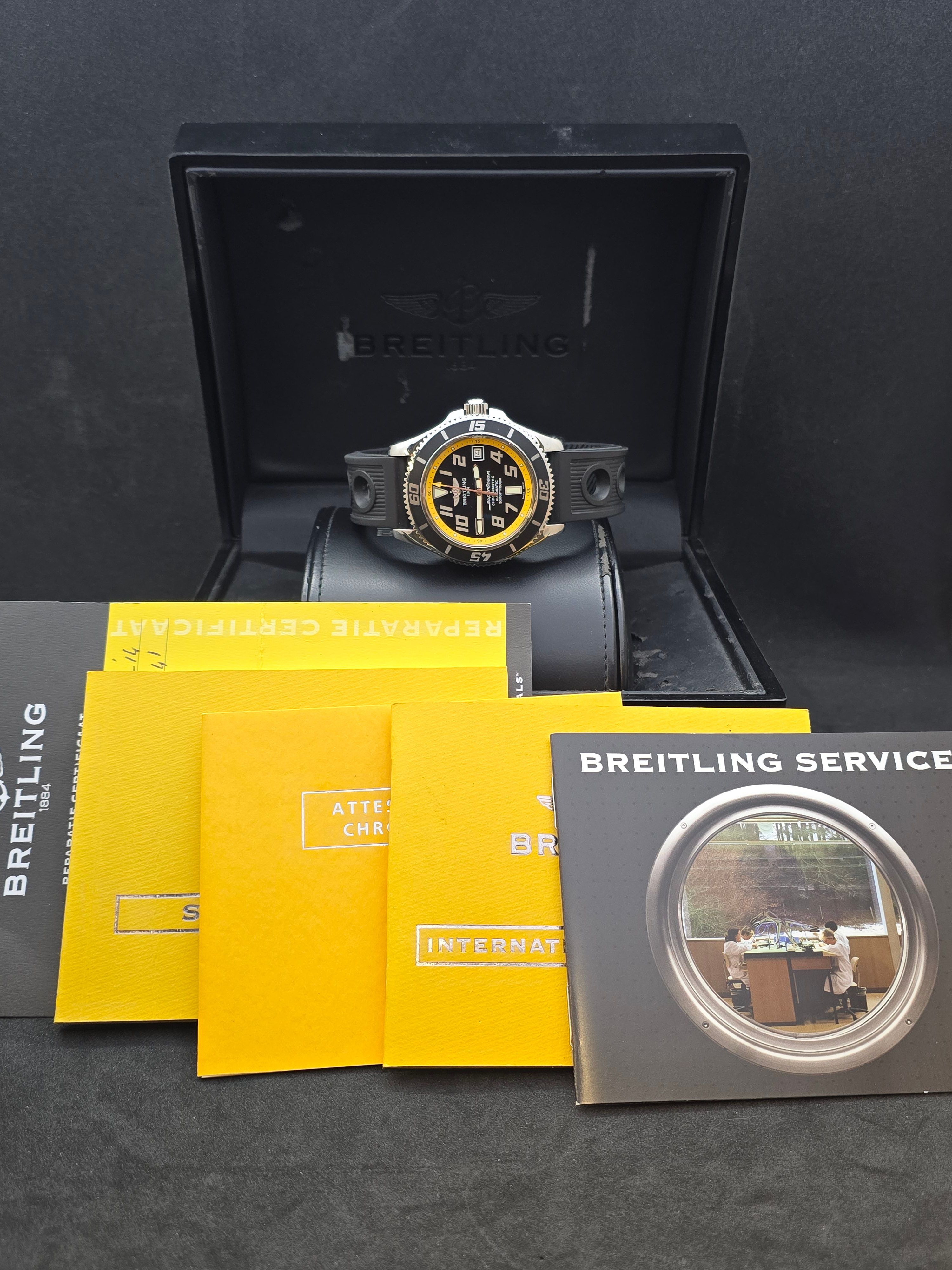Built to withstand depths of up to 1,500 meters, the Superocean 42 offers true professional-grade performance. The unidirectional ratcheted bezel, screw-down crown, and sapphire crystal reinforce its tool-watch credentials, while the black rubber Breitling strap guarantees comfort and durability in any environment.