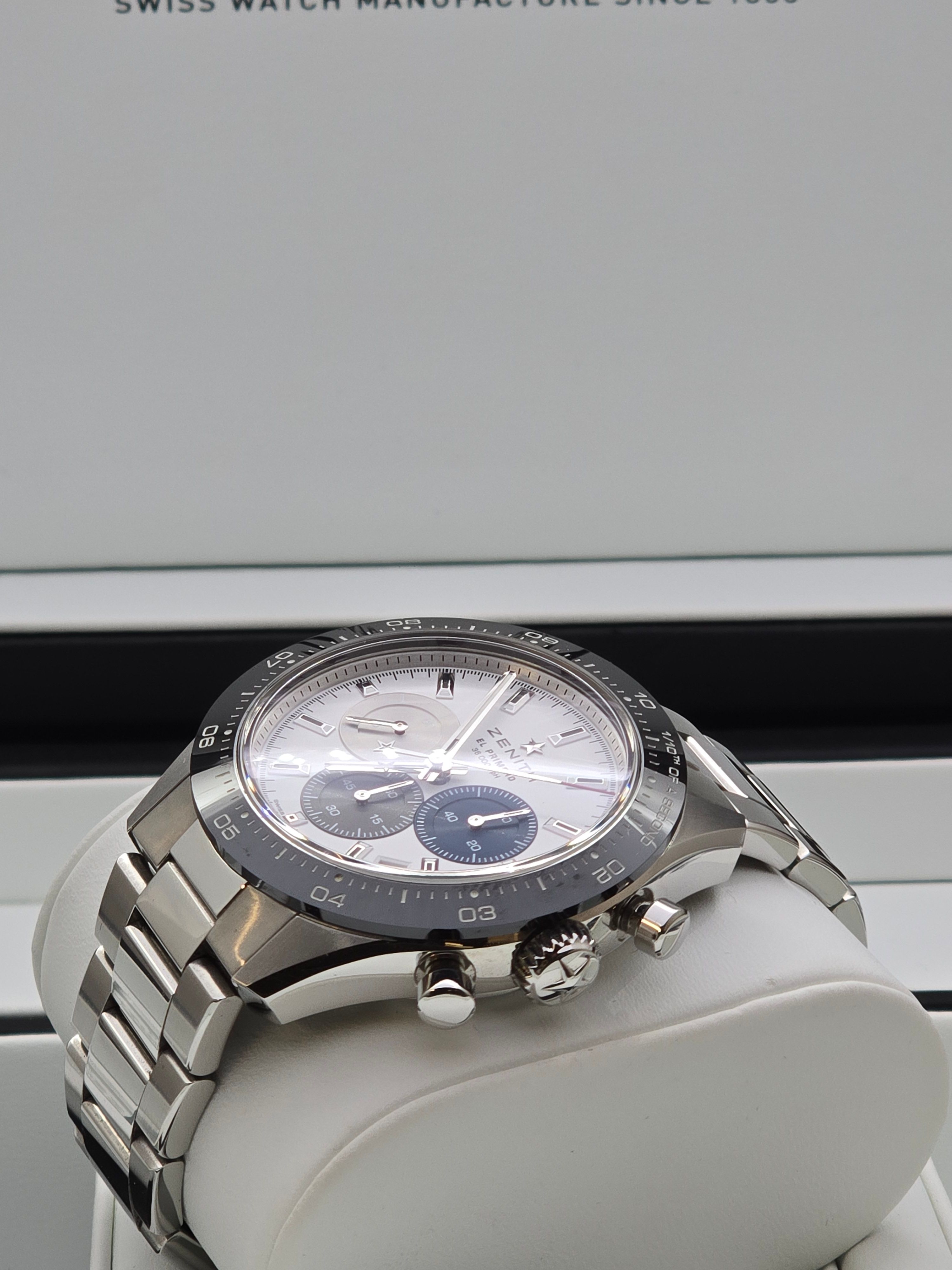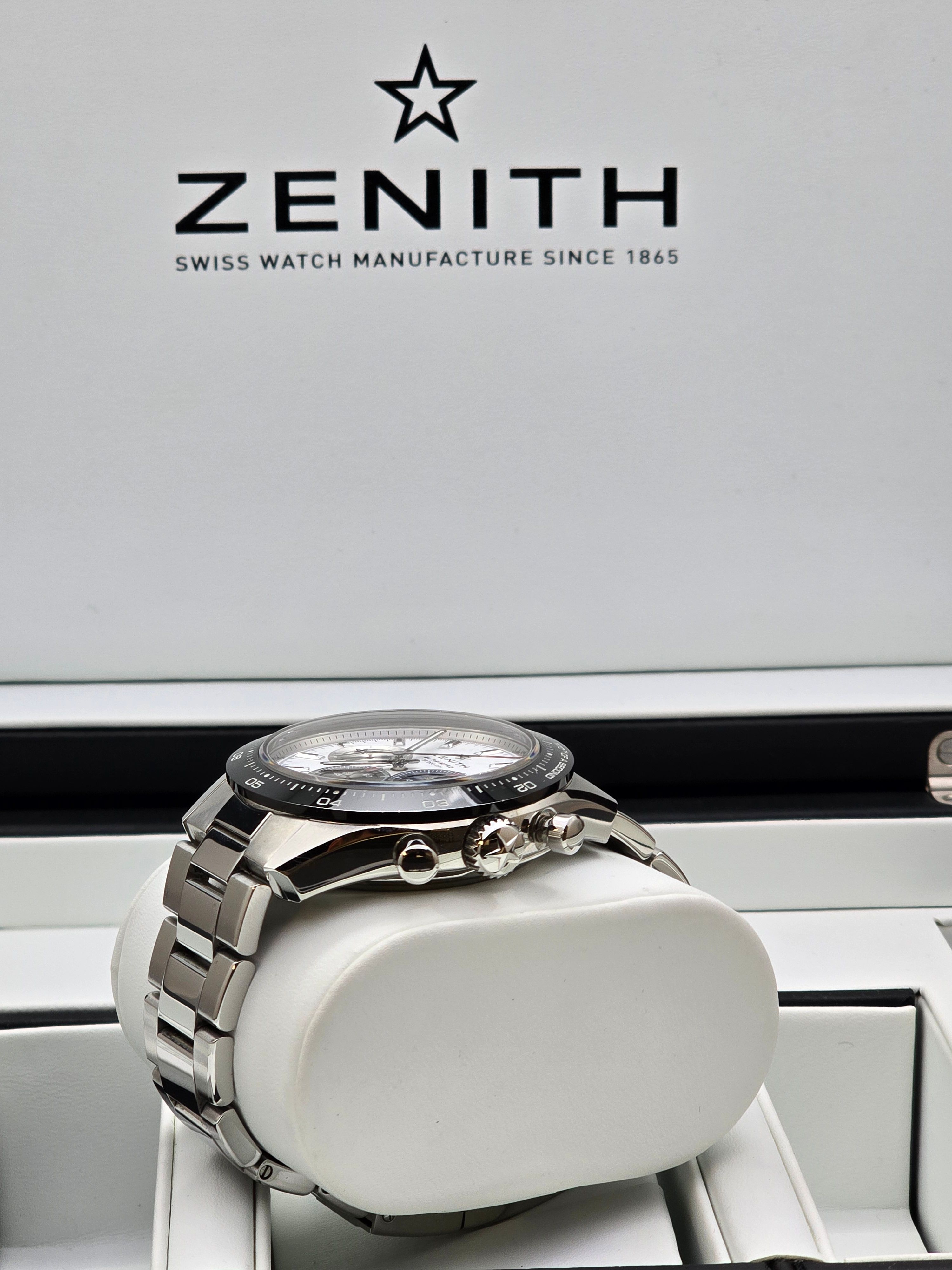 Elevate your collection with this exceptional Zenith Chronomaster Sport featuring the stunning white dial and a robust stainless steel bracelet. The watch, reference number 03.3100.3600/69.M3100, is a modern icon powered by the legendary El Primero 3600 automatic chronograph movement, offering high-frequency precision and 1/10th of a second measurement.