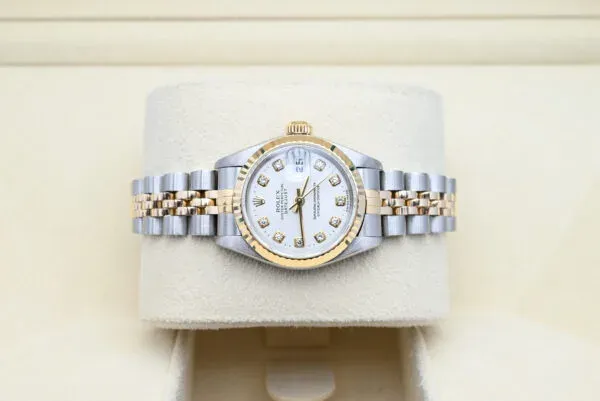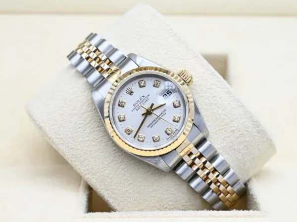 Rolex Lady-Datejust Ref. 69173 with the silver diamond dial from 1999 in excellent condition, including the original box and papers.All of our watches have been thoroughly checked by our own watchmaker and serviced when needed.