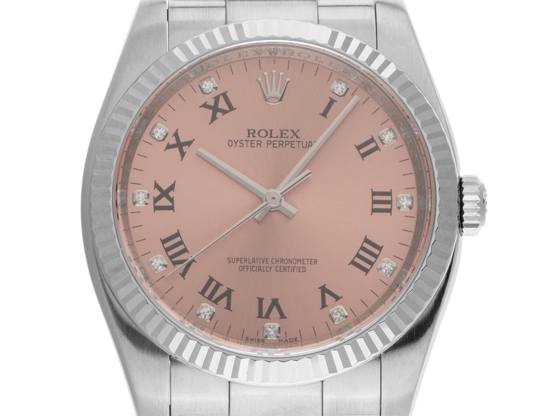 Gehäuse Edelstahl poliert und satiniert, Gehäusedurchmesser ohne Krone 36mm, Gehäusehöhe 11,8mm. Lünette 18kt Weißgold poliert und geriffelt. Armband Oyter Edelstahl satiniert, Faltschließe Edelstahl mit Hersteller-Logo. Zifferblatt roséfarben mit aufgesetzten Diamantindexen, schwarzen römischen Ziffern und weißgoldenen Zeigern. Uhrwerk Automatik, Chronometer mit Zeugnis, Rolex Manufakturkaliber 3135 mit 31 Edelsteinen. Anzeige von Stunde, Minute und Sekunde über Zeiger aus der Mitte mit Sekundenstopp zur sekundengenauen Einstellung der Uhrzeit. Saphirglas kratzfest. Krone verschraubbar mit Hersteller-Logo. Boden Edelstahl verschraubt. Gewicht der Uhr inklusive Armband 122g, Länge des Armbandes inklusive Gehäuse 170mm. Referenznummer: 116034, Gehäusenummer: M485XXX, Baujahr: 2007, ID: P1971137081125H-10700, Artikelnummer: 10000083387. Mit Gangkontrolle und kompletter äußerlicher Aufarbeitung von November 2025. Original Rolex Box mit Umkarton und Garantie Papiere von Juli 2009, LC 888 / Hong Kong sowie Beschreibung, Ledermäppchen, Übersetzungsheft, Rolex Chronometer-Siegel und Watchregister Auszug von November 2025, The Watch Register Zertifikat / ohne Eintrag (Internationale Datenbank für verlorene oder gestohlene Uhren), Full Set. Kapitalanlage mit Wertsteigerungspotential, fast nicht getragen. Wie Neu. Lieferzeit sofort.
