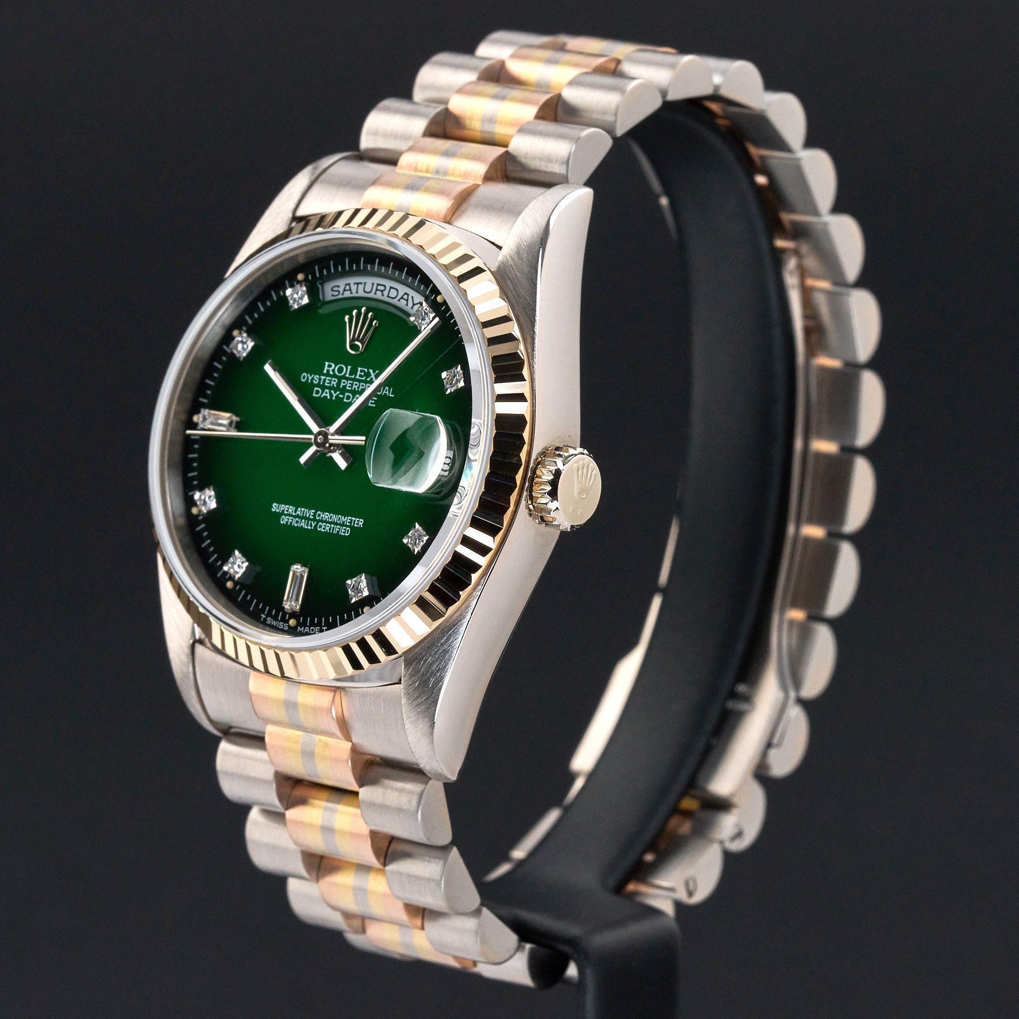 This Rolex Rare TRIDOR Day-Date 18239 features a Green vignette small diamond dial and is crafted from 18K white gold, with a production year of 1990.