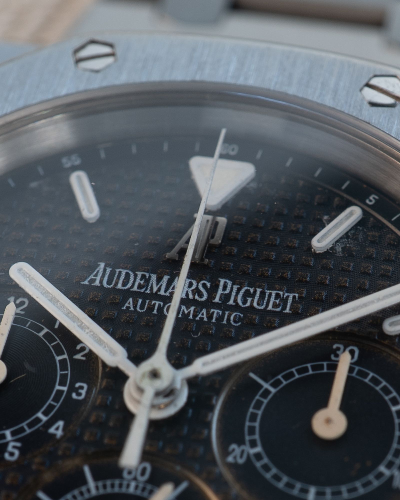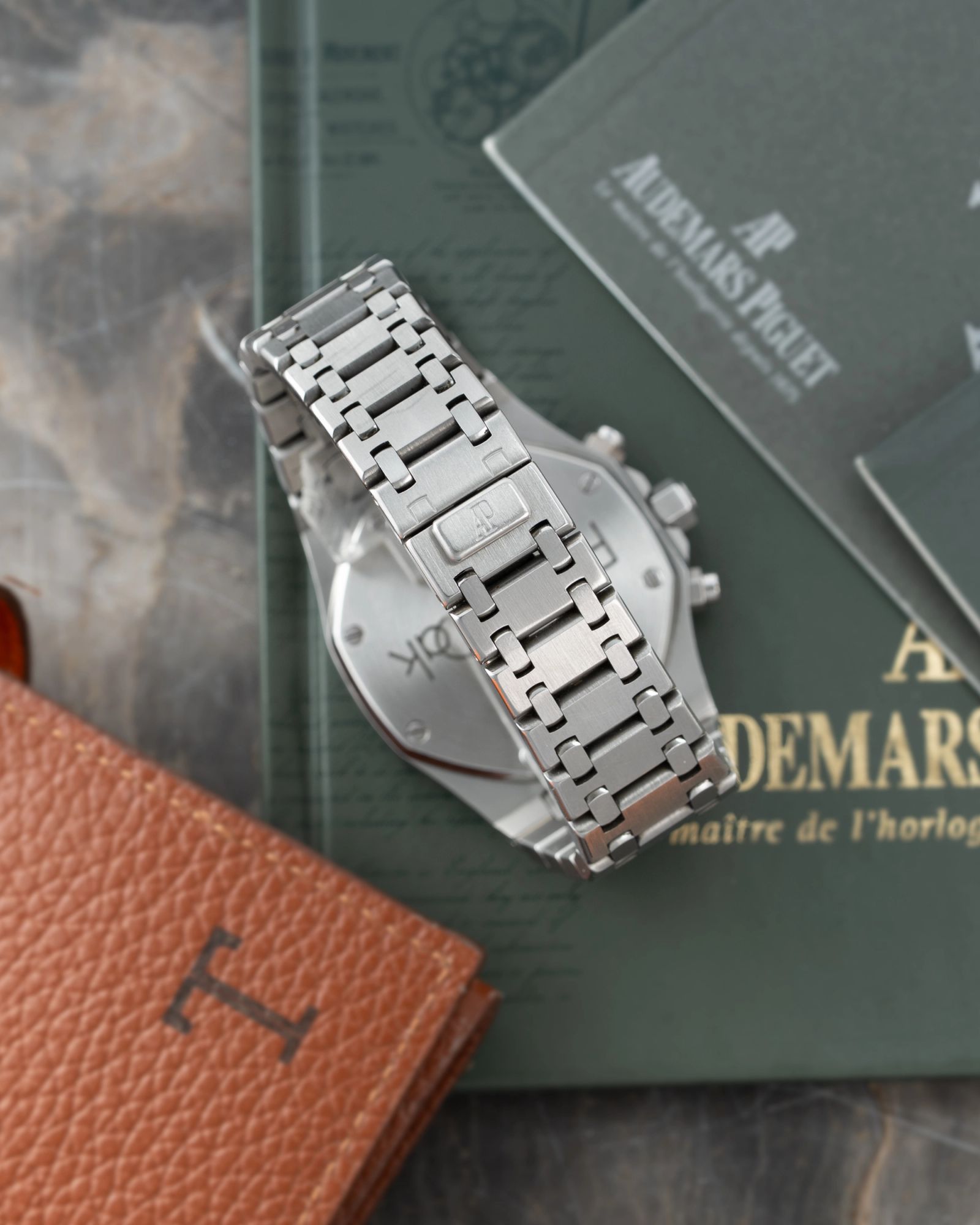 The 39mm stainless steel case is in great condition. Have a look at our macro pictures and see the stunning combination of the brushed and polished surfaces. The stainless steel bracelet is very tight and a work of art in itself, it is the famous integral part of the watch's design and is meticulously crafted. The bracelet is designed for both comfort and style, with its ergonomic shape and the iconic AP folding clasp ensuring a secure fit.