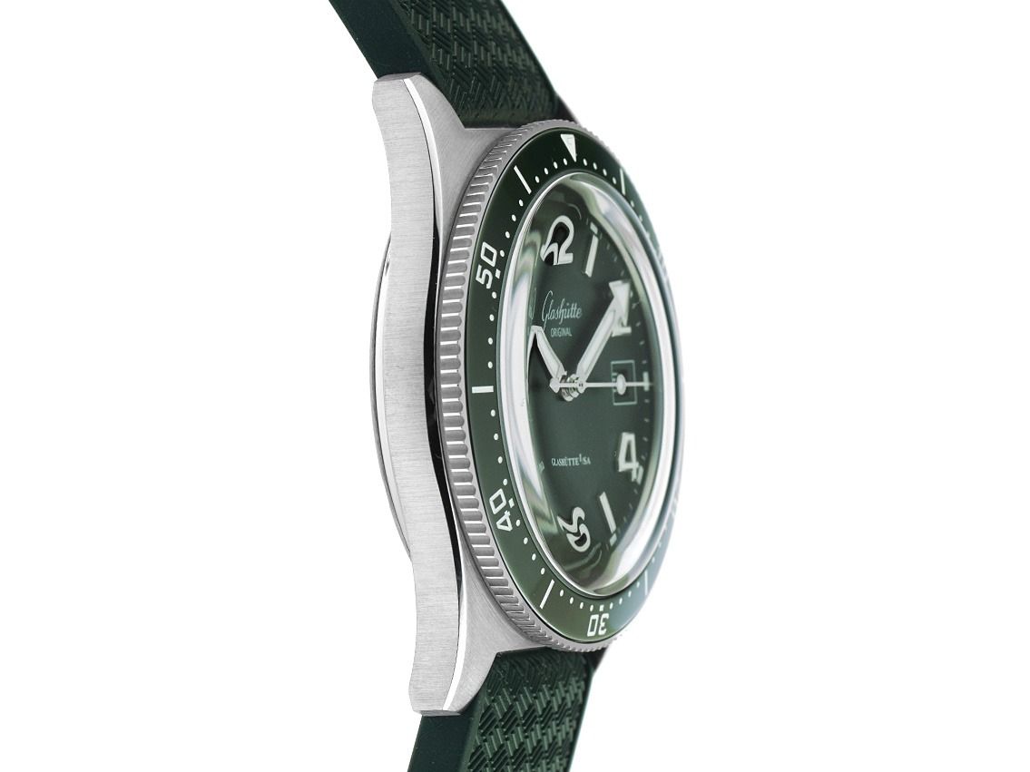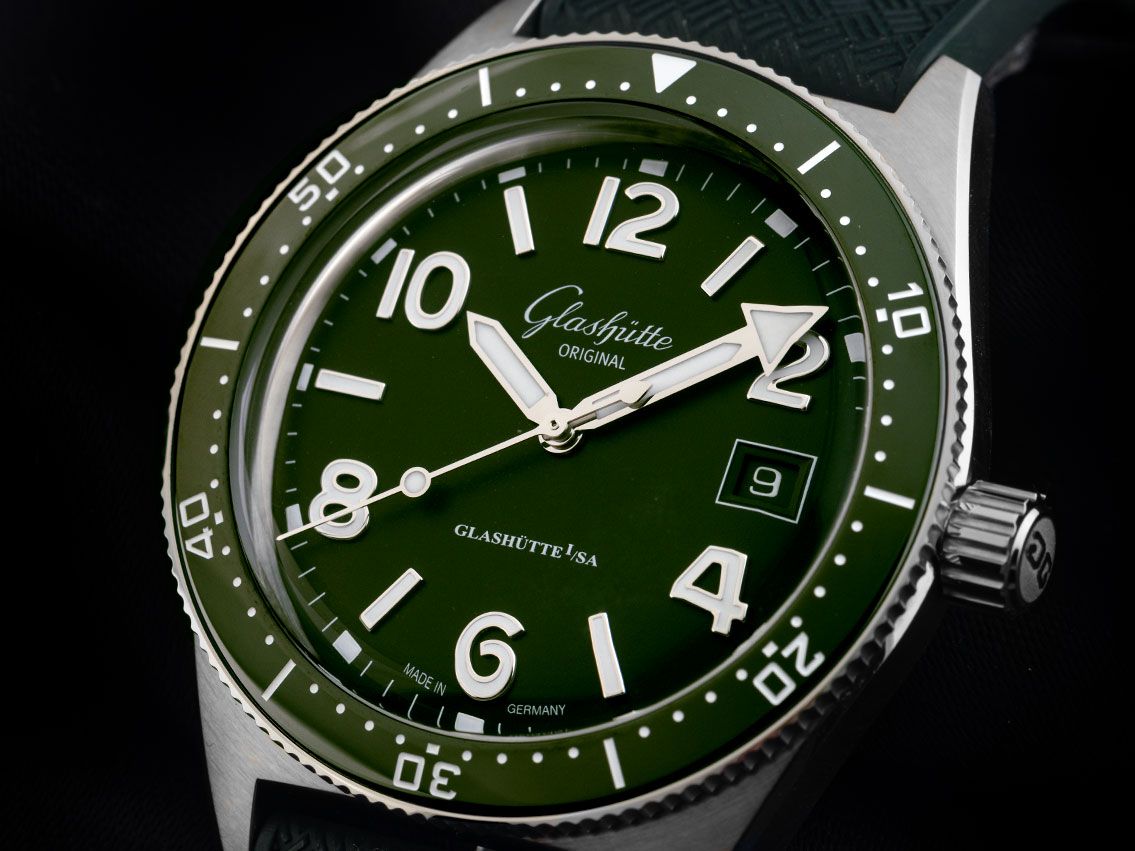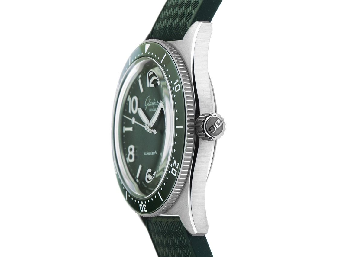 Gehäuse Edelstahl satiniert, Gehäusedurchmesser ohne Krone 39,5mm, Gehäusehöhe 12,15mm, Lünette Edelstahl mit dunkelgrünem Keramik Inlay und 60-Minuten Skala, einseitig drehbar. Armband Kautschuk Schilfgrün, Anstoßbreite 20mm, Doppelsicherheitsfaltschließe Edelstahl mit Hersteller-Logo. Zifferblatt Schilfgrün mit arabischen Leuchtziffern und Leuchtindexen sowie polierten Edelstahl Leuchtzeigern. Uhrwerk Automatik, Glashütte Original Manufakturkaliber 39-11 mit 25 Edelsteinen, ca. 40 Stunden Gangreserve. Anzeige von Stunde, Minute und Sekunde über Zeiger aus der Mitte mit Sekundenstopp zur sekundengenauen Einstellung der Uhrzeit, Datumsanzeige mit Schnellverstellung bei 3 Uhr. Saphirglas kratzfest, gewölbt. Krone verschraubbar mit Hersteller-Logo. Boden Edelstahl verschraubt und graviert. Gewicht der Uhr inklusive Armband 104g. Wasserdicht bis 20 ATM. Referenznummer: 1-39-11-13-83-37, ID: ST1160141200525H-10200, Artikelnummer: 10000080353. Glashütte Original Box mit Umkarton und Garantie Papiere von Mai 2025 sowie Beschreibung, Full Set. Ungetragen. Lieferzeit sofort.