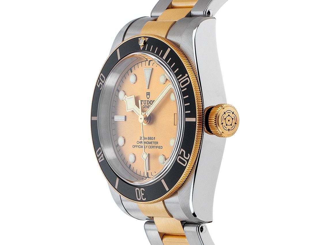 Gehäuse Edelstahl poliert und satiniert, Gehäusedurchmesser ohne Krone 41mm, Gehäusehöhe 15,0mm. Lünette Gelbgold mit schwarzem Inlay, 60-Minuten Einteilung und Leuchtpunkt, einseitig drehbar. Armband Edelstahl / Gelbgold satiniert, Sicherheitsfaltschließe Edelstahl mit Hersteller-Logo. Zifferblatt champagnerfarben mit aufgesetzten in Gelbgold gefassten Leuchtindexen und gelbgoldenen Leuchtzeigern. Uhrwerk Automatik, Manufakturkaliber Tudor MT5612, Gangreserve ca. 70 Stunden. Anzeige von Stunde, Minute und Sekunde über Zeiger aus der Mitte mit Sekundenstopp zur sekundengenauen Einstellung der Uhrzeit, Datumsanzeige mit Schnellverstellung bei 3 Uhr. Saphirglas kratzfest und gewölbt. Krone verschraubbar mit Hersteller-Logo. Boden Edelstahl verschraubt und graviert. Gewicht der Uhr inklusive Armband 182g, Länge des Armbandes inklusive Gehäuse 180mm. Wasserdicht bis 20 ATM. Referenznummer: M79733N-0004, Gehäusenummer: I926XXX, ID: P199866001125H-6310, Artikelnummer: 10000083422. Mit Gangkontrolle und kompletter äußerlicher Aufarbeitung von November 2025. Original Tudor Box mit Umkarton und Garantie Papiere von Januar 2019 sowie Beschreibung und Watchregister Auszug von November 2025, The Watch Register Zertifikat / ohne Eintrag (Internationale Datenbank für verlorene oder gestohlene Uhren), Full Set. Wie Neu. Lieferzeit sofort.