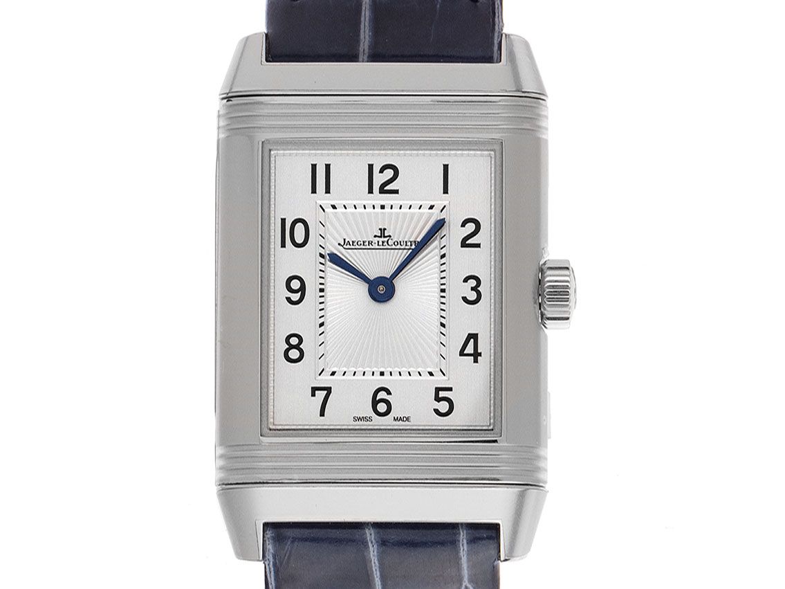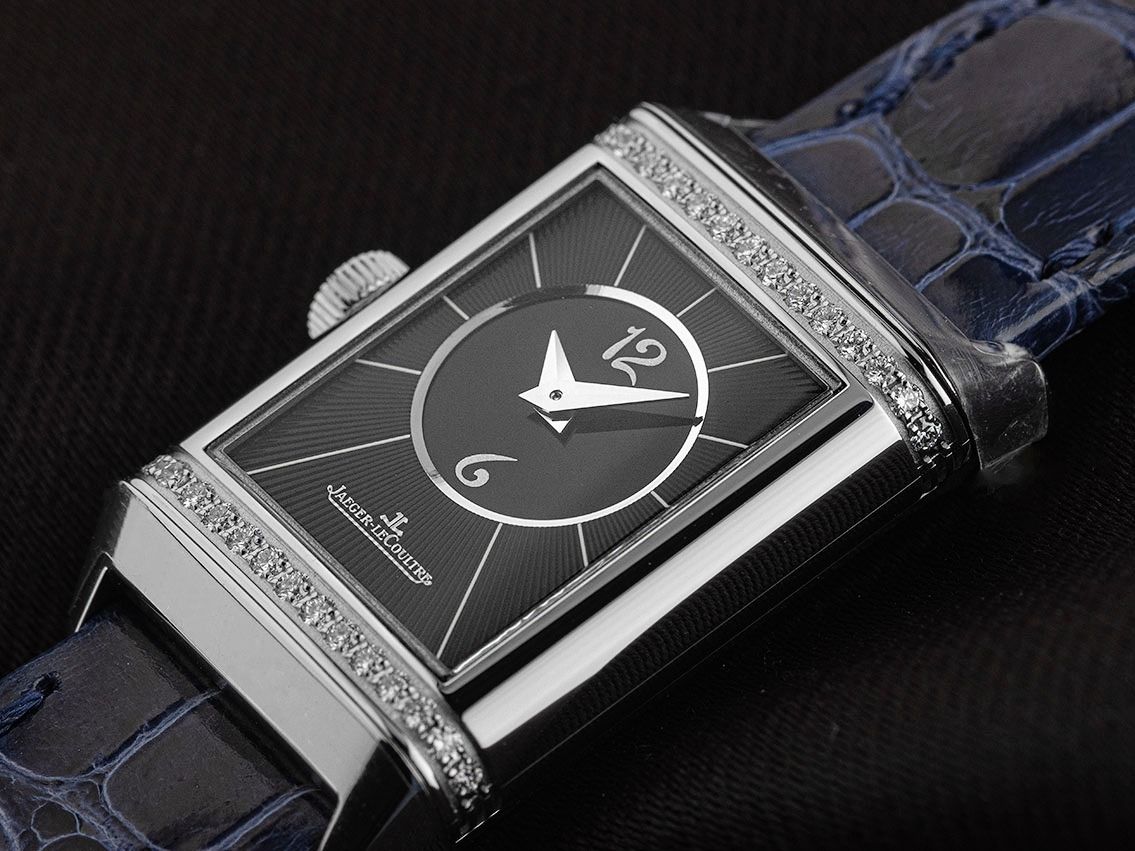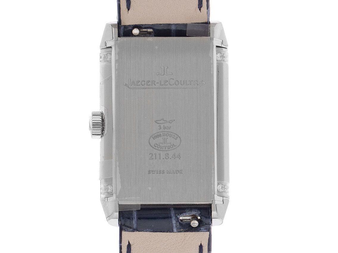 Gehäuse Edelstahl poliert, rechteckig, Gehäusemaße ohne Krone (L x B x H) 34,2 x 21 x 8,9mm mit 180° drehbarem Wendegehäuse. Rückseite mit 30 Diamanten besetzt, zusammen ca. 0,28ct. Armband Krokoleder blau mit Ziernaht, Anstoßbreite 15mm, Doppelfaltschließe Edelstahl mit Hersteller-Logo. Zifferblatt Vorderseite: Silbergrau, Guillochiert, vertikal gebürstet mit schwarzen arabischen Ziffern und gebläuten Zeigern, Zifferblatt Rückseite: schwarz guillochiert mit Indexen, arabischen Ziffern und polierten Zeigern. Uhrwerk Handaufzug, Jaeger-leCoultre Manufakturkaliber 844 mit 18 Edelsteinen. Vorderseite: Anzeige von Stunde und Minute über Zeiger aus der Mitte, Rückseite: Anzeige von Stunde und Minute über Zeiger aus der Mitte. Saphirglas kratzfest. Krone mit Hersteller-Logo. Boden Edelstahl graviert. Gewicht der Uhr inklusive Armband 40g. Referenznummer: 211.8.44, Gehäusenummer: 3427XXX, Baujahr: 2017, ID: P200482001125H-9200, Artikelnummer: 10000083435. Original Jaeger-leCoultre Box mit Umkarton und Garantie Papiere ohne Datumseintrag sowie Beschreibung und Watchregister Auszug von November 2025, The Watch Register Zertifikat / ohne Eintrag (Internationale Datenbank für verlorene oder gestohlene Uhren), Full Set. Wie Neu. Lieferzeit sofort.
