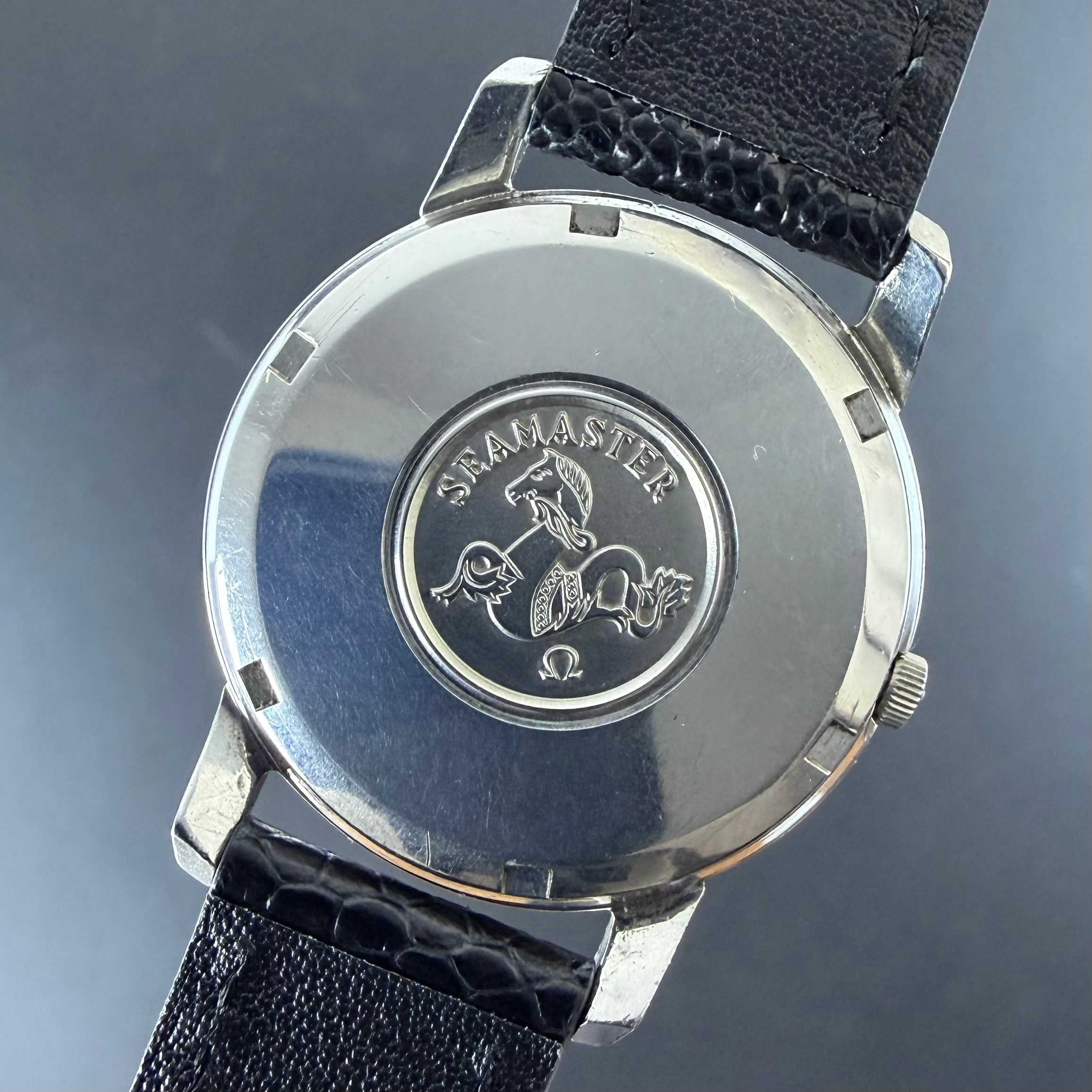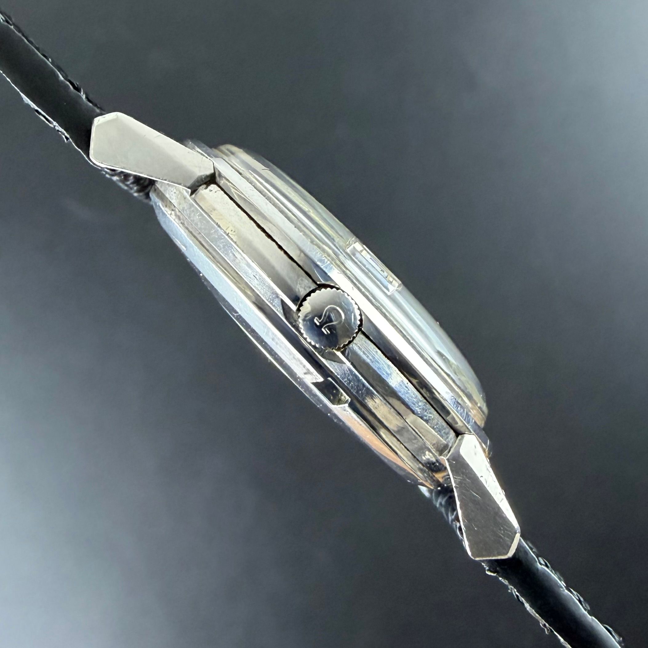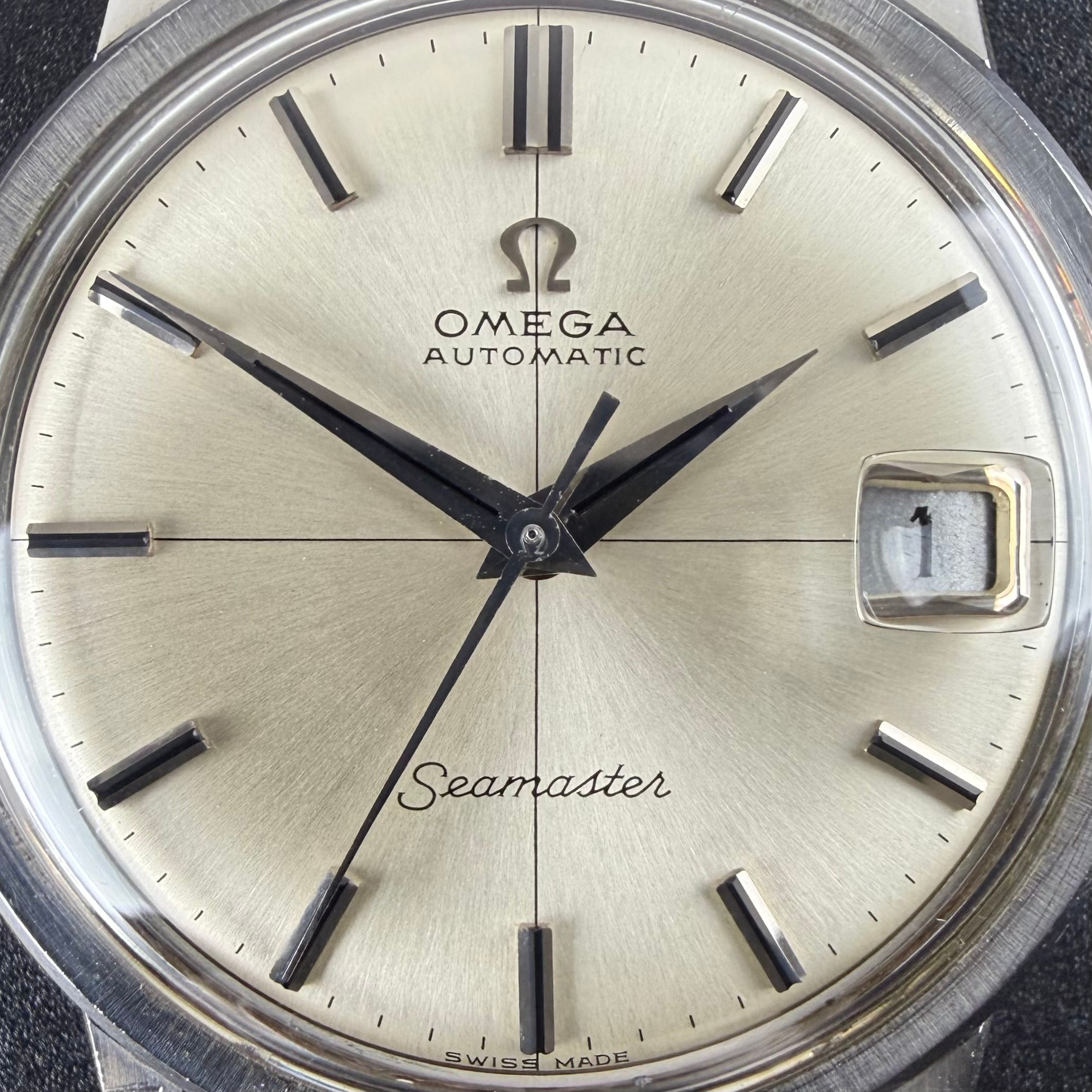 This vintage 1968 Omega Seamaster features a white sunburst dial with a crosshair motif and a stainless-steel case that retains most of its original polish. Its design partially hides the crown within the case, giving the watch a sleek profile. Inside is a caliber 565 automatic movement, serviced in November 2025 and running excellently. The watch is entirely original aside from a freshly replaced grade 3 calf leather strap with a crocodile-grain motif and light glossy finish. Overall condition is great.