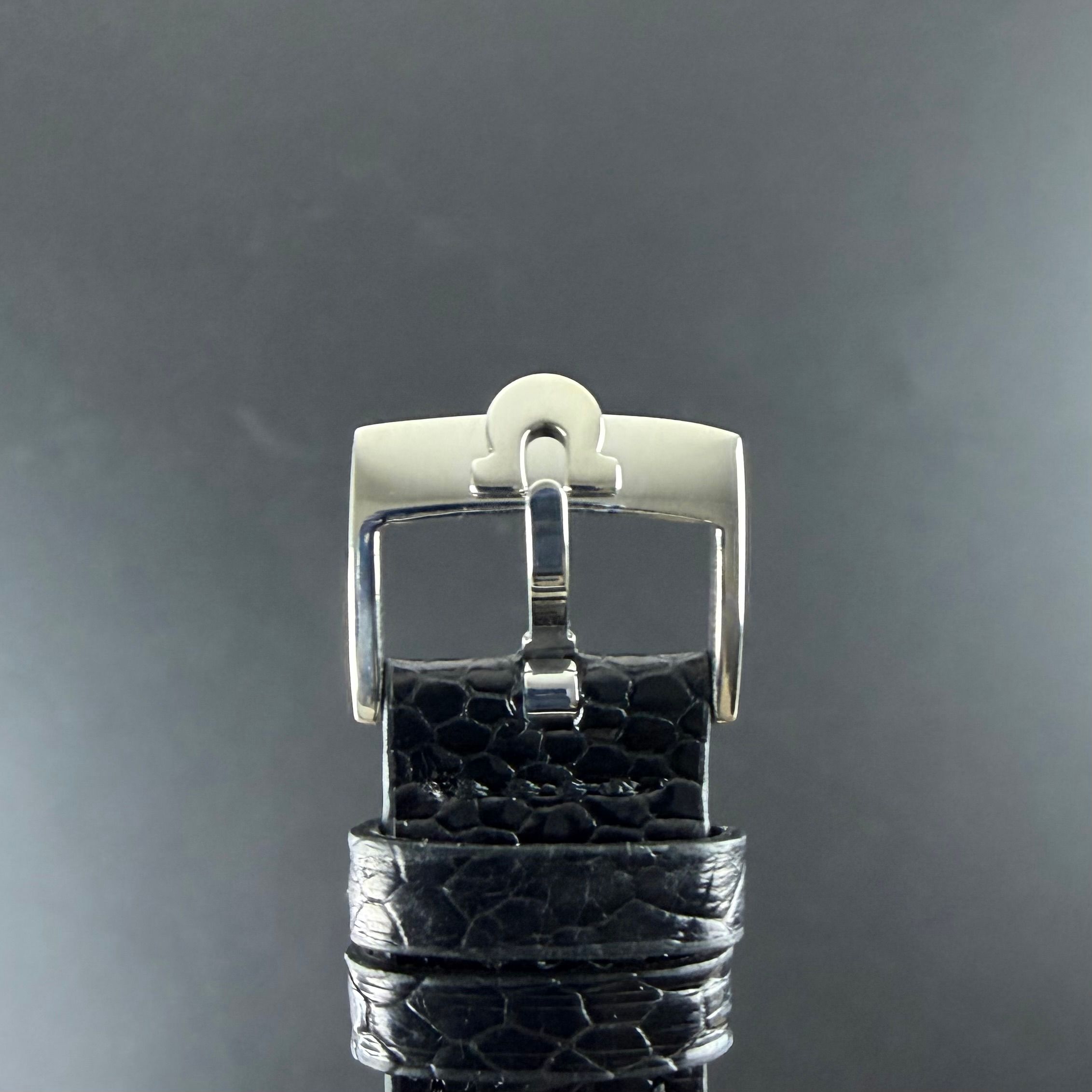 Strap: A grade III black calf leather strap with a crocodile grain and light glossy finish. (Fits a 12 to 20cm wrist)