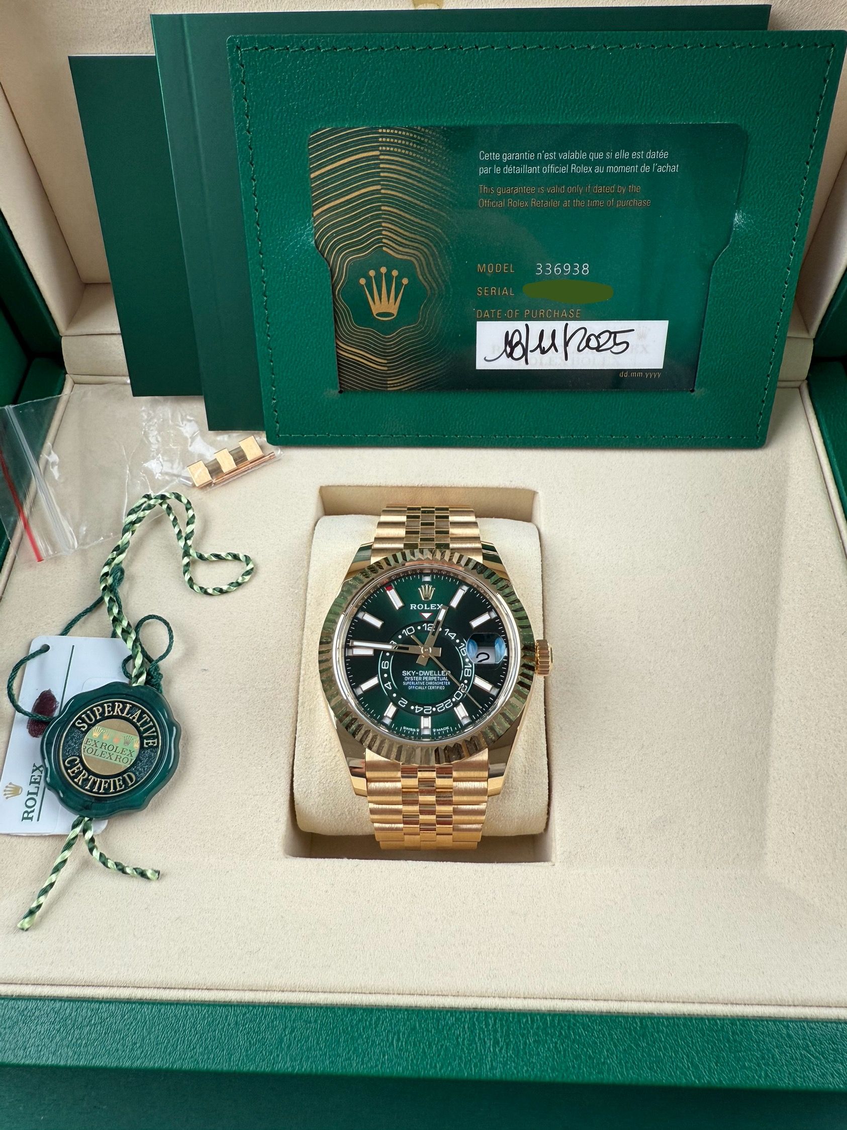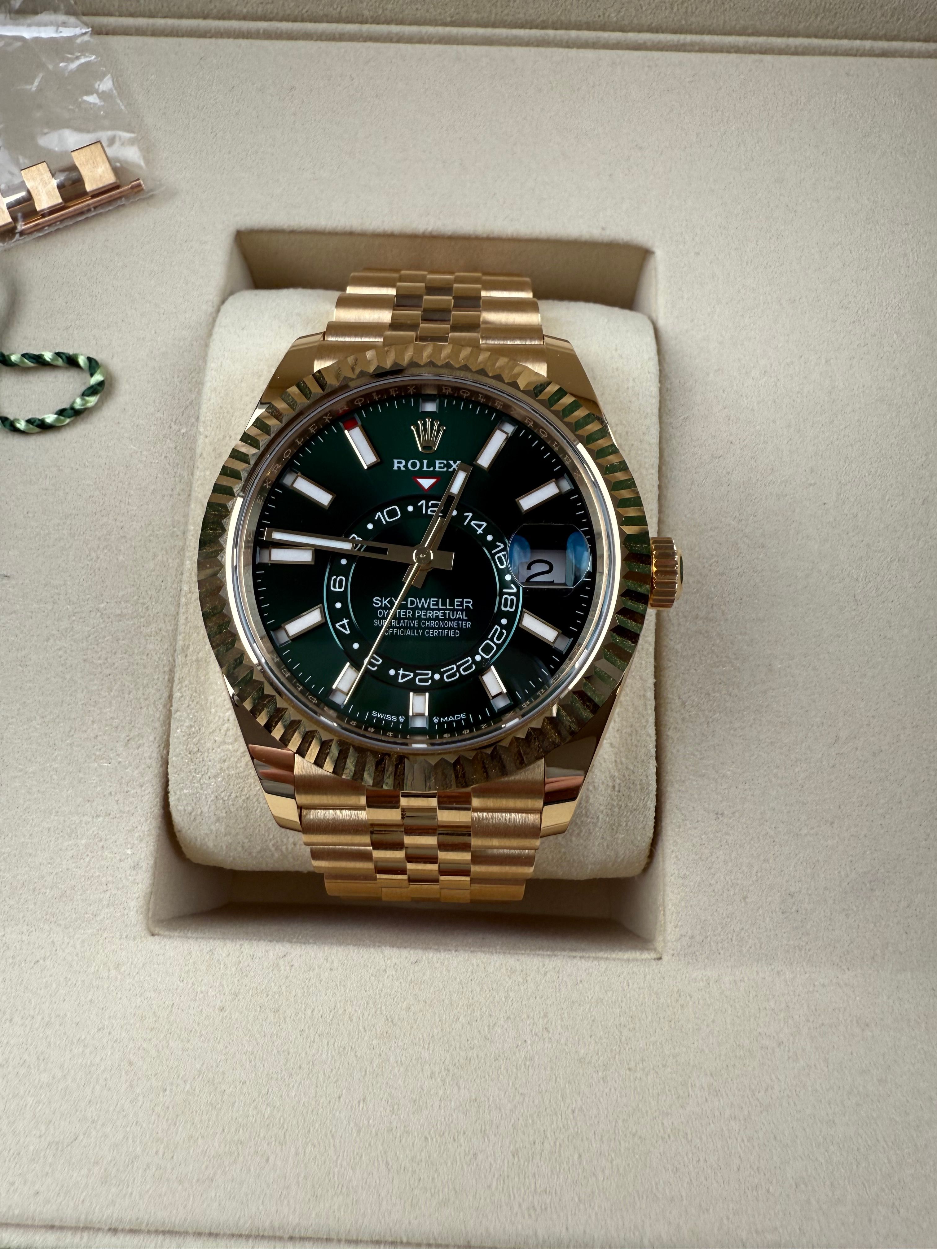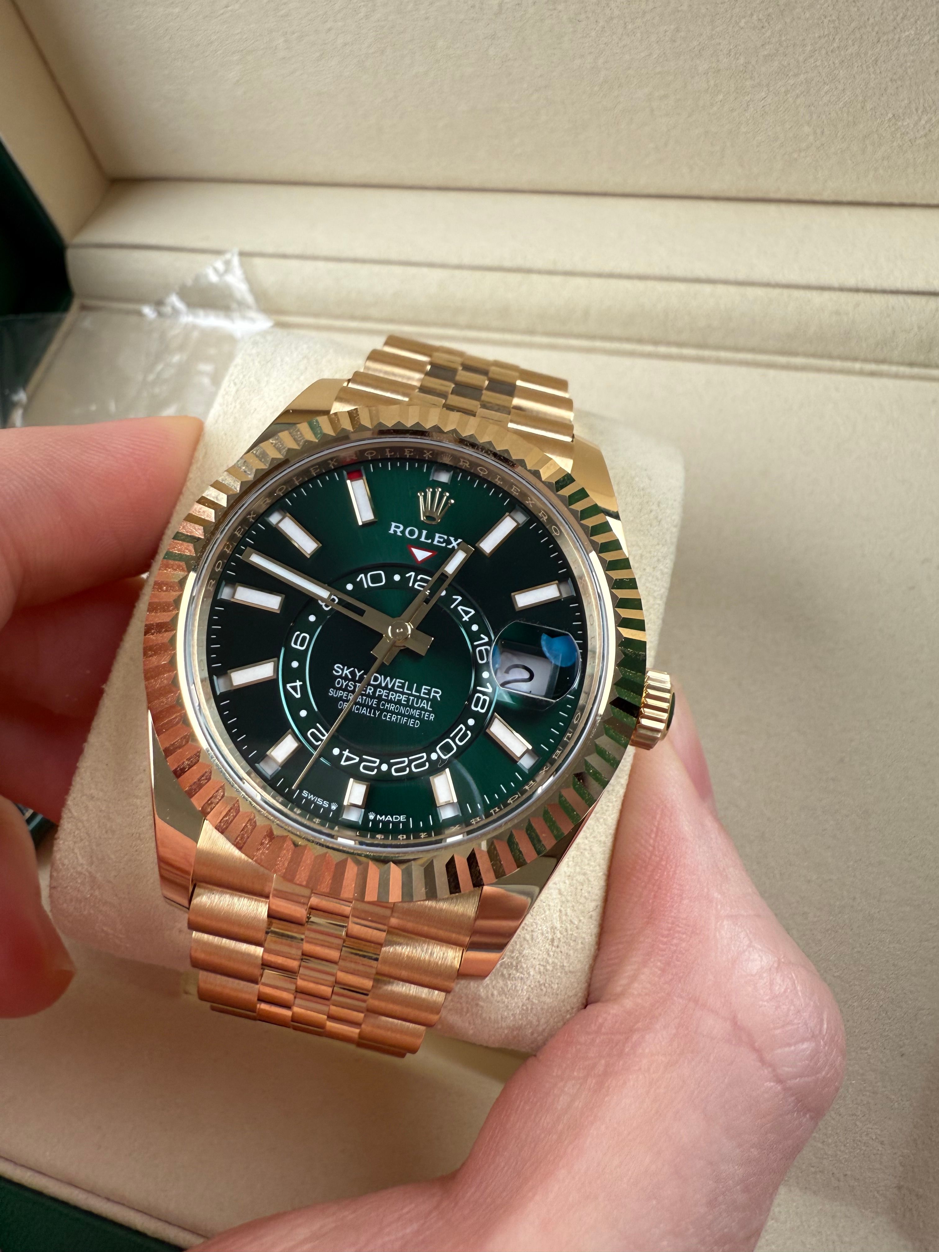 For sale is a brand new and unworn Sky-Dweller with newly released green dial. The watch comes as a complete set, purchased from the authorized retailer in November 2025. Worldwide warranty until November 2030.