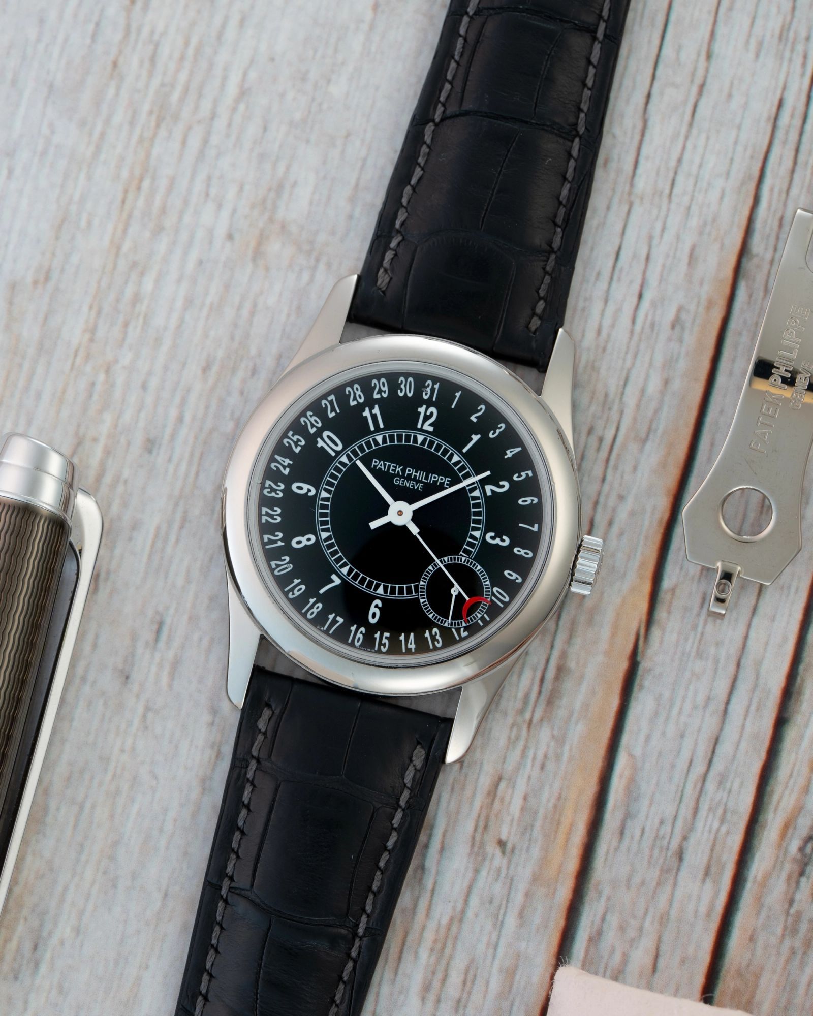 Crafted from 18k white gold, the 6000G beautifully blends modern and classic design cues. The black dial features a date display on the inner chapter ring, indicated by a white hand with a red, moon-shaped tip. The seconds are displayed in a sub-dial positioned between 4 and 5 o’clock, while the time is read on a bull’s-eye sub-dial with refined triangular accents. It is fitted with a black leather strap and secured by an 18k white-gold deployment clasp.