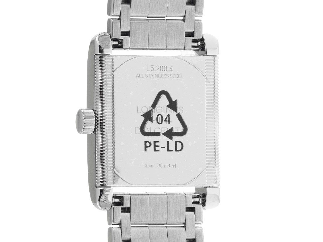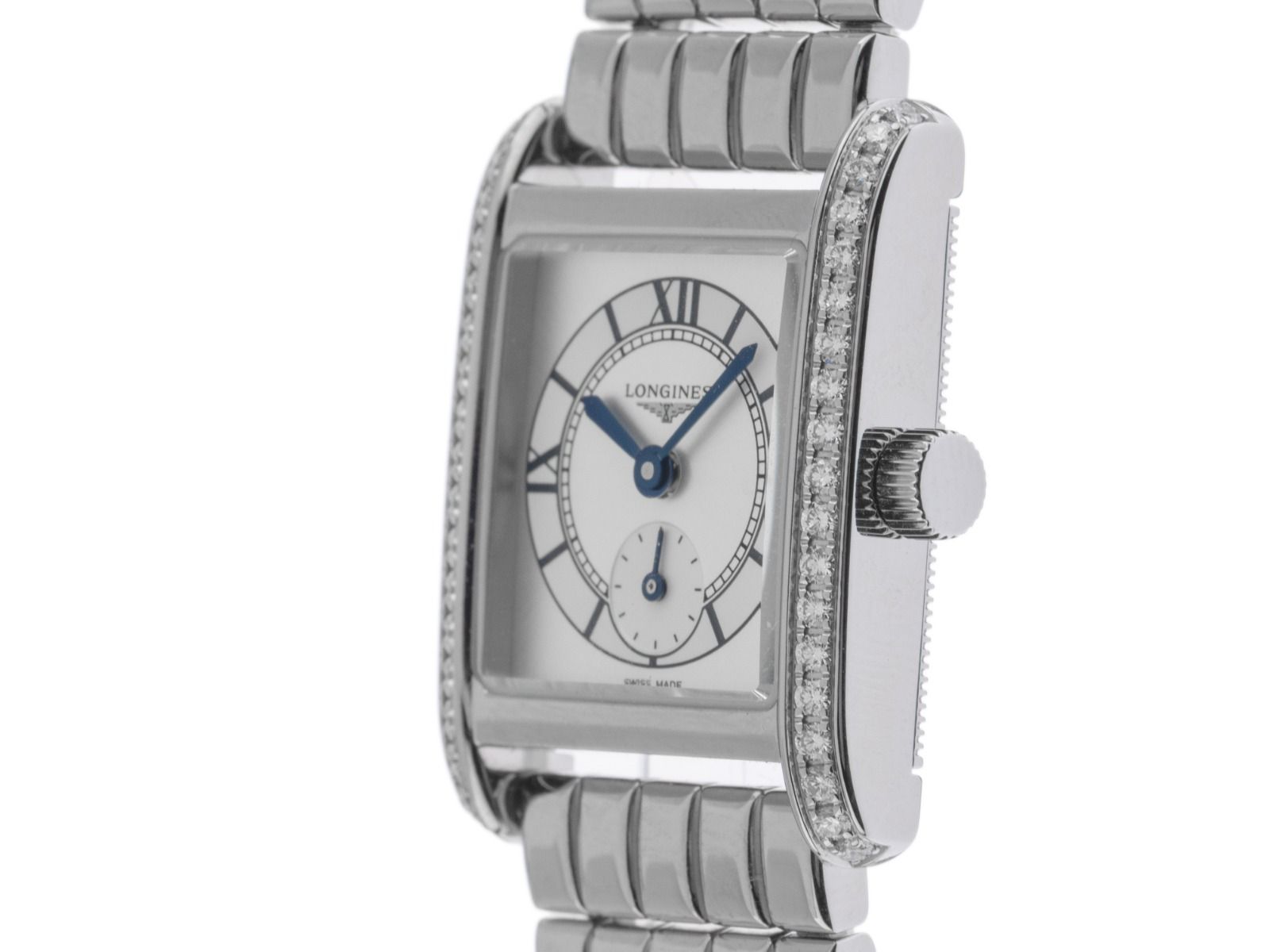 Gehäuse Edelstahl poliert mit Diamanten besetzt, rechteckig, Gehäusemaße ohne Krone (L x B x H) 29 x 21,5 x 6,9mm. Lünette Edelstahl glatt und poliert mit Diamanten besetzt. Armband Edelstahl poliert, Doppelsicherheitsfaltschließe Edelstahl mit Hersteller-Logo. Zifferblatt silberfarben mit schwarzen römischen Ziffern und gebläuten Zeigern. Uhrwerk quarzgesteuert. Anzeige von Stunde und Minute über Zeiger aus der Mitte, kleine Sekunde mit Sekundenstopp zur sekundengenauen Einstellung der Uhrzeit bei 6 Uhr. Saphirglas kratzfest. Krone geriffelt. Boden Edelstahl graviert. Gewicht der Uhr inklusive Armband 72g, Länge des Armbandes inklusive Gehäuse 175mm. Wasserdicht bis 3 ATM. Referenznummer: L5.200.0.75.6, ID: ST610251001125H-4250, Artikelnummer: 10000083516. Original Longines Box mit Umkarton und Garantie Papiere von 2025, Full Set. Ungetragen. Lieferzeit sofort.