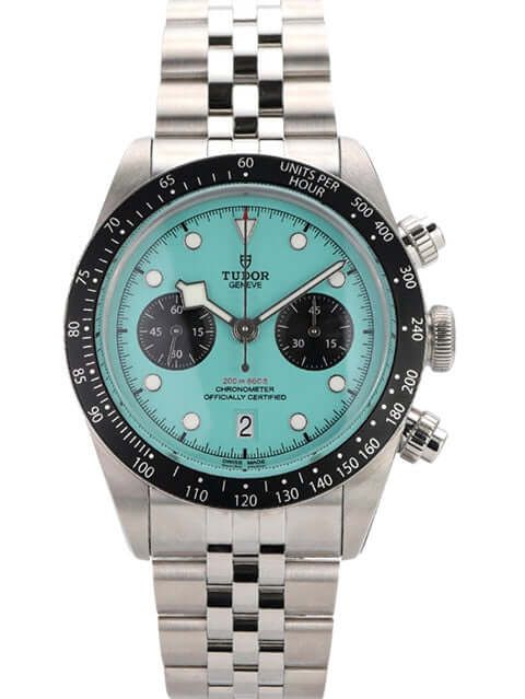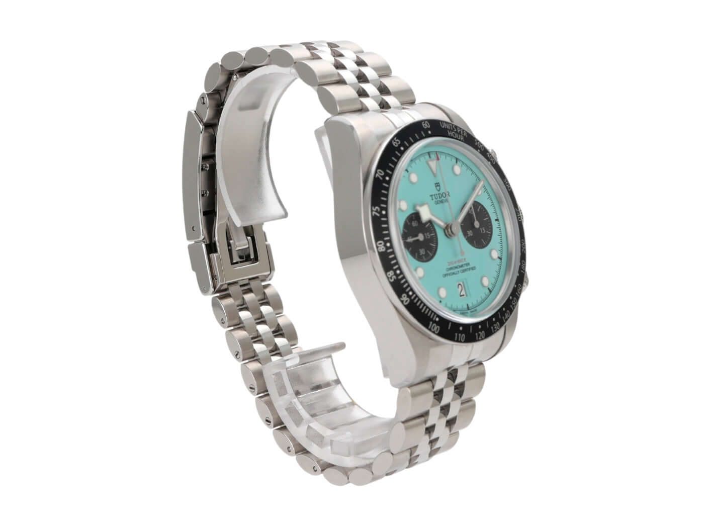 Case made of polished and satin-finished stainless steel, case diameter 41 mm, case height 12.7 mm, stainless steel bezel with 60-minute scale and luminous dot, unidirectional rotating, stainless steel bracelet with folding clasp, turquoise dial with applied luminous indices, black subdials, luminous hands, automatic movement, Tudor manufacture caliber MT5813, 70 hours power reserve, chronograph, date, chronometer, sapphire crystal, screw-down crown, stainless steel case back screwed and engraved, water-resistant up to 20 bar.