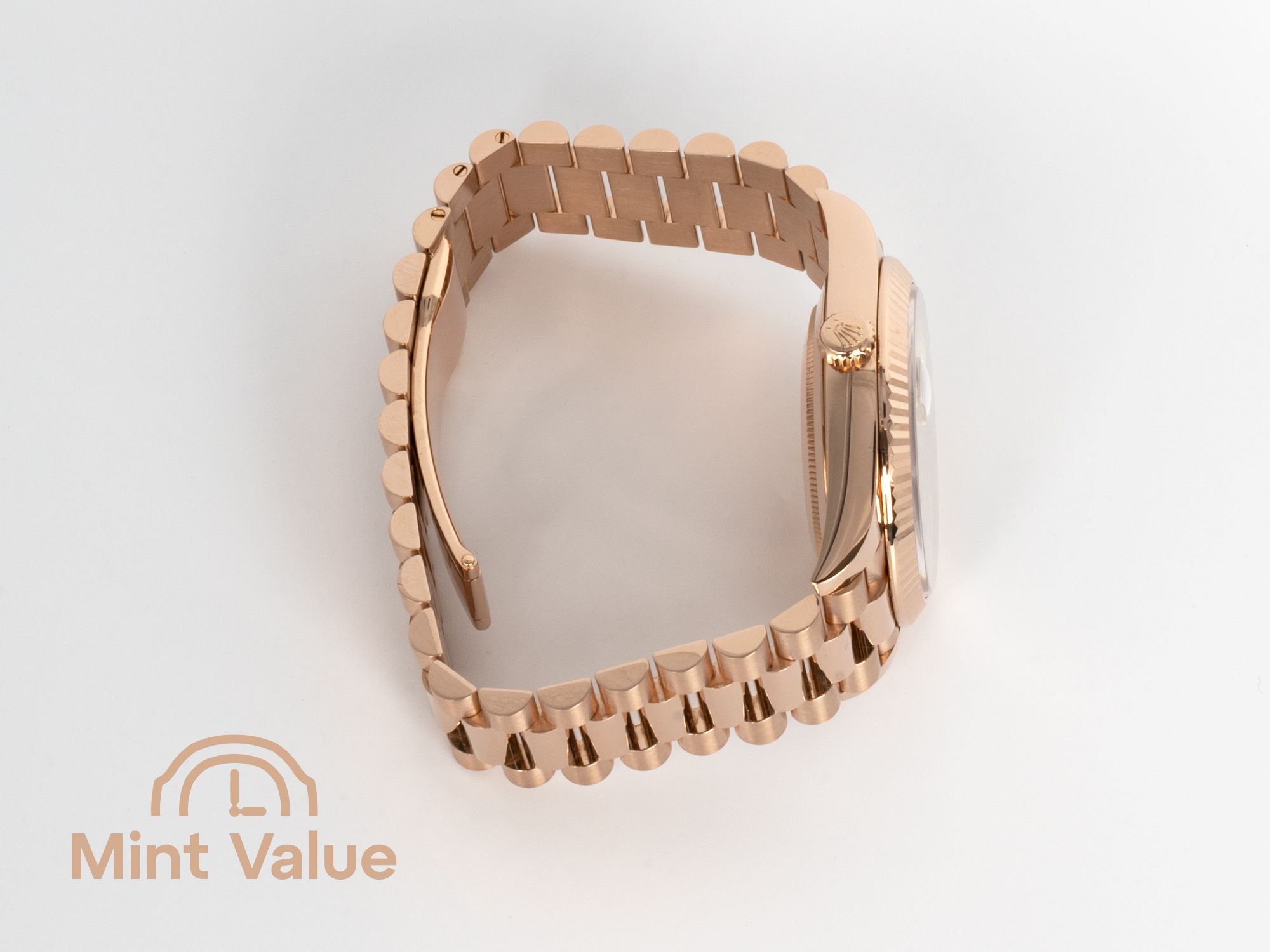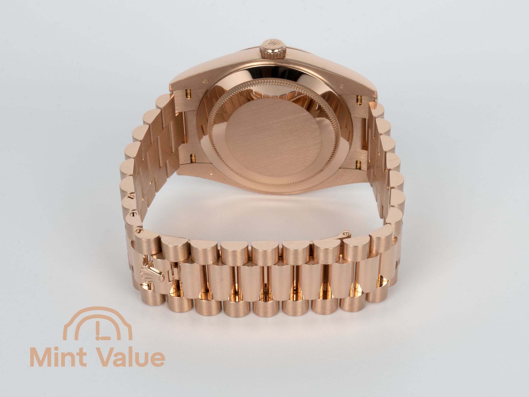 The green dial has become one of the most recognizable and sought-after colorways in the Day-Date lineage. Its radiant hue captures light differently from every angle, highlighting the meticulous sunray finish and the natural warmth of Everose gold.