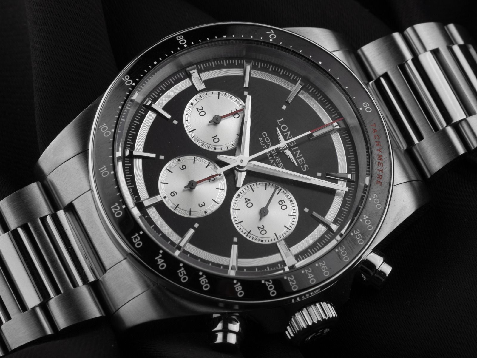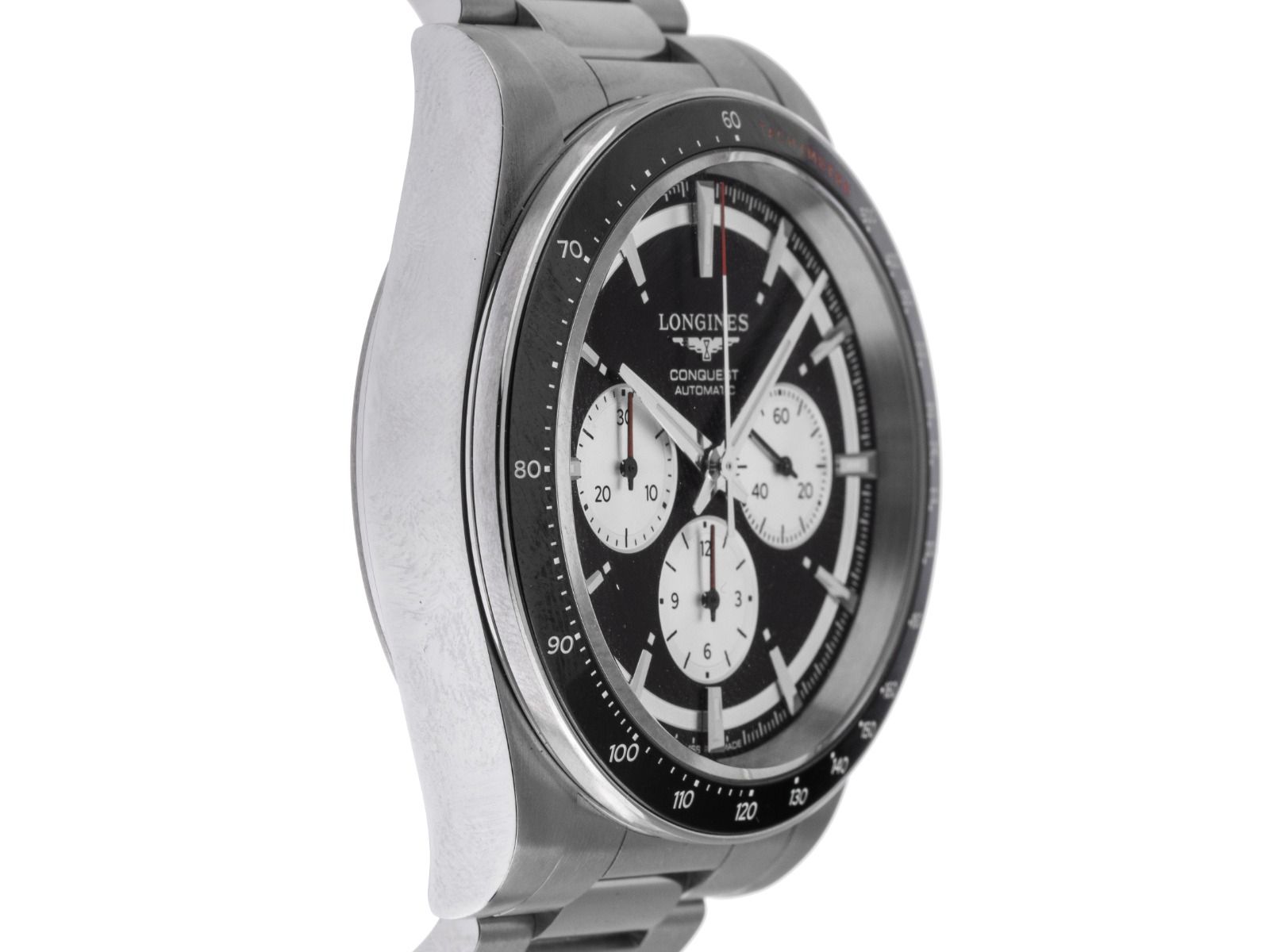 Gehäuse Edelstahl poliert und satiniert, Gehäusedurchmesser ohne Krone 42mm, Gehäusehöhe 14,3mm. Lünette Edelstahl mit schwarzem Keramik Inlay und gravierter Tachymeter-Skala. Armband Edelstahl poliert und satiniert, Doppelsicherheitsfaltschließe Edelstahl mit Hersteller-Logo. Zifferblatt schwarz mit aufgesetzten Leuchtindexen und polierten Leuchtzeigern. Uhrwerk Automatik, Chronograph, Longines Kaliber L898 mit 37 Edelsteinen, Gangreserve ca. 59 Stunden. Anzeige von Stunde und Minute über Zeiger aus der Mitte, kleine Sekunde mit Sekundenstopp zur sekundengenauen Einstellung der Uhrzeit bei 3 Uhr. Saphirglas kratzfest. Krone verschraubbar mit Flankenschutz und Hersteller-Logo. Boden Edelstahl verschraubt und graviert mit Saphirglas Sichtfenster. Gewicht der Uhr inklusive Armband 169g, Länge des Armbandes inklusive Gehäuse 195mm. Wasserdicht bis 10 ATM. Referenznummer: L3.835.4.52.6, ID: ST610250401125H-4200, Artikelnummer: 10000083532. Original Longines Box mit Umkarton und Garantie Papiere von 2025, Full Set. Ungetragen. Lieferzeit sofort.