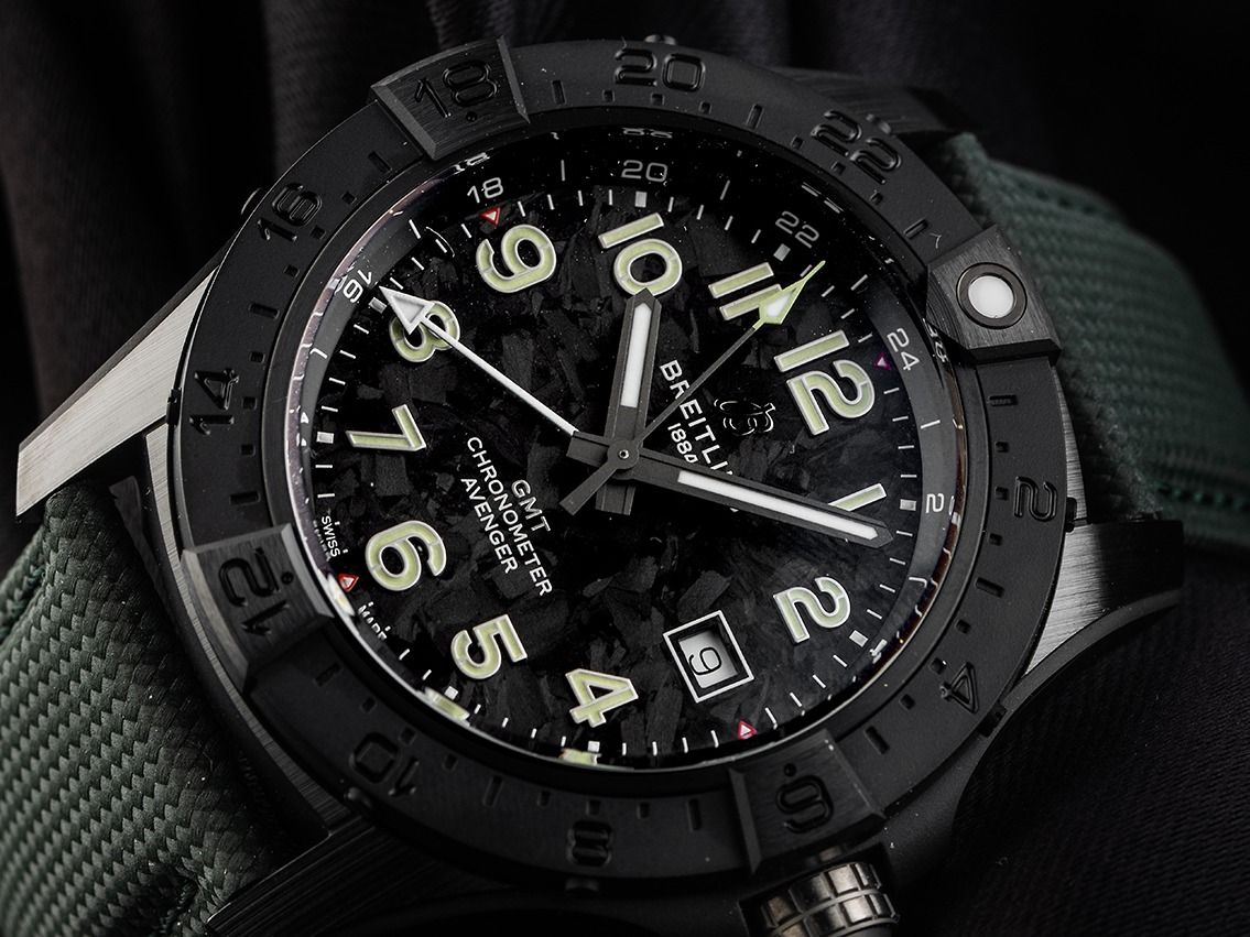 Breitling Avenger GMT Night Mission Keramik Black Automatik Armband Textil Leder Faltschließe