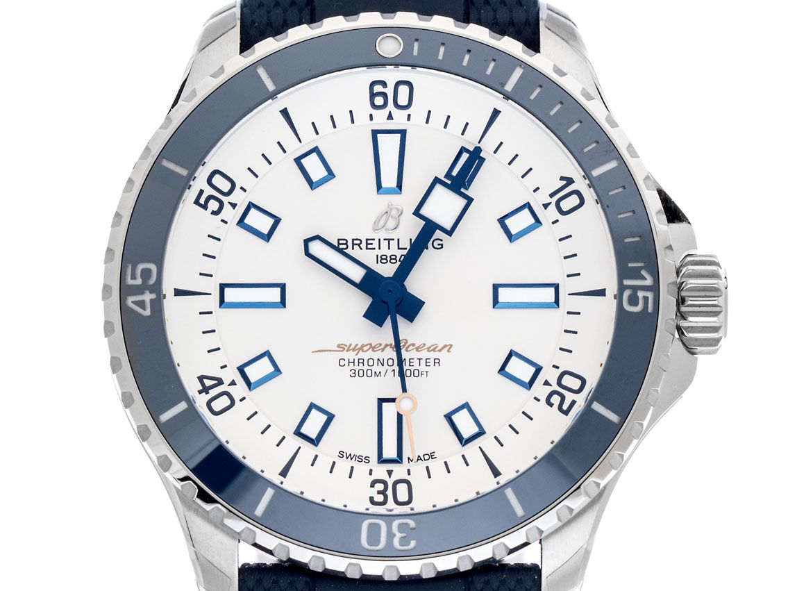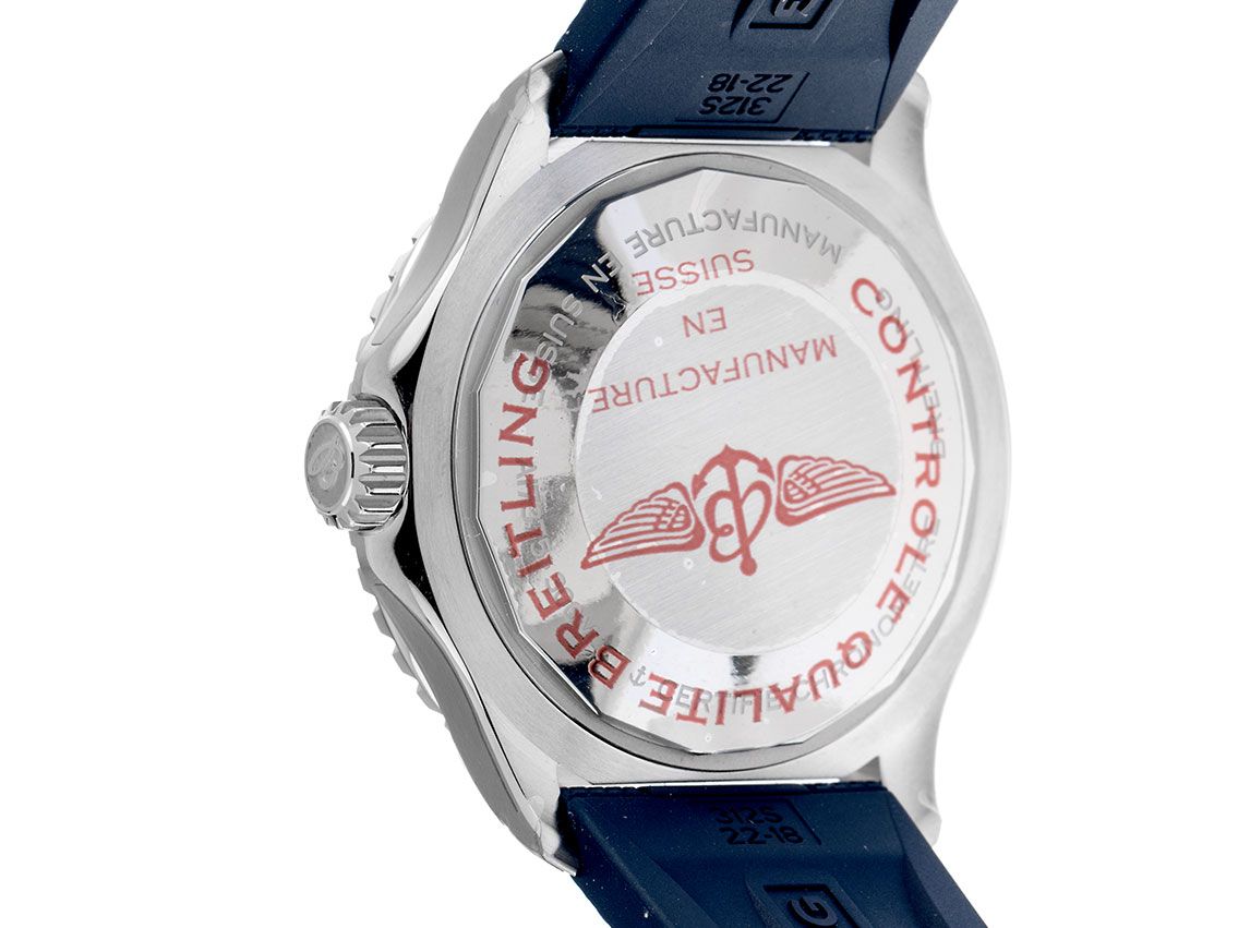 Gehäuse Edelstahl poliert und satiniert, Gehäusedurchmesser ohne Krone 42mm, Gehäusehöhe 12,5mm. Lünette Edelstahl geriffelt mit blauem Keramik Inlay und 60-Minuten Skala, einseitig drehbar. Armband Kautschuk blau, Anstoßbreite 22mm, Sicherheitsfaltschließe Edelstahl mit Hersteller-Logo. Zifferblatt silberfarben mit gebläuten Leuchtindexen und gebläuten Leuchtzeigern. Uhrwerk Automatik, Chronometer mit Zeugnis, Kaliber Breitling 17 mit 26 Edelsteinen, Gangreserve ca. 38 Stunden. Anzeige von Stunde, Minute und Sekunde über Zeiger aus der Mitte mit Sekundenstopp zur sekundengenauen Einstellung der Uhrzeit. Saphirglas kratzfest, doppelseitig entspiegelt und bombiert. Krone verschraubbar mit Flankenschutz und Hersteller-Logo. Boden Edelstahl verschraubt und graviert. Gewicht der Uhr inklusive Armband 133g. Wasserdicht bis 30 ATM. Referenznummer: A17375E71G1S1, ID: ST116073861225H-5450, Artikelnummer: 10000083591. Original Breitling Box und Garantie Papiere von 2025, Full Set. Ungetragen. Lieferzeit sofort.