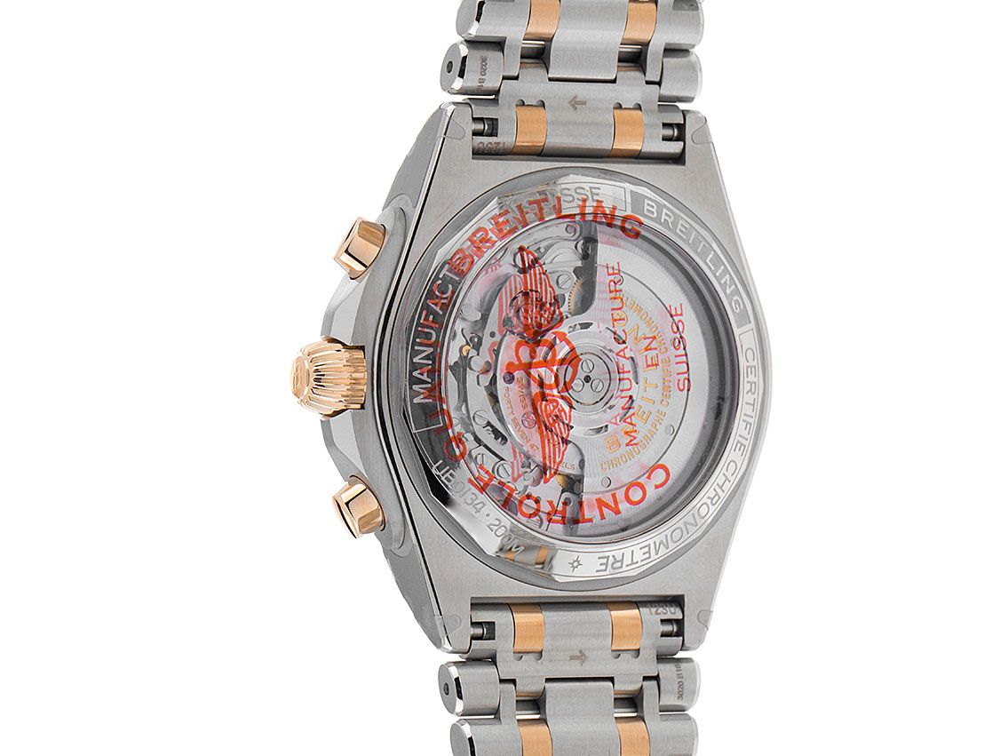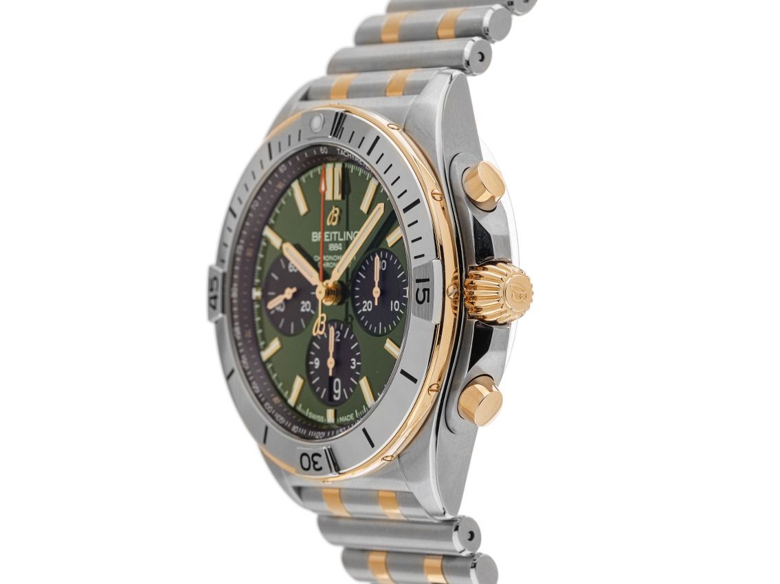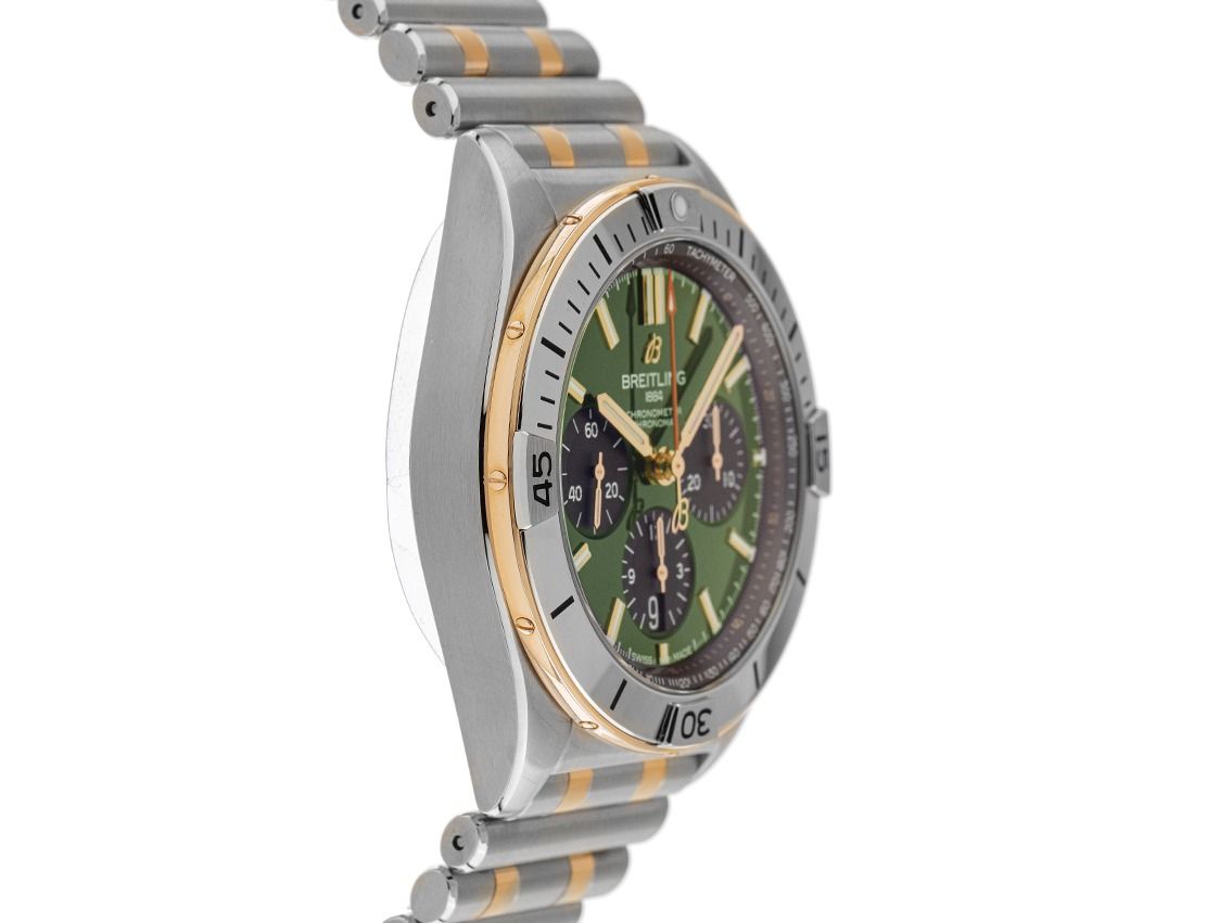 Gehäuse Edelstahl satiniert und poliert, Gehäusedurchmesser ohne Krone 42mm, Gehäusehöhe 15,1mm. Lünette Edelstahl / 18kt Roségold poliert mit 60-Minuten Skala und satinierten Reitern sowie Leuchtpunkt, einseitig drehbar mit Sperre. Armband Edelstahl / 18kt Roségold satiniert und poliert, verdeckte Sicherheitsfaltschließe Edelstahl mit Hersteller-Logo. Zifferblatt grün mit schwarzen Hilfszifferblättern, aufgesetzten roségoldenen Leuchtindexen und roségoldenen Leuchtzeigern. Uhrwerk Automatik, Chronograph, Chronometer mit Zeugnis, Breitling Manufakturkaliber B01 mit 47 Edelsteinen, Gangreserve ca. 70 Stunden. Anzeige von Stunde und Minute über Zeiger aus der Mitte, kleine Sekunde mit Sekundenstopp zur sekundengenauen Einstellung der Uhrzeit bei 9 Uhr, Datumsanzeige mit Schnellverstellung bei 6 Uhr. Saphirglas kratzfest und gewölbt, doppelseitig entspiegelt und bombiert. Krone verschraubbar mit Flankenschutz und Hersteller-Logo. Boden Edelstahl verschraubt und graviert mit Saphirglas Sichtfenster. Gewicht der Uhr inklusive Armband 204g, Länge des Armbandes inklusive Gehäuse 210mm. Wasserdicht bis 20 ATM. Referenznummer: UB0134131L1U1, ID: ST1160178081225H-13200, Artikelnummer: 10000083599. Original Breitling Box mit Umkarton und Garantie Papiere von 2025, Full Set. Ungetragen. Lieferzeit sofort.