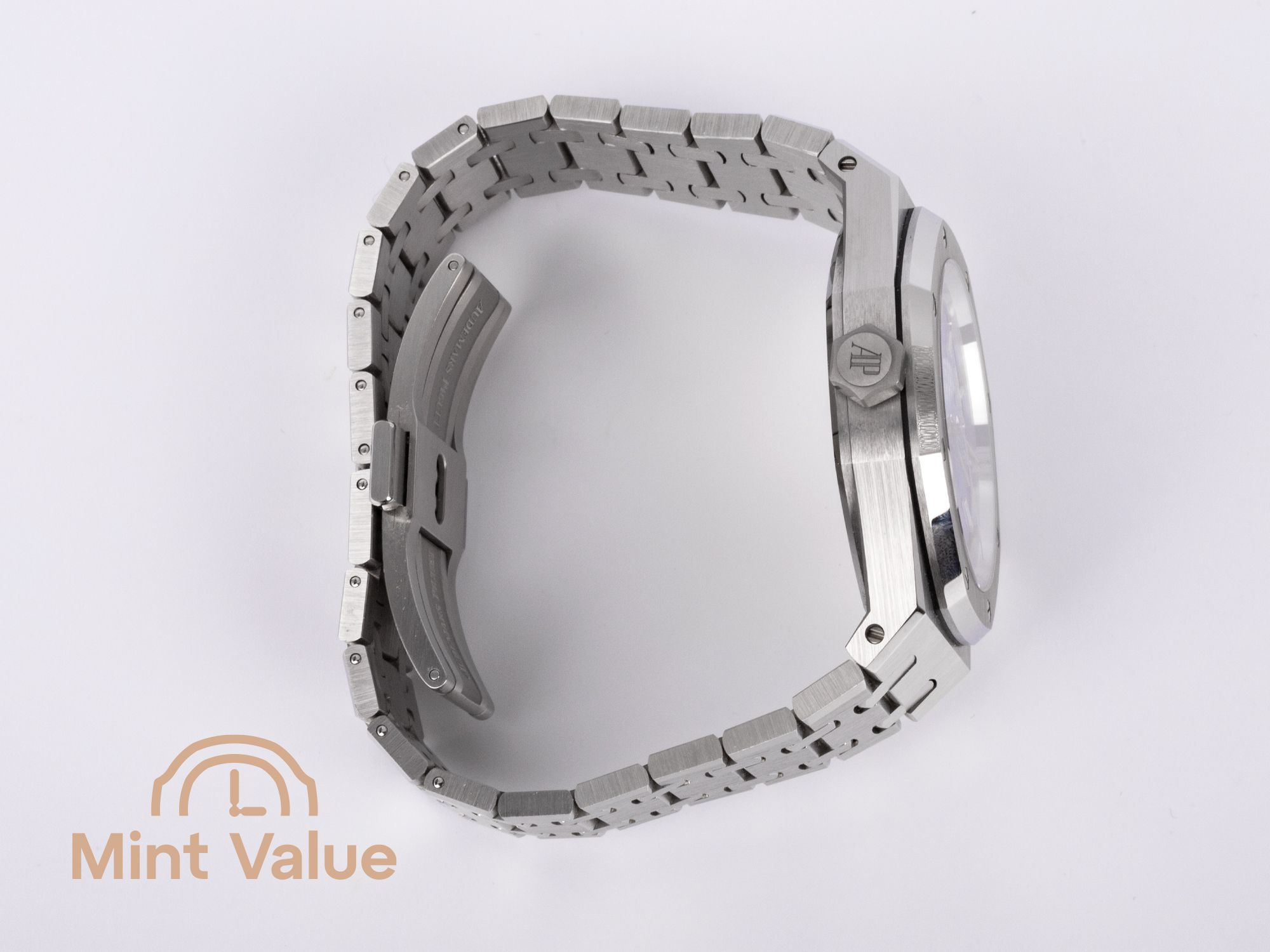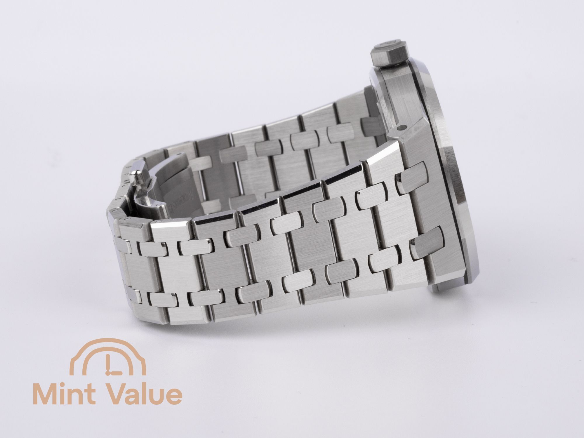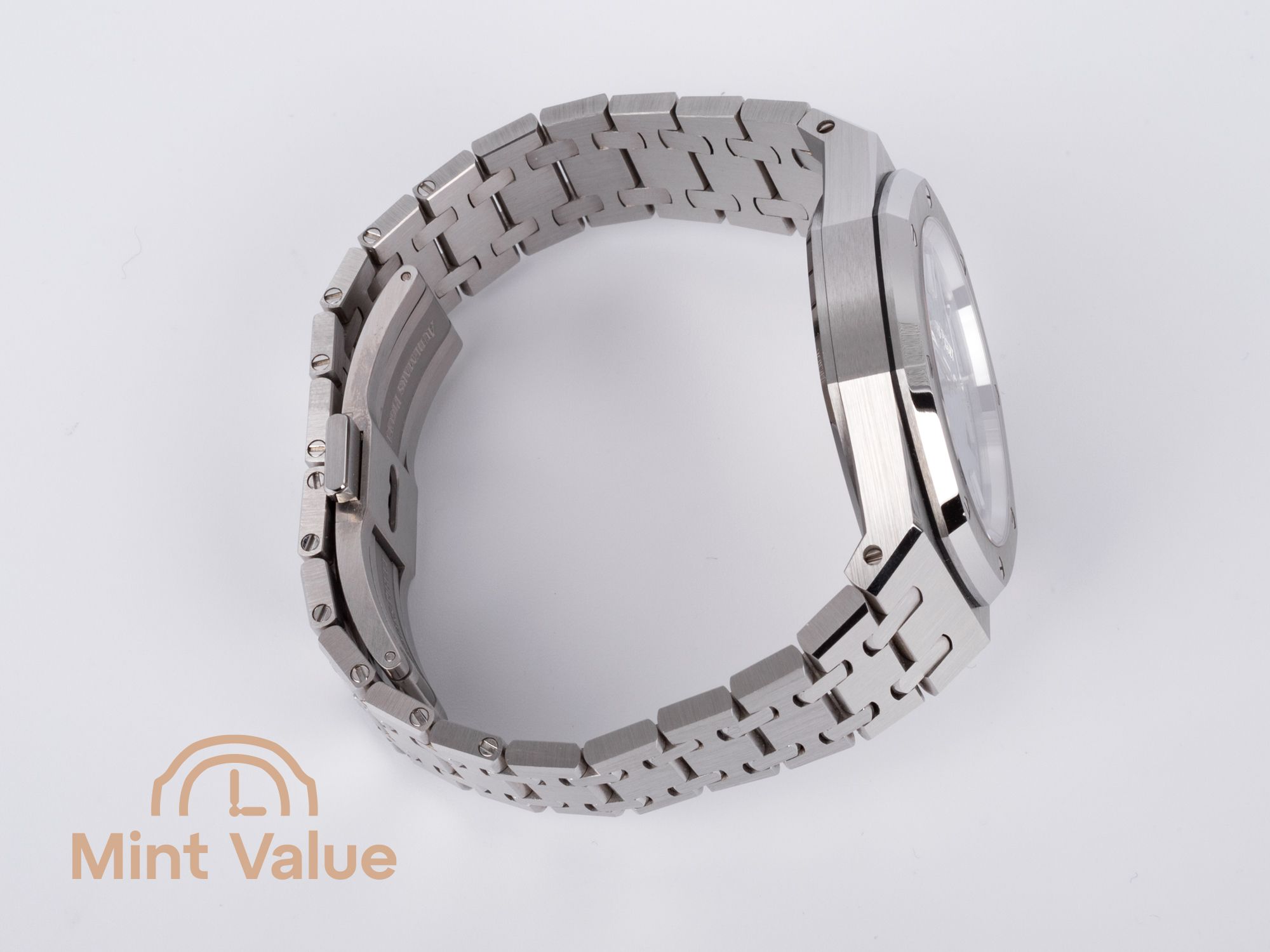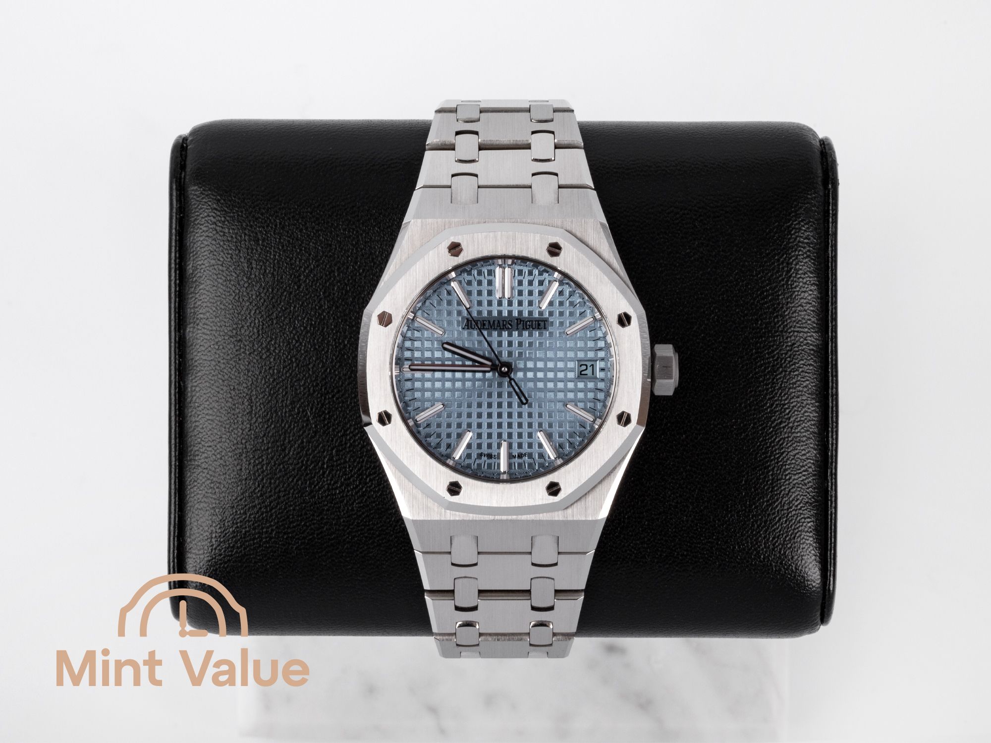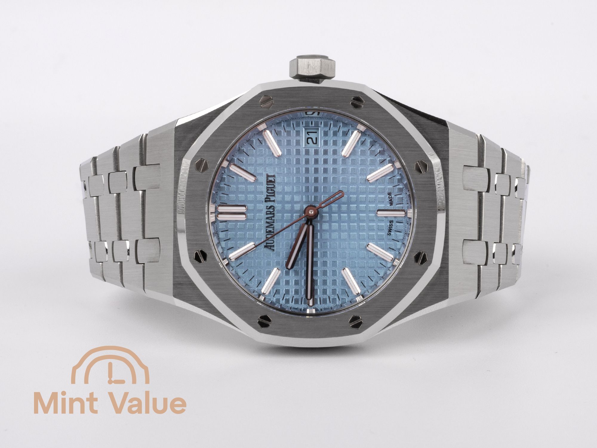 As part of the refreshed Royal Oak collection, this reference stands out by offering a modern interpretation of the model’s heritage — in a refined size and with a distinctive dial color. Its combination of iconic design, modern movement, and ice-blue dial makes it a compelling choice for collectors who value both wearability and legacy.