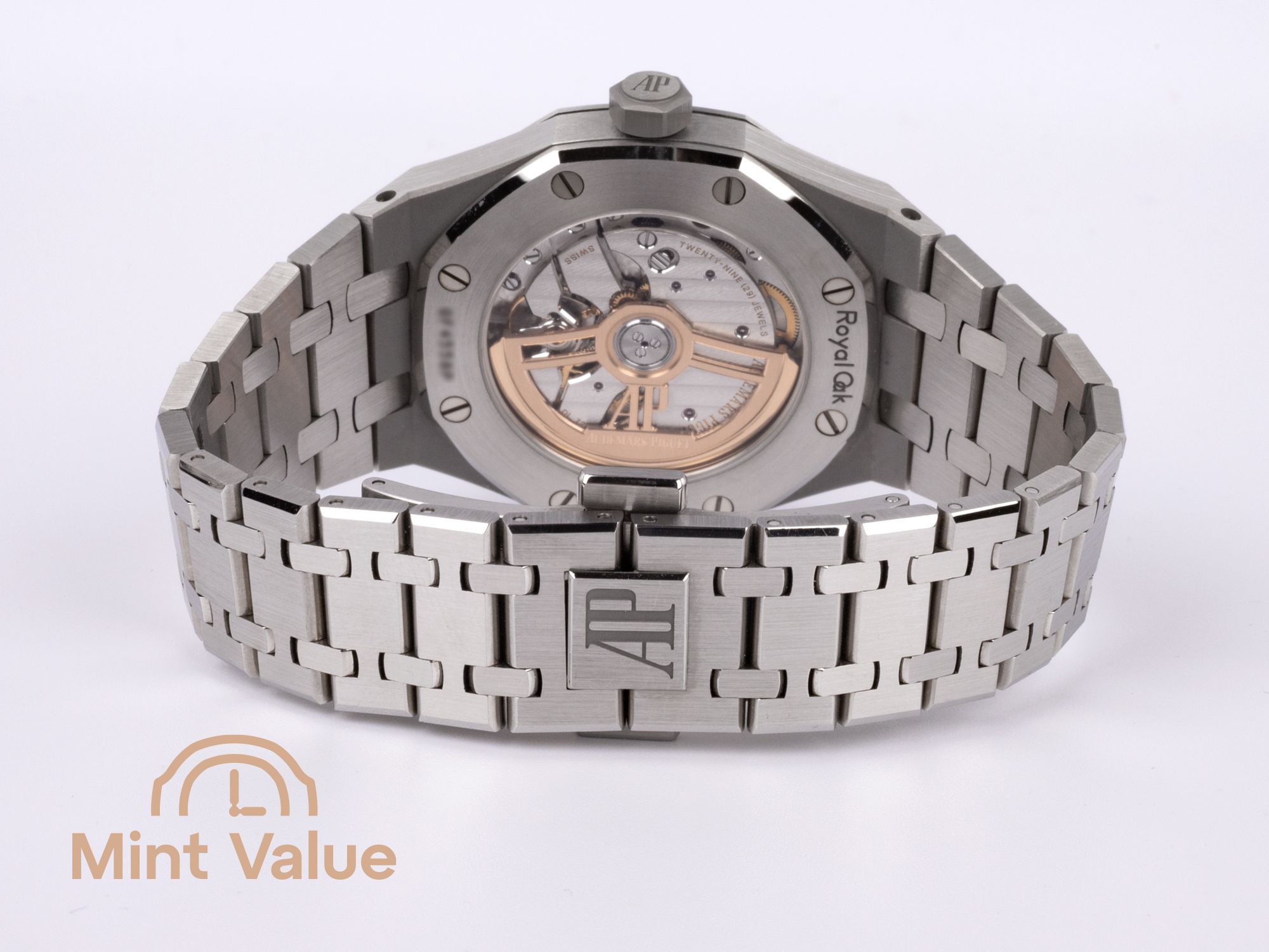 The 37 mm steel case maintains the recognizable octagonal bezel and integrated bracelet design that define the Royal Oak lineage — ideal for those seeking a versatile size that fits many wrists.