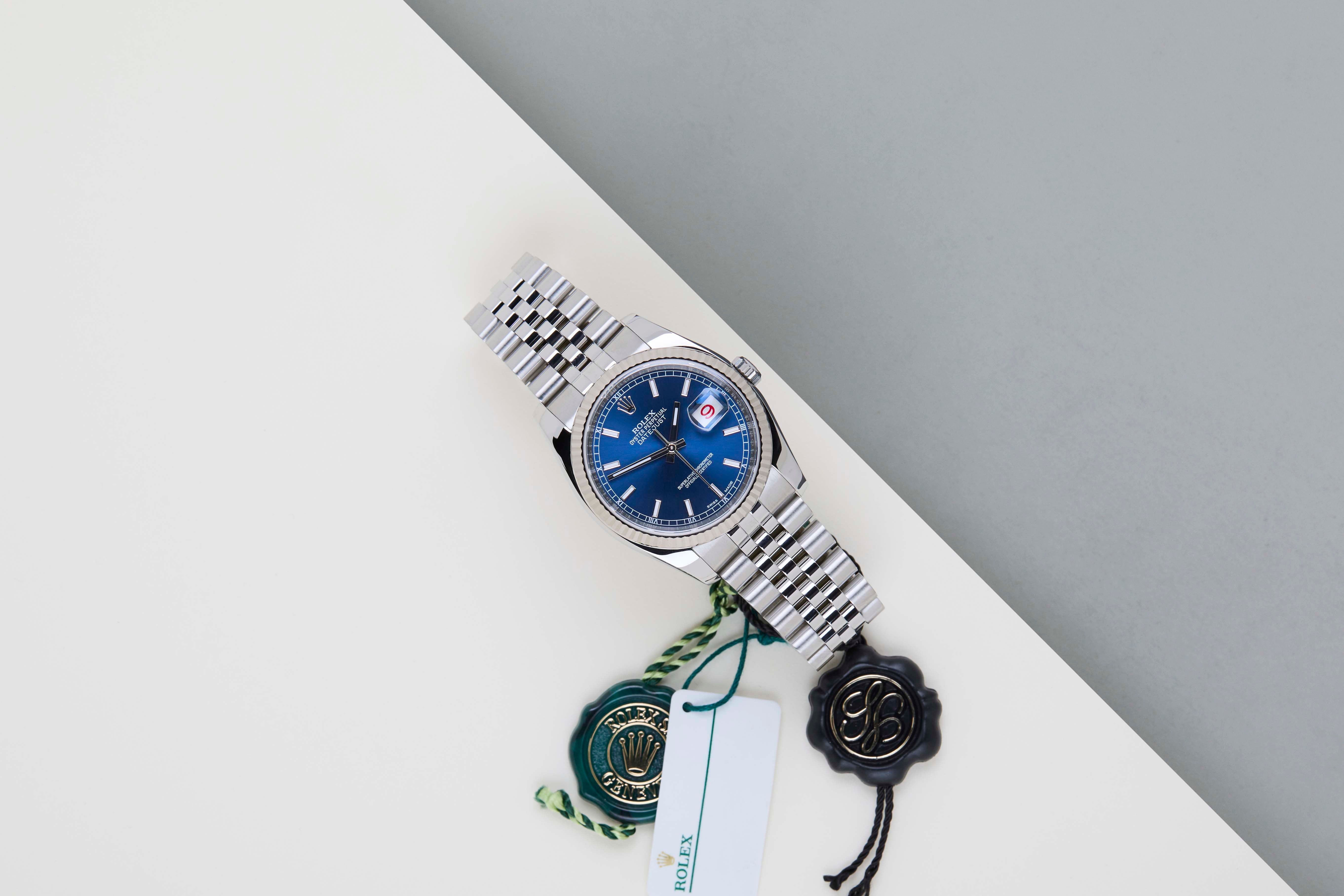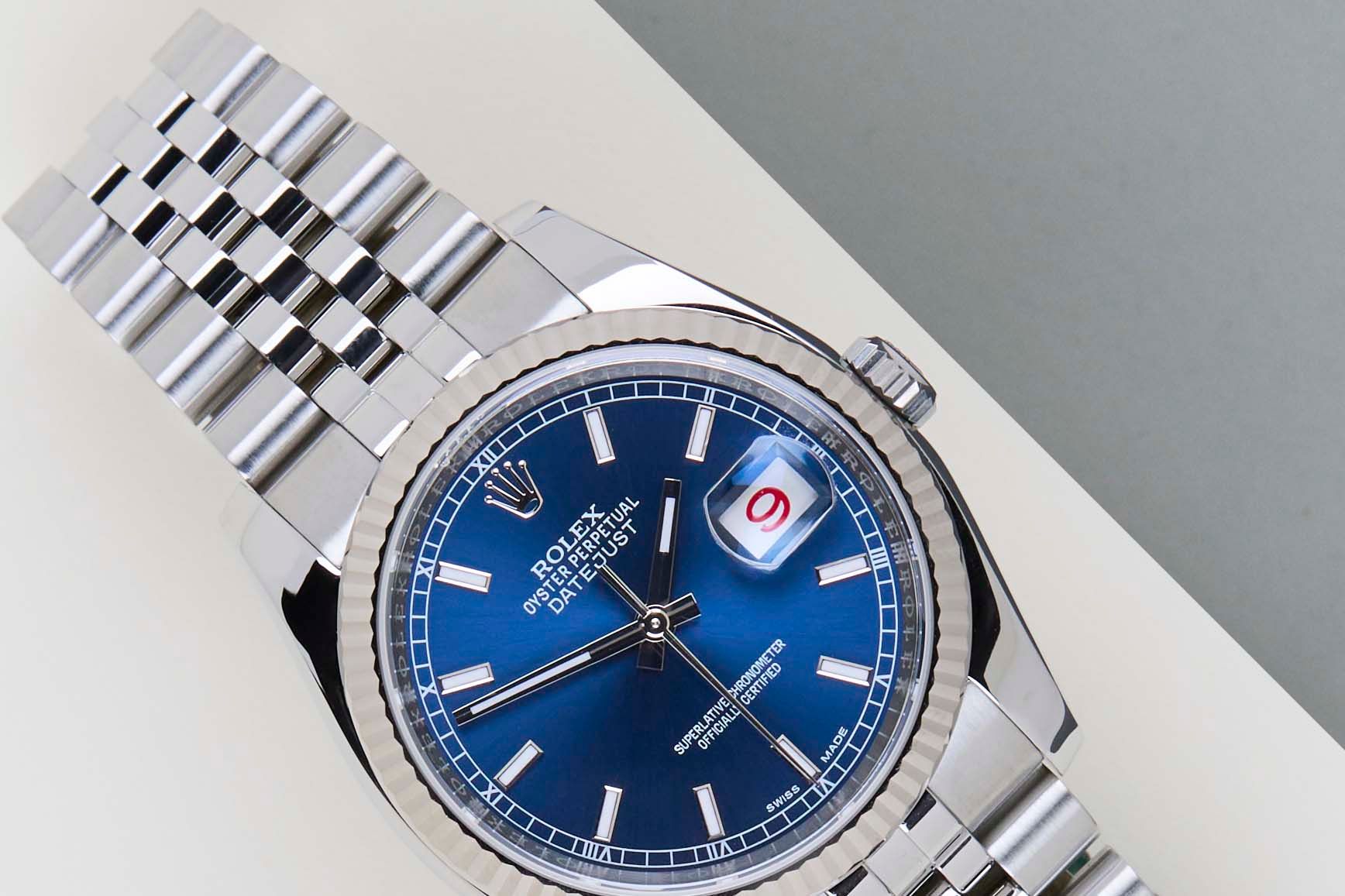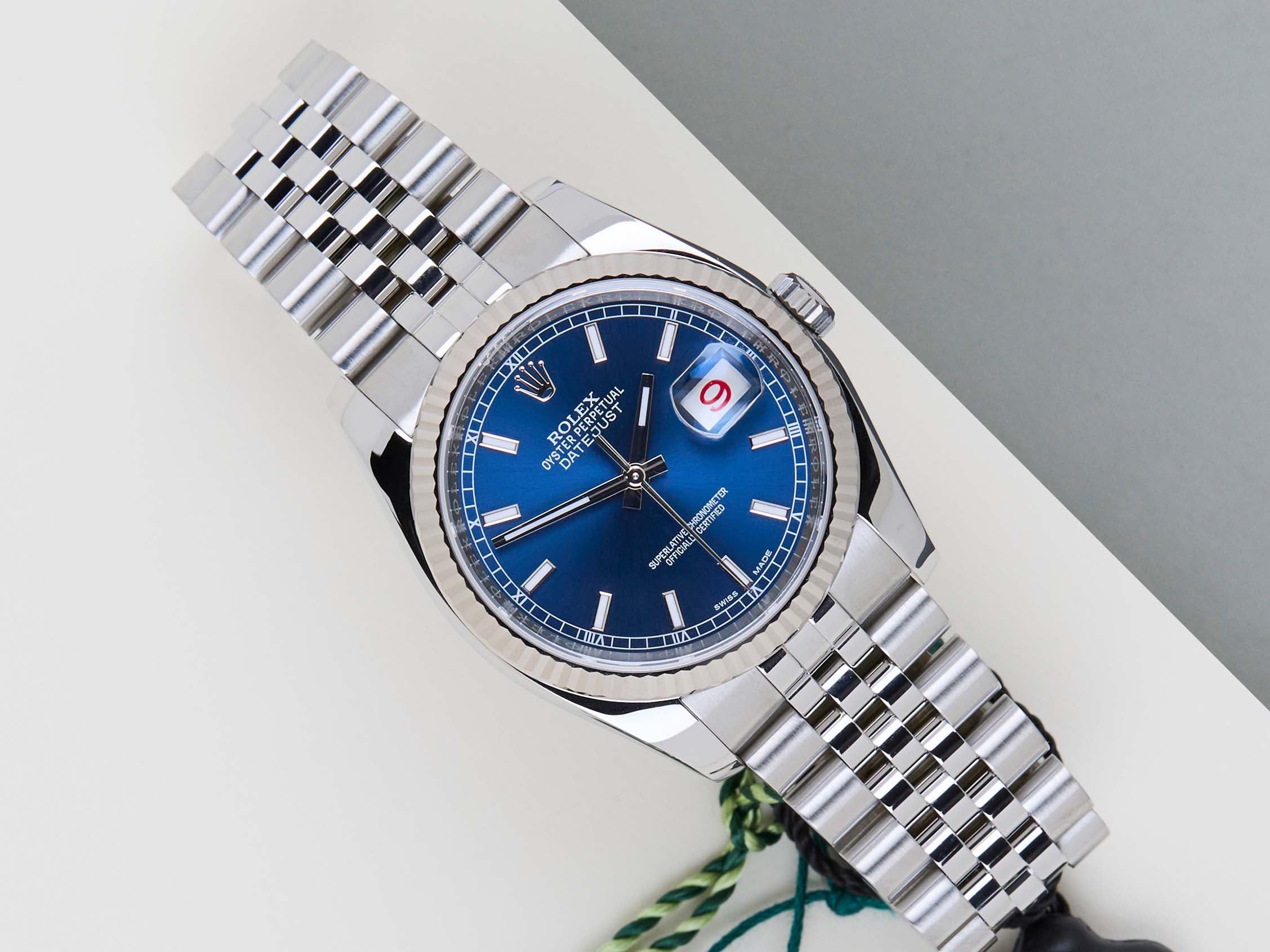 Full Set | European Warranty Card (LC170 - Italy) | Roulette Date | Including Rolex White Tag Rolex introduced the original Datejust in 1945 to celebrate the company's 40th anniversary. Due to the various case sizes and materials, the Datejust has been ingrained in Rolex's history and remains incredibly popular for 75 years.This Rolex Datejust 'Blue Dial' was sold for the first time in July 2016.This Datejust is made of a combination of 18k White Gold and stainless steel and is fitted with a Jubilee bracelet which conceals the Crown clasp. The timepiece features a classic Blue Dial.This Rolex Datejust 36 is in Mint condition and comes with the original Rolex Warranty Papers and Box. Furthermore, the watch has been serviced by our watchmaker, and therefore it comes with one year of Steiner warranty.