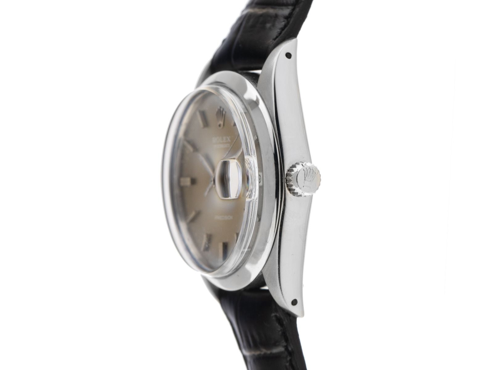 Gehäuse Edelstahl poliert und satiniert, Gehäusedurchmesser ohne Krone 35mm, Gehäusehöhe 11,4mm. Lünette Edelstahl glatt und poliert. Rolex Armband Krokoleder schwarz mit Ziernaht, Anstoßbreite 19mm, Rolex Stiftschließe Edelstahl mit Hersteller-Logo. Zifferblatt grau mit aufgesetzten weißgoldenen Indexen und weißgoldenen Zeigern. Uhrwerk Handaufzug, Rolex Manufakturkaliber 1225 mit 17 Edelsteinen. Anzeige von Stunde, Minute und Sekunde über Zeiger aus der Mitte, Datumsanzeige bei 3 Uhr, open 6/9 (offene 6 und 9 in der Datumsanzeige). Plexiglas. Krone verschraubbar mit Hersteller-Logo. Boden Edelstahl verschraubt. Gewicht der Uhr inklusive Armband 45g. Referenznummer: 6694, Baujahr: 1969, Gehäusenummer: 2046XXX, ID: P180638001125H-4900, Artikelnummer: 10000082895. Mit Gangkontrolle und kompletter äußerlicher Aufarbeitung von November 2025. Original Rolex Box mit Umkarton und Beschreibung, Übersetzungsheft, Ledermäppchen sowie Watchregister Auszug von November 2025, The Watch Register Zertifikat / ohne Eintrag (Internationale Datenbank für verlorene oder gestohlene Uhren). Superschnäppchen, sehr seltenes Sammlerstück. Sehr gut. Lieferzeit sofort.
