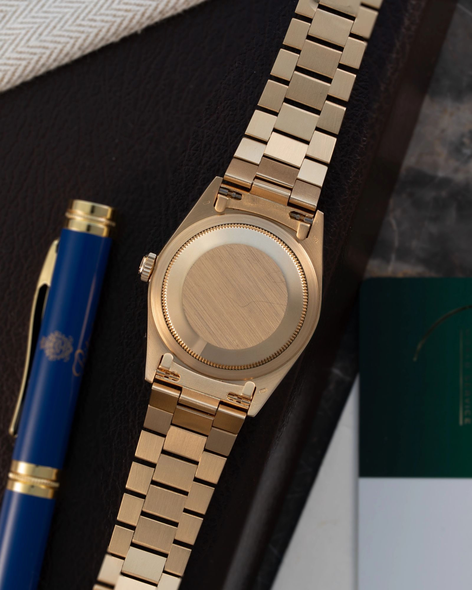 This iconic white gold Rolex reference 18238 “President” Day Date just came back from a full service at Rolex. The real center-piece of this watch is the very rare Lapis Lazuli stone dial with diamond hour markers. The 18k yellow gold Oyster-case and “President-bracelet” with concealed clasp are in great condition. Both have been slightly polished, of course preserving the original shape. The bracelet has some very minor stretch. All hallmarks, the reference number and the case number are clear and crisp, indicating the production year of +/- 1989 (L743XXX). Inside the Oyster case, it houses Rolex’s caliber 3155. The mechanism, beating at a rate of 28,800 A/h is Rolex’s seventh generation Day-Date movement, featuring a highly-practical, double-quick-set date function. This watch comes as a full set, with original Rolex box, warranty paper and service card.