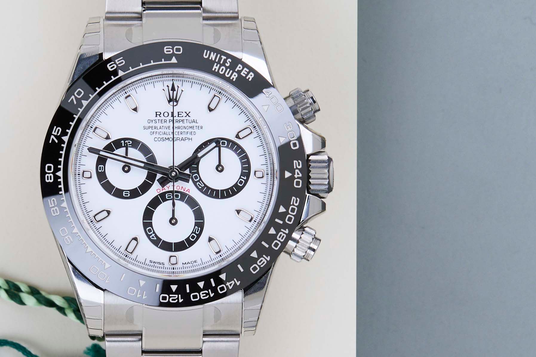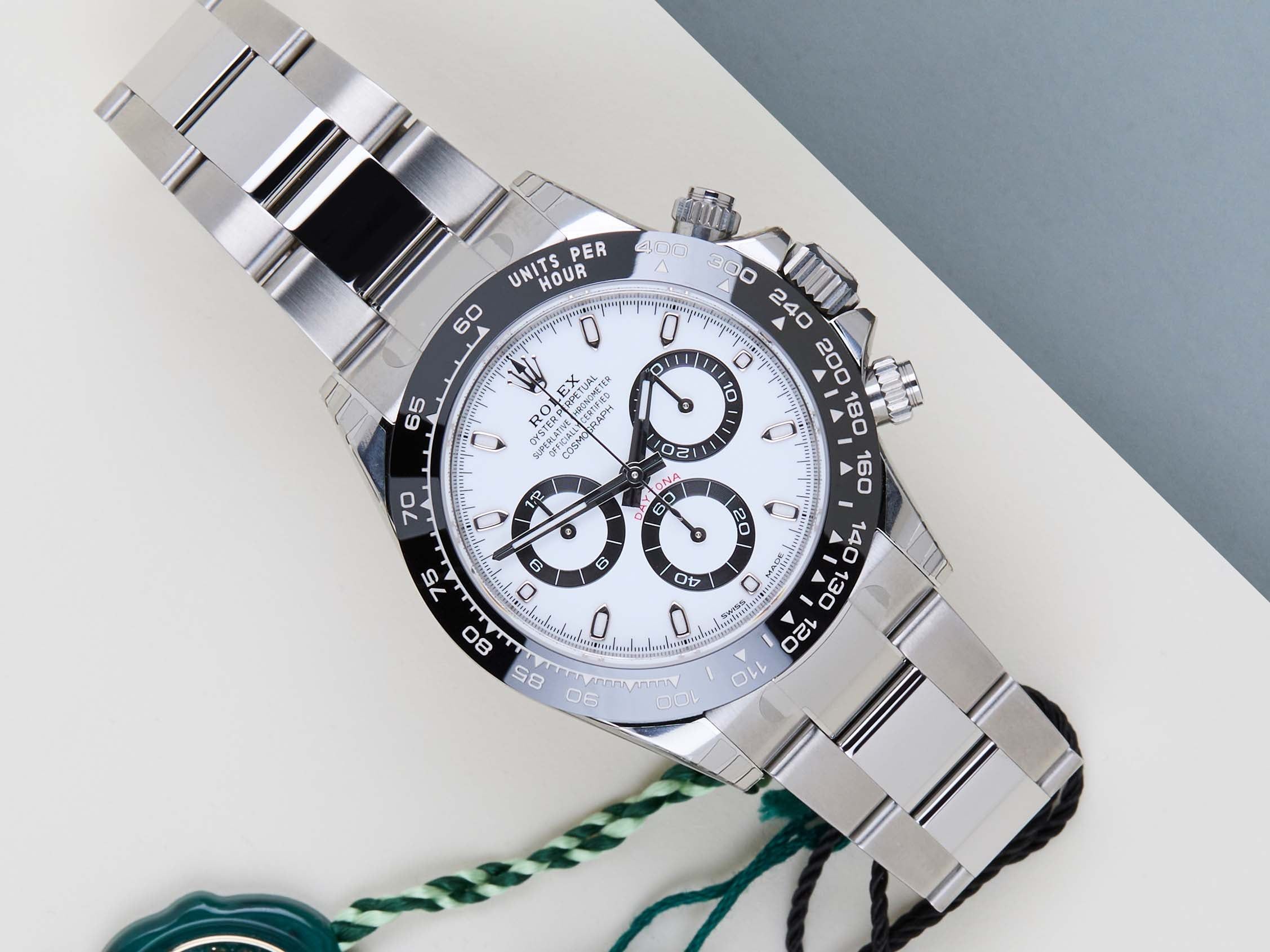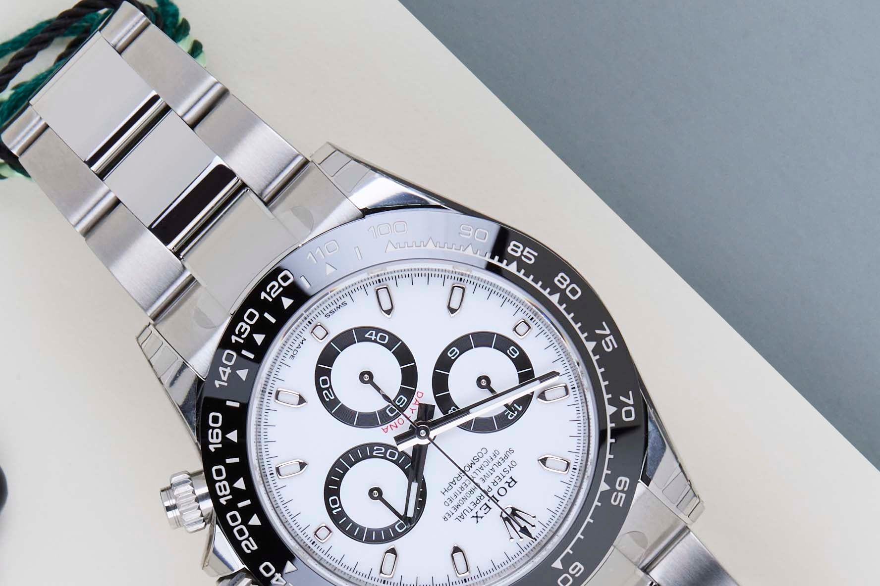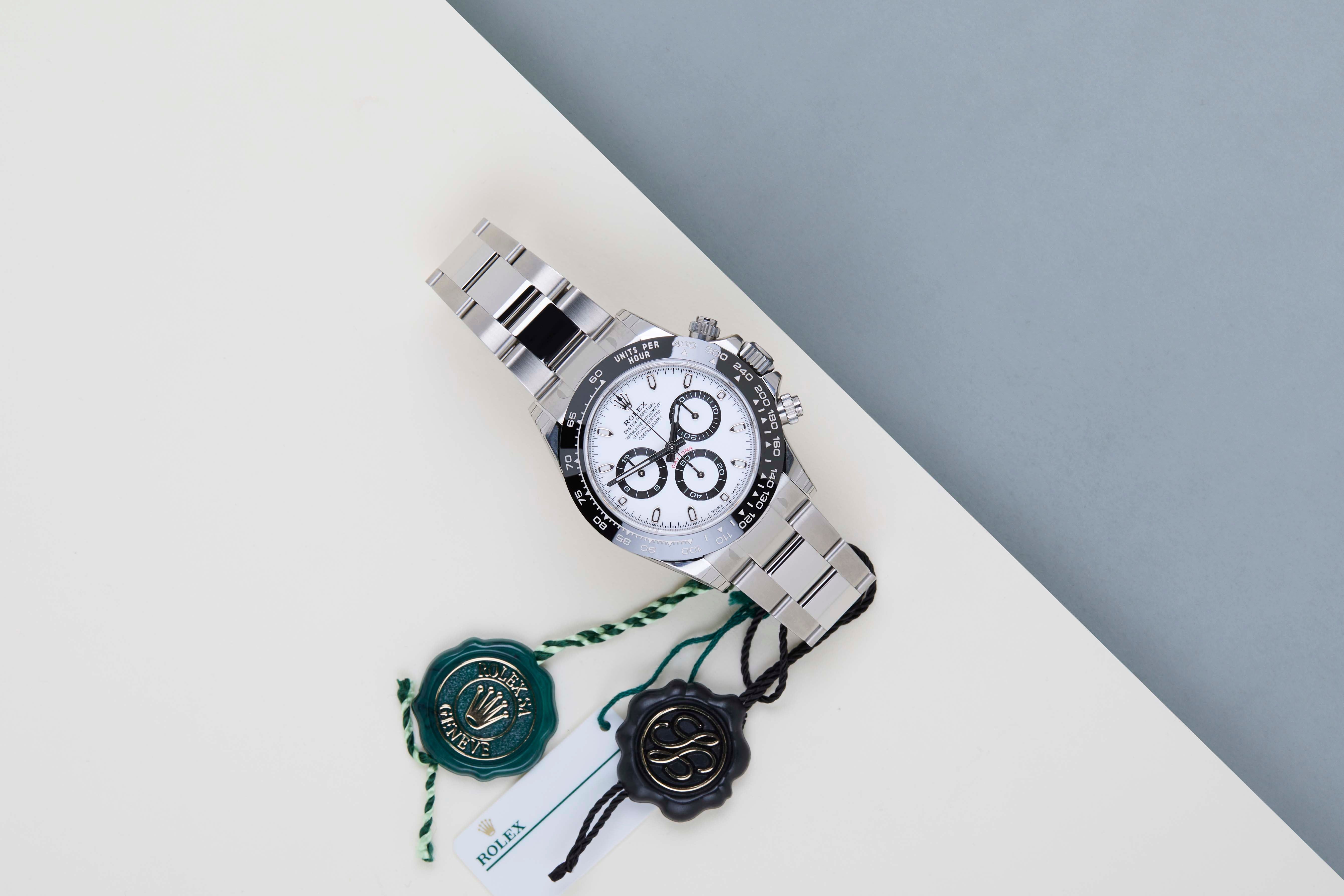 New & Unworn | NOS (New Old Stock) | Full Set | Full-Stickered | Including White TagThe Rolex Cosmograph Daytona is considered one of the most popular models in the world. The reasons for this vary from the watch's history in timekeeping, racing and the love it evoked amongst timepiece enthusiasts, to the huge demand for both the current and the vintage references.This Stunning Rolex Daytona 'White Dial - Panda' was sold for the first time in October 2020.This Rolex Daytona is New & Unworn and comes as a full-set with the original Rolex Warranty Card and Original Rolex box. Furthermore, the watch has been checked by our watchmaker, and therefore it comes with one year of Steiner warranty.