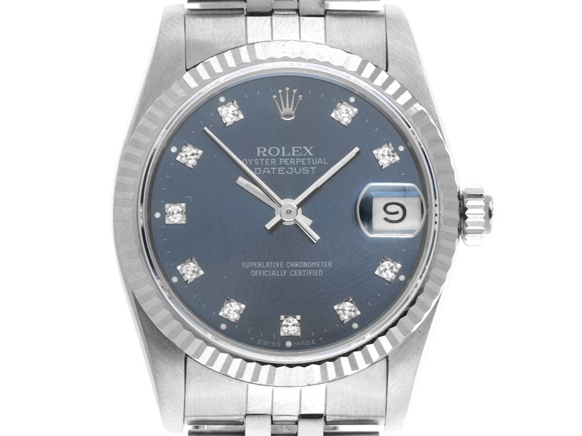 Gehäuse Edelstahl poliert und satiniert, Gehäusedurchmesser ohne Krone 31mm, Gehäusehöhe 11,2mm. Lünette 18kt Weißgold geriffelt und poliert. Armband Jubilé Edelstahl poliert und satiniert, Faltschließe Edelstahl mit Hersteller-Logo. Zifferblatt blau mit 10 aufgesetzten Diamantindexen und weißgoldenen Zeigern. Uhrwerk Automatik, Chronometer mit Zeugnis, Rolex Manufakturkaliber 2135 mit 29 Edelsteinen. Anzeige von Stunde, Minute und Sekunde über Zeiger aus der Mitte mit Sekundenstopp zur sekundengenauen Einstellung der Uhrzeit, Datumsanzeige mit Schnellverstellung unter Glaslupe bei 3 Uhr, open 6/9 (offene 6 und 9 in der Datumsanzeige). Saphirglas kratzfest. Krone verschraubbar mit Hersteller-Logo. Boden Edelstahl verschraubt. Gewicht der Uhr inklusive Armband 65g, Länge des Armbandes inklusive Gehäuse 165mm. Referenznummer: 68274, Gehäusenummer: N552XXX, Baujahr: 1991, ID: P2061129001225H-9800, Artikelnummer: 10000083628. Mit Gangkontrolle und kompletter äußerlicher Aufarbeitung von Dezember 2025. Original Rolex Box mit Umkarton und Garantie Papiere ohne Datumseintrag, LC 430 / Singapur sowie Beschreibung, Ledermäppchen, Übersetzungsheft, Rolex Chronometer-Siegel und Watchregister Auszug von Dezember 2025, The Watch Register Zertifikat / ohne Eintrag (Internationale Datenbank für verlorene oder gestohlene Uhren), Full Set. Superschnäppchen, Kapitalanlage mit Wertsteigerungspotential, sehr seltenes Sammlerstück, fast nicht getragen. Sehr guter Zustand. Lieferzeit sofort.
