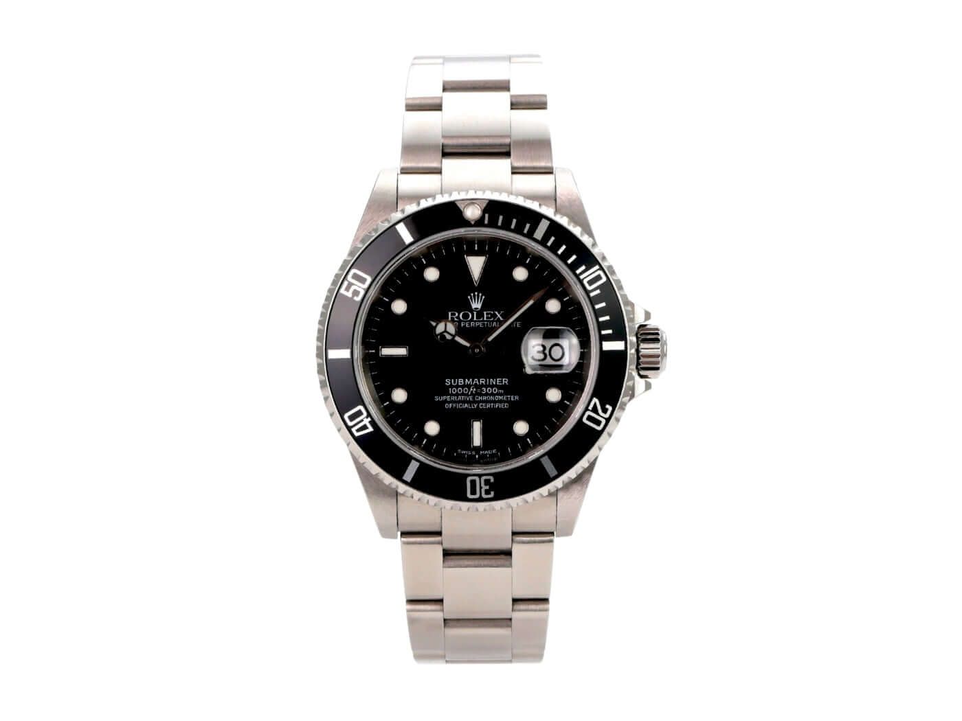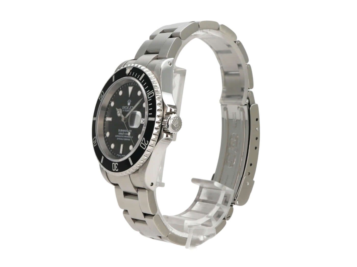 Rolex Submariner Date Ref. 16610 stainless steel LC100 from 2003Case made of polished and satin-finished stainless steel, case diameter 40 mm, stainless steel bezel with ridges and rotatable with black insert, 60-minute scale and luminous dot, Oyster bracelet made of satin-finished stainless steel with folding clasp, black dial with applied luminous indices and luminous dots, automatic movement, Rolex manufacture caliber 3135, frequency 28,800 A/h, power reserve of approx. 48 hours, date display with magnifying glass at 3 o'clock, chronometer, scratch-resistant sapphire crystal, screw-down crown with flank protection, screw-down stainless steel case back, water-resistant up to 30 bar.Used watch, very good condition, complete with box and papers, German delivery from 2003.