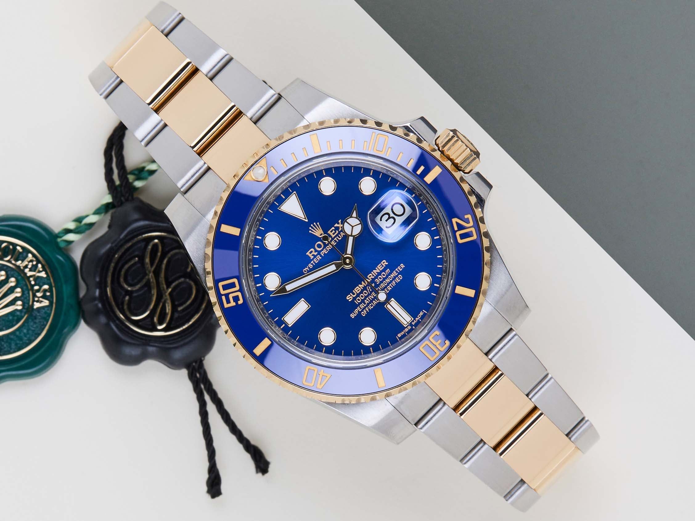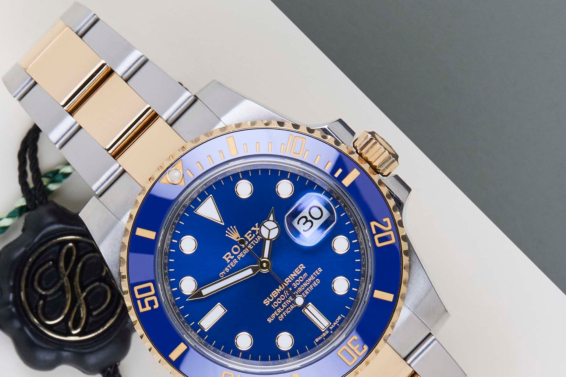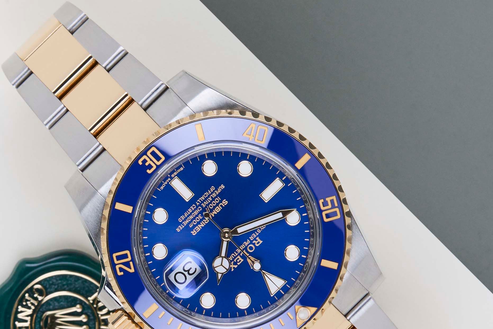 Full-Set When Rolex is mentioned, the Submariner is one of the first models which comes to one’s mind. Its subtly changed timeless design, is firmly in line with the first model launched in 1953. As originally being designed as a functional watch for divers, this robust timepiece is currently being worn in every way possible. The rotatable bezel is one of the key functionalities of the Submariner. The luminescent capsule on the zero marker makes sure that a diver is always able to accurately monitor diving time, no matter how dark the environment. The present-day manufactured Submariner features a ceramic bezel, which is nearly scratchproof. This Submariner Date comes with a Blue dial and a Blue bezel and the famous Rolex Oyster bracelet. The watch is made out of stainless steel and 18K Yellow Gold. Rolex uses 904L in it’s steel watches, which is an extremely resistant and highly polishable superalloy. This Rolex Submariner is originally delivered in March 2020, is in Mint condition and comes with the original Rolex Warranty Card and box. Furthermore, the watch has been serviced by our watchmaker and therefore comes with one year Steiner Warranty.