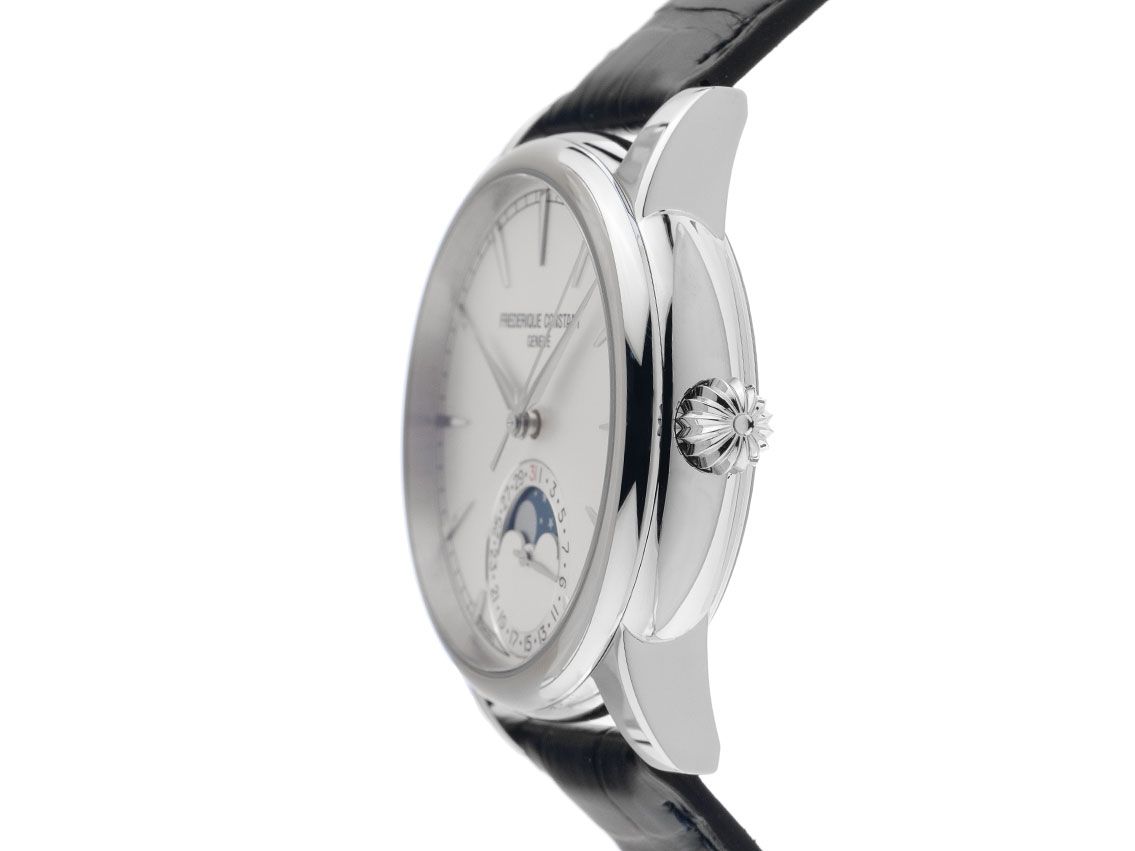 Gehäuse Edelstahl poliert, Gehäusedurchmesser ohne Krone 40mm, Gehäusehöhe 11,78mm. Lünette Edelstahl glatt und poliert. Armband Krokoleder schwarz mit Ziernaht, Anstoßbreite 20mm, Frederique Constant Faltschließe Edelstahl. Zifferblatt silberfarben mit aufgesetzten Edelstahl Indexen und Edelstahl Zeigern. Uhrwerk Automatik, Frederique Constant Manufakturkaliber FC-716 mit 26 Edelsteinen, Gangreserve ca. 72 Stunden. Anzeige von Stunde, Minute und Sekunde über Zeiger aus der Mitte mit Sekundenstopp zur sekundengenauen Einstellung der Uhrzeit, Datumsanzeige mit Schnellverstellung über Zeiger bei 6 Uhr, Mondphasenanzeige bei 6 Uhr. Saphirglas kratzfest und gewölbt. Zwiebelkrone. Boden Edelstahl verschraubt und graviert mit Saphirglas Sichtfenster. Gewicht der Uhr inklusive Armband 80g. Wasserdicht bis 5 ATM. Referenznummer: FC-716S3H6, ID: ST254638960225H-3995, Artikelnummer: 10000078732. Original Frederique Constant Box mit Umkarton und Garantie Papiere, Full Set. Neu. Lieferzeit sofort.