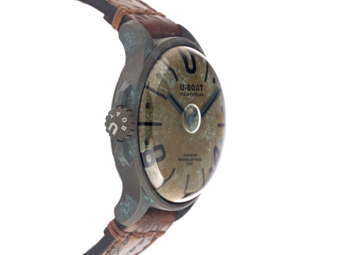 Gehäuse Edelstahl PVD Bronze behandelt und satiniert, Gehäusedurchmesser ohne Krone 44mm, Gehäusehöhe 16,5mm. U-Boat Armband Leder braun mit geprägter Schrift, Anstoßbreite 22mm, Stiftschließe Edelstahl PVD Bronze behandelt mit Hersteller-Logo. Zifferblatt bronzefarben patiniert mit arabischen Ziffern und Indexen sowie Leuchtzeigern. Uhr ist mit einem speziellen Öl gefüllt sowie einer Luftblase zum Ausgleich der Temperaturschwankungen. Uhrwerk quarzgesteuert, elektromechanisch, U-Boat Kaliber Ronda 762, im Ölbad, arbeitet zwischen 0° und +60°C. Anzeige von Stunde und Minute über Zeiger aus der Mitte. Saphirglas kratzfest und gewölbt. Krone links bei 9 Uhr, verschraubbar. Boden Edelstahl PVD Bronze behandelt, verschraubt und graviert. Gewicht der Uhr inklusive Armband 124g. Wasserdicht 5 ATM. Referenznummer: 9600/A, ID: ST115417860325HPP-1600, Artikelnummer: 10000079438. Original U-Boat Box mit Umkarton und Garantie Papiere, Full Set. Neu. Lieferzeit sofort.