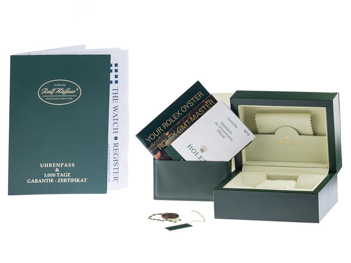 Inklusive certified pre owned Zertifikat / Uhrenpass mit einem Farbbild, der genauen Beschreibung sowie dem Wiederbeschaffungswert der Uhr über 18500,-€ und 1000 Tage Garantie ab Kaufdatum.