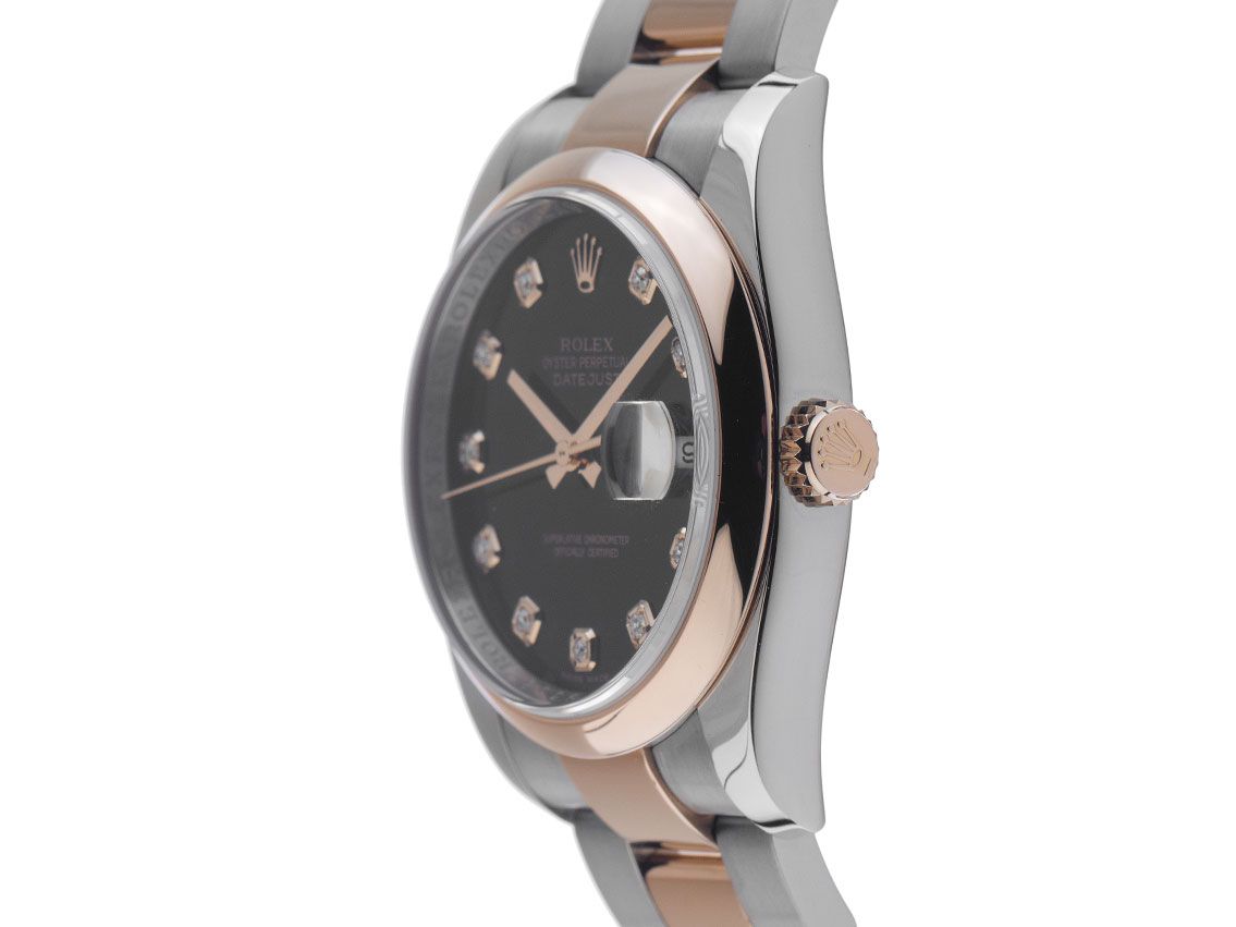 Gehäuse Edelstahl poliert und satiniert, Gehäusedurchmesser ohne Krone 36mm, Gehäusehöhe 11,8mm. Lünette 18kt Roségold Everose glatt und poliert. Armband Oyster Edelstahl / 18kt Roségold Everose poliert und satiniert, Faltschließe Edelstahl / 18kt Roségold Everose mit Hersteller-Logo. Zifferblatt schwarz mit aufgesetzten in Roségold gefassten Diamantindexen und roségoldenen Zeigern. Uhrwerk Automatik, Chronometer mit Zeugnis, Rolex Manufakturkaliber 3135 mit 31 Edelsteinen. Anzeige von Stunde, Minute und Sekunde über Zeiger aus der Mitte mit Sekundenstopp zur sekundengenauen Einstellung der Uhrzeit, Datumsanzeige mit Schnellverstellung unter Glaslupe bei 3 Uhr. Saphirglas kratzfest. Krone verschraubbar mit Hersteller-Logo. Boden Edelstahl verschraubt. Gewicht der Uhr inklusive Armband 132g, Länge des Armbandes inklusive Gehäuse 180mm. Referenznummer: 116201, Gehäusenummer: V439XXX, ID: P1124210000725H-14800, Artikelnummer: 10000081106. Mit Gangkontrolle und kompletter äußerlicher Aufarbeitung von Juli 2025. Original Rolex Box mit Umkarton und Garantie Papiere von Oktober 2008, LC 838 / China, sowie Beschreibung, Ledermäppchen, Tag, Rolex Chronometer-Siegel und Watchregister Auszug von Juli 2025, The Watch Register Zertifikat / ohne Eintrag (Internationale Datenbank für verlorene oder gestohlene Uhren), Full Set. Kapitalanlage mit Wertsteigerungspotential, sehr seltenes Sammlerstück. Wie Neu. Lieferzeit sofort.