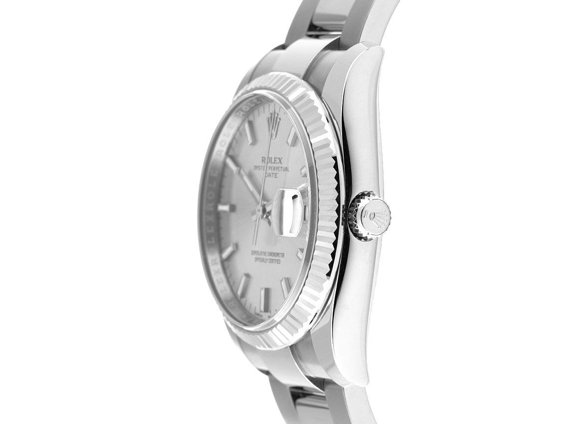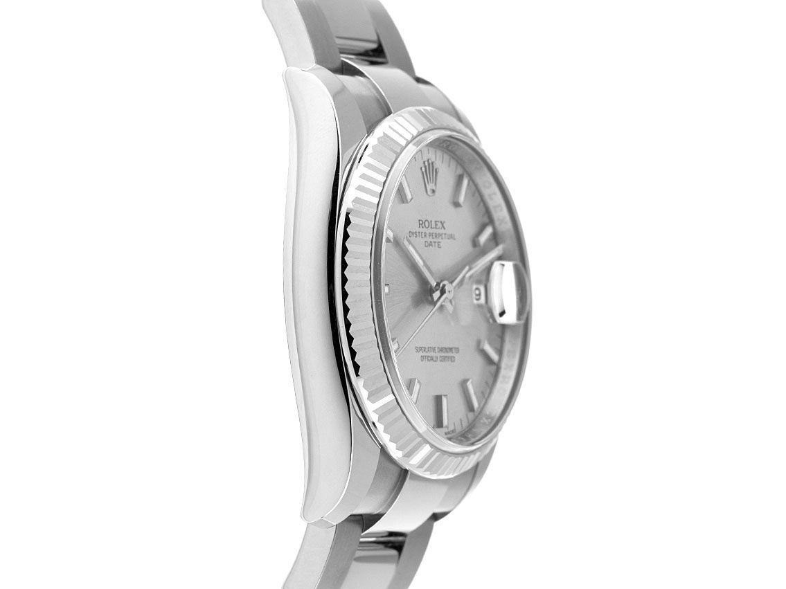 Gehäuse Edelstahl poliert und satiniert, Gehäusedurchmesser ohne Krone 34mm, Gehäusehöhe 11,5mm. Lünette 18kt Weißgold poliert und geriffelt. Armband Oyster Edelstahl poliert und satiniert, Faltschließe Edelstahl mit Hersteller-Logo. Zifferblatt silberfarben mit aufgesetzten Indexen und weißgoldenen Zeigern. Uhrwerk Automatik, Chronometer mit Zeugnis, Rolex Manufakturkaliber 3135 mit 31 Edelsteinen. Anzeige von Stunde, Minute und Sekunde über Zeiger aus der Mitte mit Sekundenstopp zur sekundengenauen Einstellung der Uhrzeit, Datumsanzeige mit Schnellverstellung unter Glaslupe bei 3 Uhr. Saphirglas kratzfest. Krone verschraubbar mit Hersteller-Logo. Boden Edelstahl verschraubt. Gewicht der Uhr inklusive Armband 118g, Länge des Armbandes inklusive Gehäuse 185mm. Referenznummer: 115234, Gehäusenummer: X490VXXX, ID: P184180001125H-8900, Artikelnummer: 10000082988. Mit Gangkontrolle und kompletter äußerlicher Aufarbeitung von November 2025. Original Rolex Box mit Umkarton und Garantie Papiere von Oktober 2017, LC 170 / Italy EU sowie Beschreibung, Ledermäppchen, Rolex Chronometer-Siegel und Watchregister Auszug von November 2025, The Watch Register Zertifikat / ohne Eintrag (Internationale Datenbank für verlorene oder gestohlene Uhren), Full Set. Wie Neu. Lieferzeit sofort.
