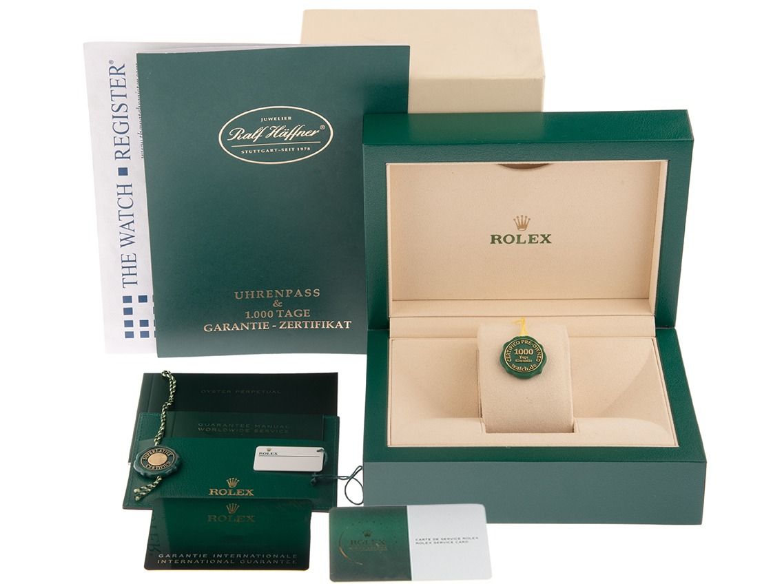 Inklusive Uhrenpass mit einem Farbbild, der genauen Beschreibung sowie dem Wiederbeschaffungswert der Uhr über 17450,-€ und 1000 Tage Garantie ab Kaufdatum.