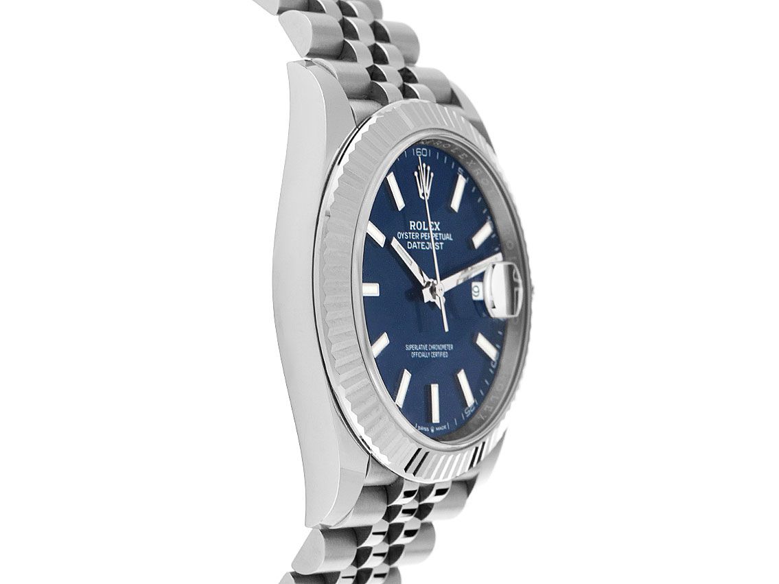 Gehäuse Edelstahl poliert und satiniert, Gehäusedurchmesser ohne Krone 41mm, Gehäusehöhe 11,6mm. Lünette 18kt Weißgold geriffelt und poliert. Armband Jubilé Edelstahl poliert und satiniert, Faltschließe Edelstahl mit Hersteller-Logo. Zifferblatt blau mit aufgesetzten in Weißgold gefassten Leuchtindexen und weißgoldenen Leuchtzeigern. Uhrwerk Automatik, Chronometer mit Zeugnis, Rolex Manufakturkaliber 3235 mit 31 Edelsteinen, Gangreserve ca. 70 Stunden. Anzeige von Stunde, Minute und Sekunde über Zeiger aus der Mitte mit Sekundenstopp zur sekundengenauen Einstellung der Uhrzeit, Datumsanzeige mit Schnellverstellung unter Glaslupe bei 3 Uhr. Saphirglas kratzfest. Krone verschraubbar mit Hersteller-Logo. Boden Edelstahl verschraubt. Gewicht der Uhr inklusive Armband 132g, Länge des Armbandes inklusive Gehäuse 175mm. Wasserdicht bis 10 ATM. Referenznummer: 126334, Gehäusenummer: 3V415XXX, ID: P2084180001225H-13900/11050, Artikelnummer: 10000083747. Original Rolex Box mit Umkarton und Garantie Papiere von Oktober 2022, neue Rolex Garantie Karte ohne Ländercode sowie Beschreibung, Ledermäppchen, Rolex Chronometer-Siegel, Tag und Watchregister Auszug von Dezember 2025, The Watch Register Zertifikat / ohne Eintrag (Internationale Datenbank für verlorene oder gestohlene Uhren), Full Set. Kapitalanlage mit Wertsteigerungspotential. Wie Neu. Lieferzeit sofort.
