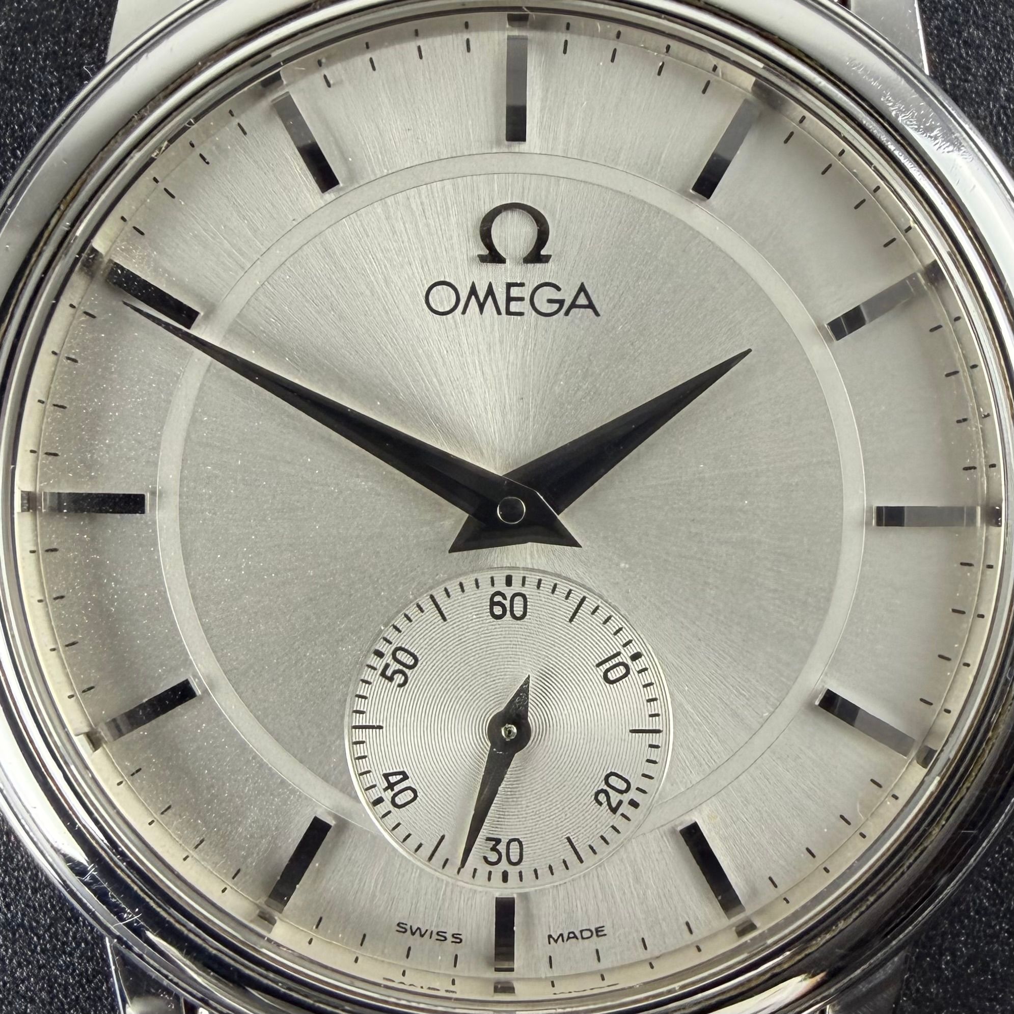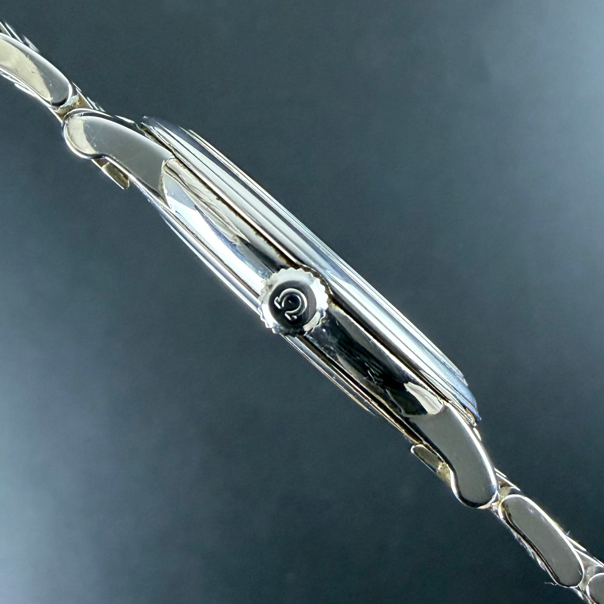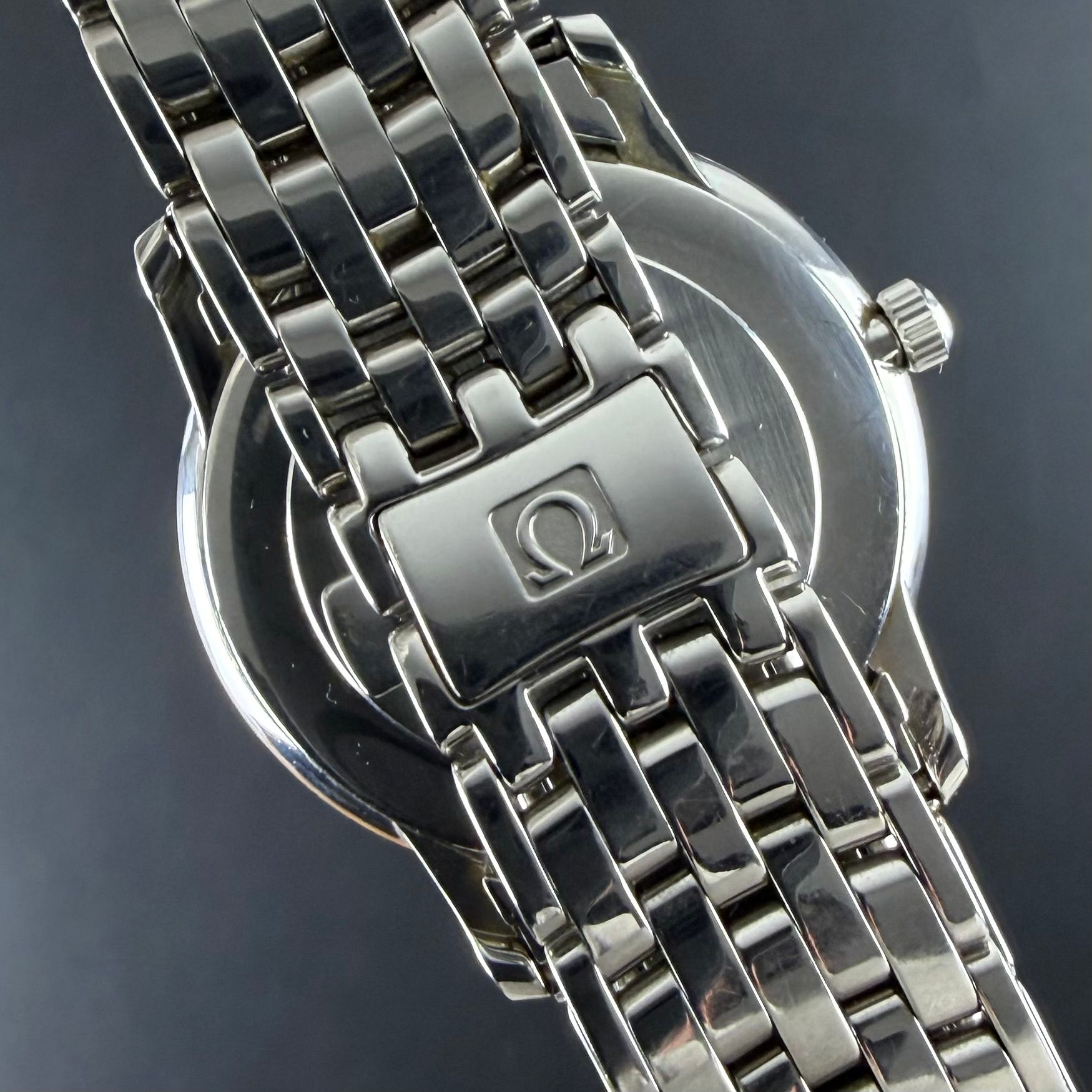 This vintage Omega De Ville Prestige, produced in 1995, features a white dial with fine textured motifs and a subtle sunburst effect, accented by silver hands and the Omega logo. It houses the caliber 651 manual-wind movement, serviced in December 2025 and currently running excellently. The movement provides a small seconds subdial at six o’clock. Both the 34,5mm case and the bracelet are stainless steel, and the bracelet is nearly fully linked, fitting wrists from 14 to 20cm. The watch remains entirely original and is in great shape, suitable for daily wear or as an elegant dress watch thanks to its refined design and slim profile.