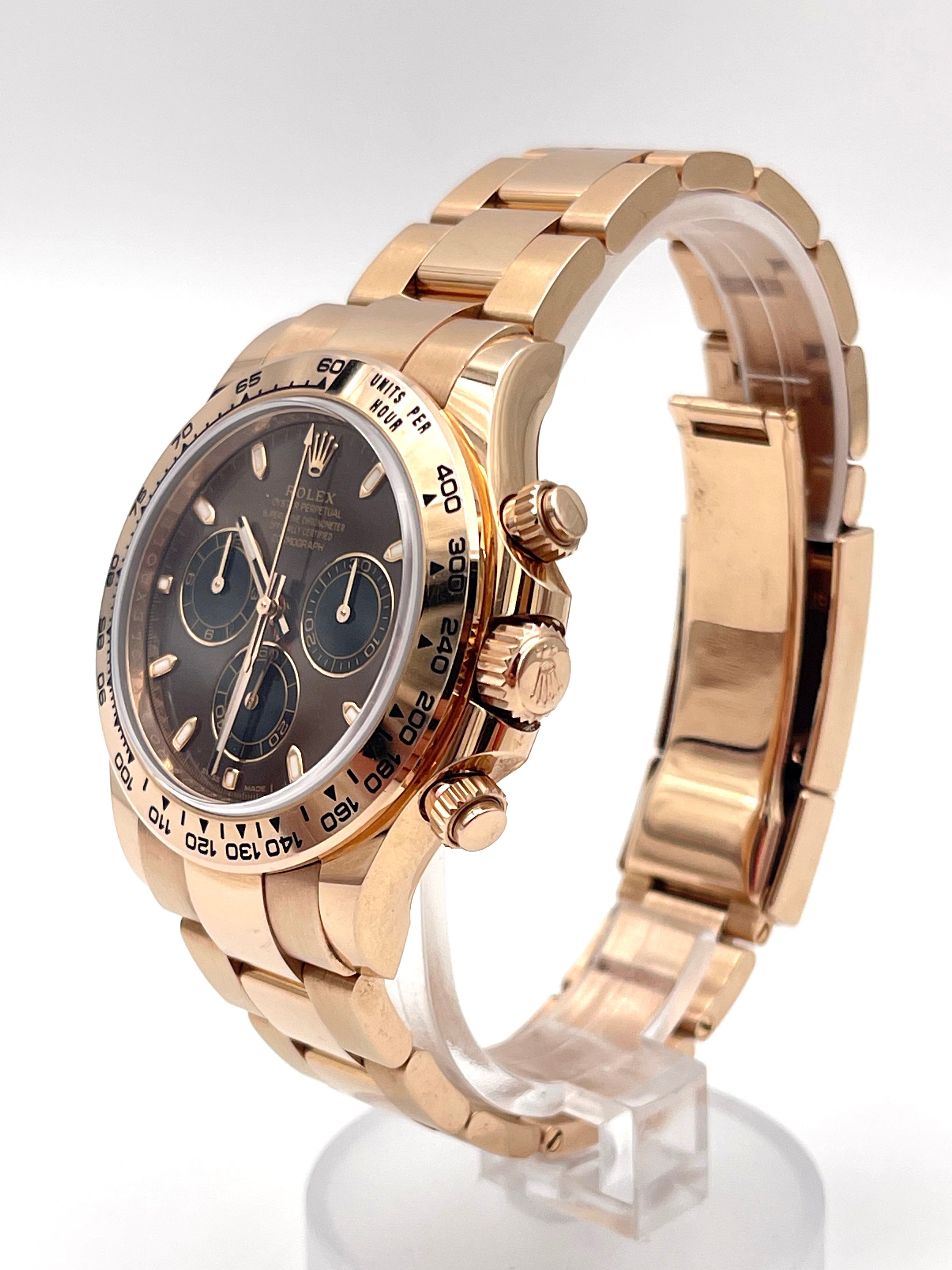 Rolex Daytona 18k Everose Gold Chocolate and black dial features an 18k Everose Gold bezel with engraved tachymetric scale. A truly exceptional wristwatch. The Daytona’s chronograph feature functions are activated by pushers that screw down like the winding crown when they are not in use,guaranteeing waterproofness to 100 metres. One press to start,stop or reset the chronograph produces a crisp,clear click that was perfected using the most advanced technology. Rolex watchmakers also perfected the mechanism to suit the ideal finger pressure on the pushers,and engineered it to provide an instantaneous and accurate start to the timing without sacrificing reliability.This watch comes as full set (original Rolex card,box,booklets,price tag).