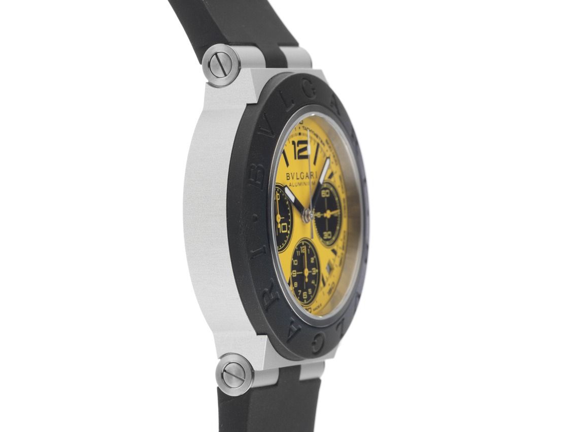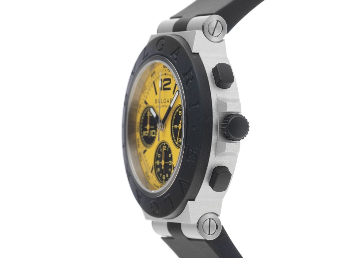 Gehäuse Aluminium satiniert, Gehäusedurchmesser ohne Krone 41mm, Gehäusehöhe 12,7mm. Lünette Kautschuk schwarz mit "Bulgari" Aufschrift. Armband Kautschuk schwarz, verschraubte Bandanstöße, Stiftschließe Aluminium mit Hersteller-Logo. Zifferblatt gelb mit arabischer Ziffer 12, schwarzen Indexen und schwarzen Zeigern. Uhrwerk Automatik, Chronograph, Bulgari Manufakturkaliber B381, Gangreserve ca. 42 Stunden. Anzeige von Stunde und Minute über Zeiger aus der Mitte, kleine Sekunde mit Sekundenstopp zur sekundengenauen Einstellung der Uhrzeit bei 3 Uhr, Datumsanzeige mit Schnellverstellung zwischen 4 und 5 Uhr. Saphirglas kratzfest. Krone verschraubbar mit Flankenschutz. Boden Aluminium schwarz und graviert. Gewicht der Uhr inklusive Armband 81g. Wasserdicht bis 10 ATM. Referenznummer: 104006, ID: ST116073301225H-5500, Artikelnummer: 10000083776. Original Bulgari Aluminium Box und Garantie Papiere von Dezember 2025, Full Set. Limitiert auf 500 Exemplare. Ungetragen. Lieferzeit sofort.