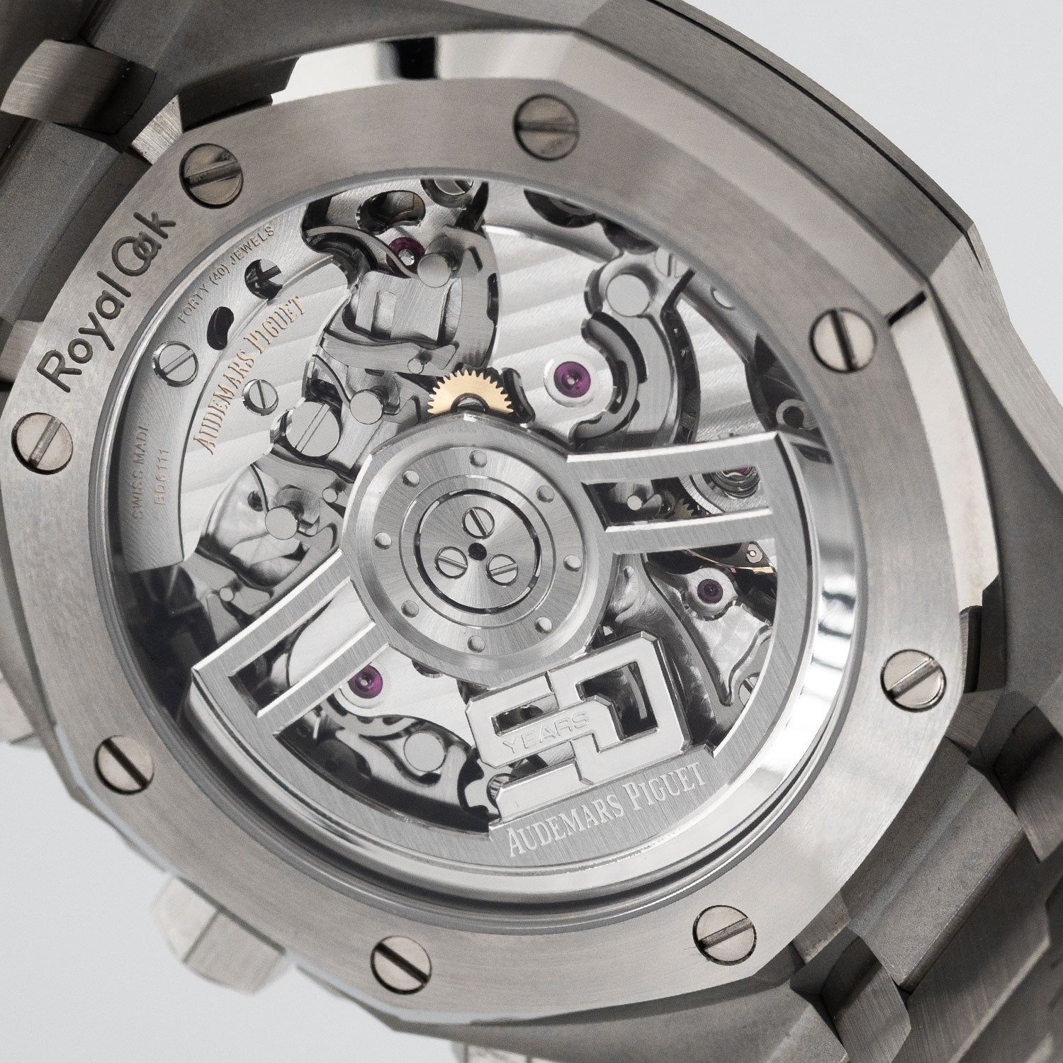 Die Audemars Piguet Royal Oak Chronograph 50th Anniversary in Grün, Referenz 26240ST.OO.1320ST.04, präsentiert sich mit einem 41-mm-Edelstahlgehäuse, der ikonischen achteckigen Lünette und einem integrierten Edelstahlarmband, das den typischen Royal-Oak-Look verkörpert. Das grüne „Grande Tapisserie“-Zifferblatt mit farblich abgestimmten Chronographenzählern verleiht der Uhr eine moderne, sportliche Eleganz, während applizierte Indizes und Weißgoldzeiger für hohe Ablesbarkeit sorgen. Im Inneren arbeitet das automatische Kaliber 4401 mit Säulenrad und Flyback-Funktion, sichtbar durch den Saphirglasboden, wo die speziell für das Jubiläumsjahr gestaltete „50 Years“-Schwungmasse den exklusiven Charakter des Modells unterstreicht. Sie erhalten 1 Jahr Gewährleistung auf die Funktion des Uhrwerks.