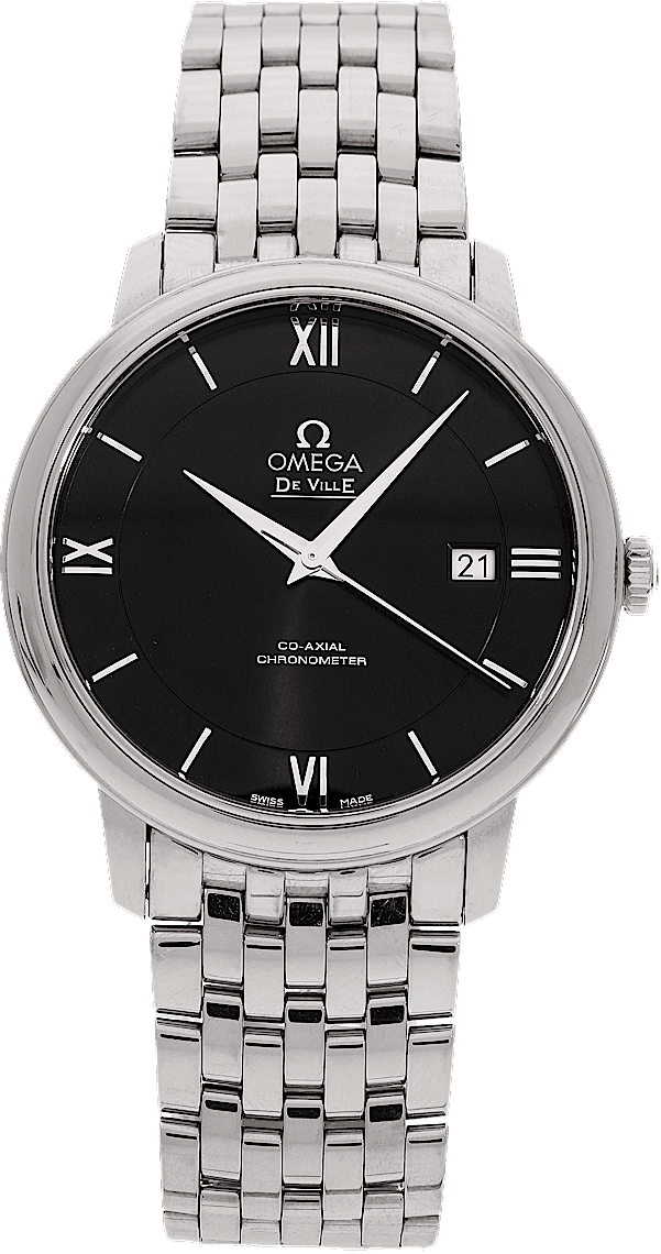 Omega De Ville, Reference: 424.10.40.20.01.001, Gender: Male, Size: 39mm, Dial color: Black, Strap material: Stainless Steel, Movement: Automatic, Year: 2022, Condition: Previously worn with some signs of usage. The movement is flawless and the case has been cleaned. watch tested to ensure full functionality. An inspection by our certified watchmakers guarantees its authenticity., Documents: Original papers, CHRONEXT Certificate