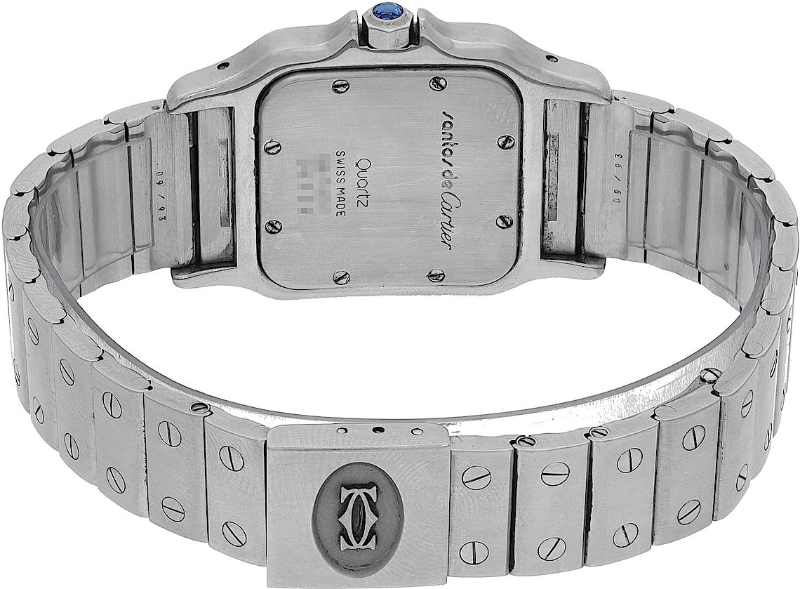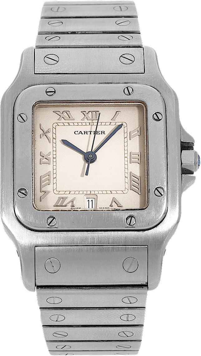Cartier Santos, Reference: 987901, Gender: Unisex, Size: 29mm, Dial color: Beige, Strap material: Stainless Steel, Movement: Quartz, Condition: Previously worn with some signs of usage. The movement is flawless and the case has been cleaned. watch tested to ensure full functionality. An inspection by our certified watchmakers guarantees its authenticity., Documents: Original papers, CHRONEXT Certificate