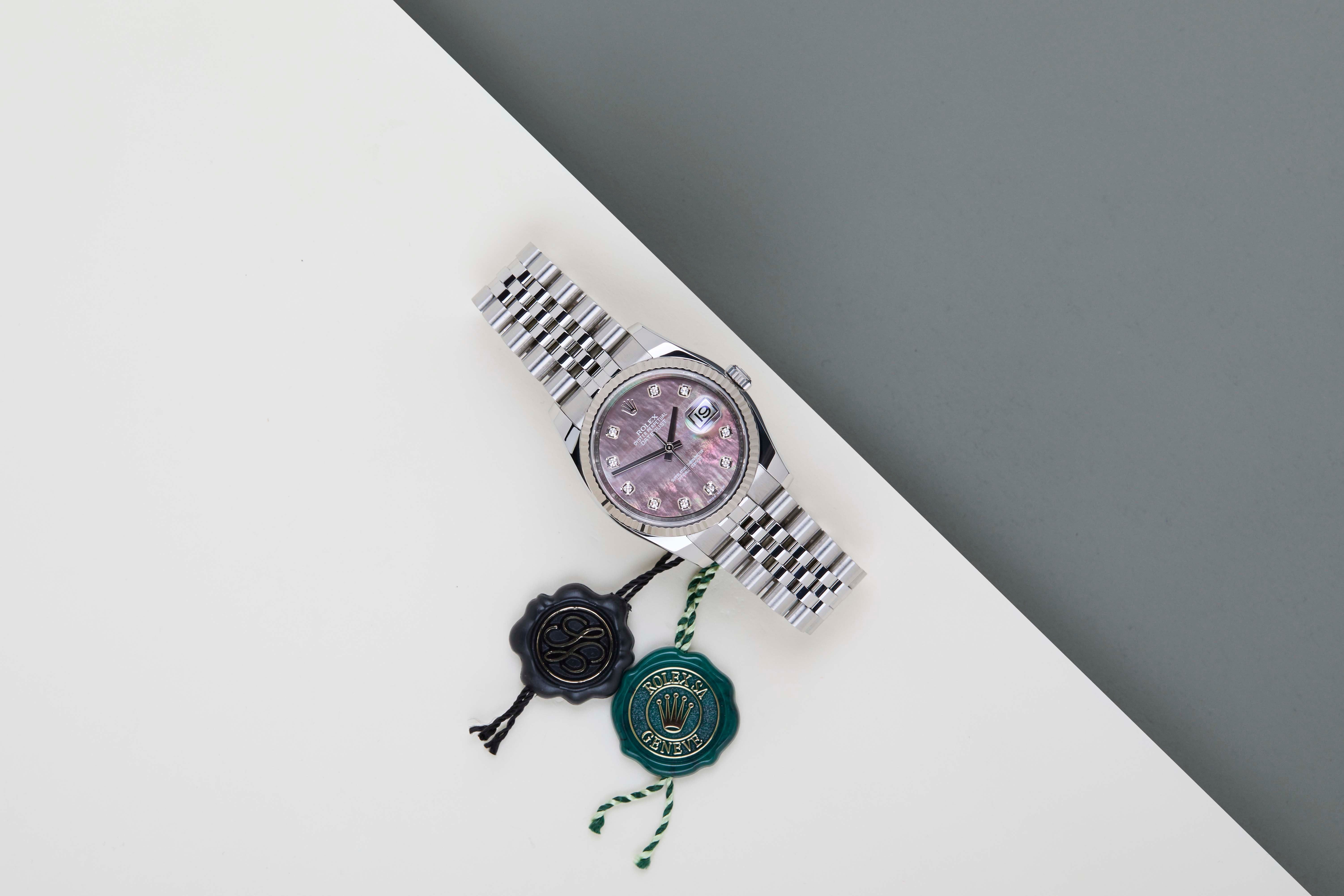 Full Set | Original Tahitian Mother Of Pearl Diamond Dial Rolex introduced the original Datejust in 1945 to celebrate the company's 40th anniversary. Due to the various case sizes and materials, the Datejust has been ingrained in Rolex's history and remains incredibly popular for 75 years.This Rolex Datejust 'Tahitian Mother Of Pearl Diamond Dial' was sold for the first time in October 2019.This Datejust is made of a combination of 18k White Gold and stainless steel and is fitted with a Jubilee bracelet which conceals the Crown clasp. The timepiece features a Tahitian Diamond Dial.This Rolex Datejust 36 is in Mint condition and comes with the original Rolex Warranty Papers and Box. Furthermore, the watch comes with one year of Steiner warranty.