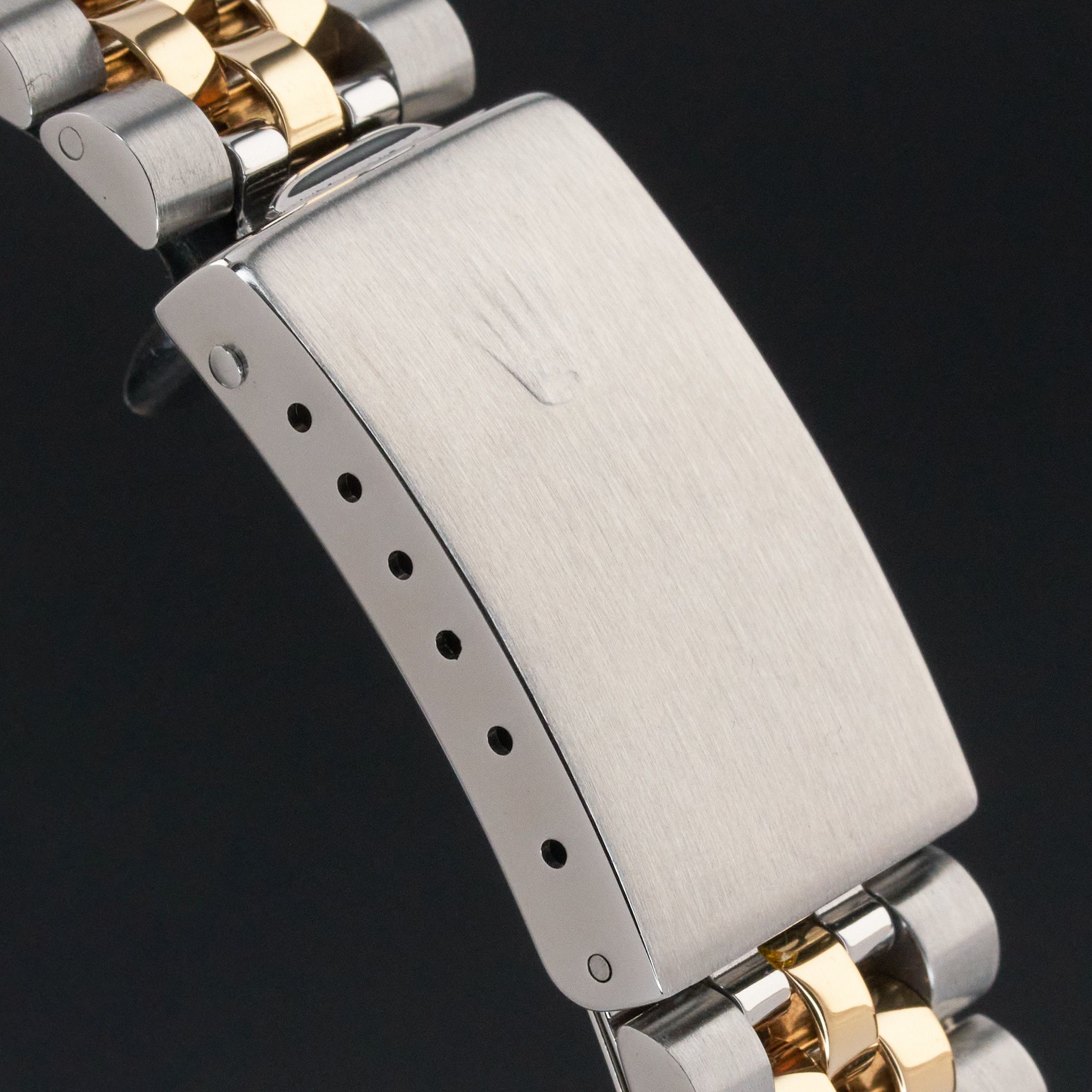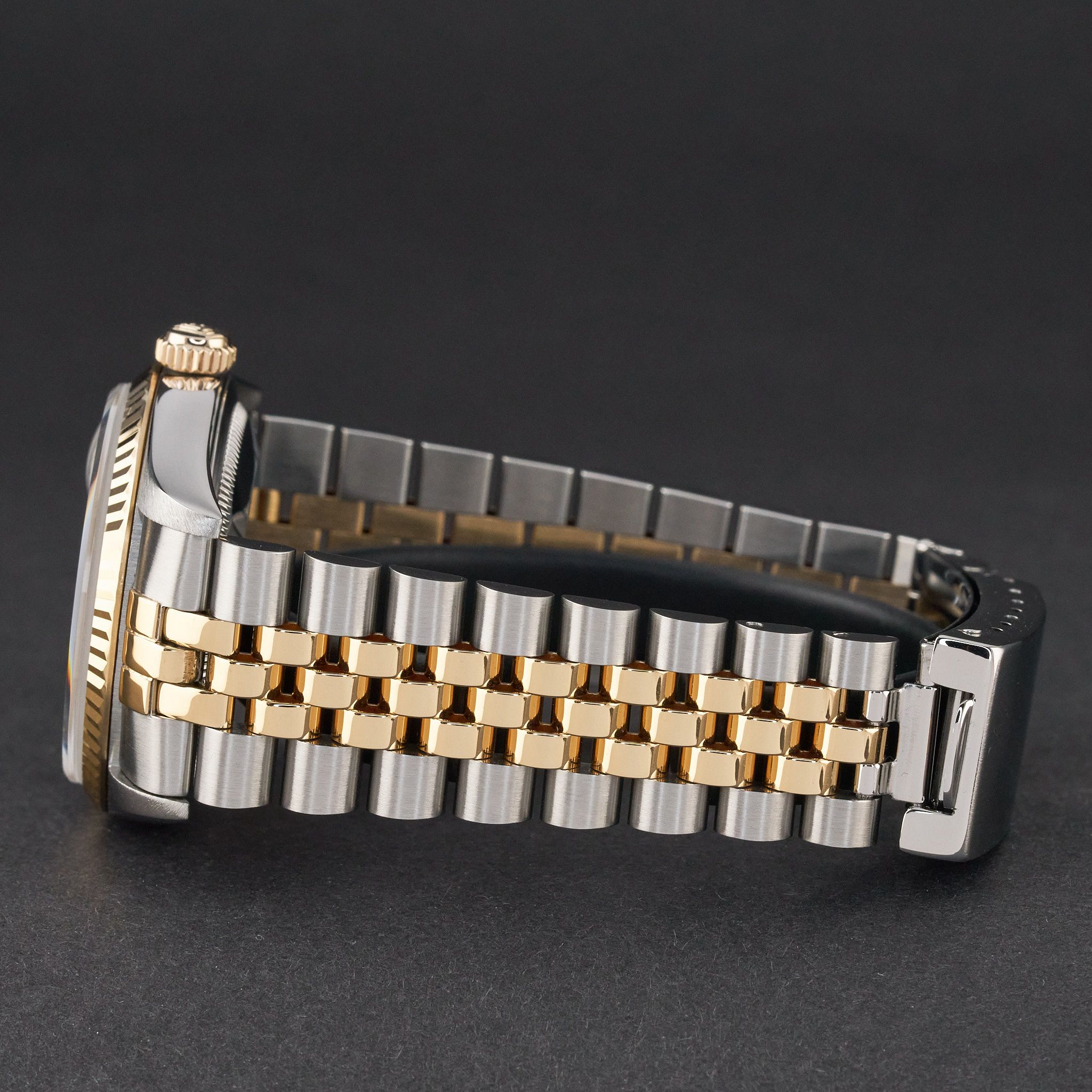 This Rolex Datejust 16233 features a Silver jubilee big diamond dial and is crafted from 18K yellow gold and stainless steel, with a production year of 1996.