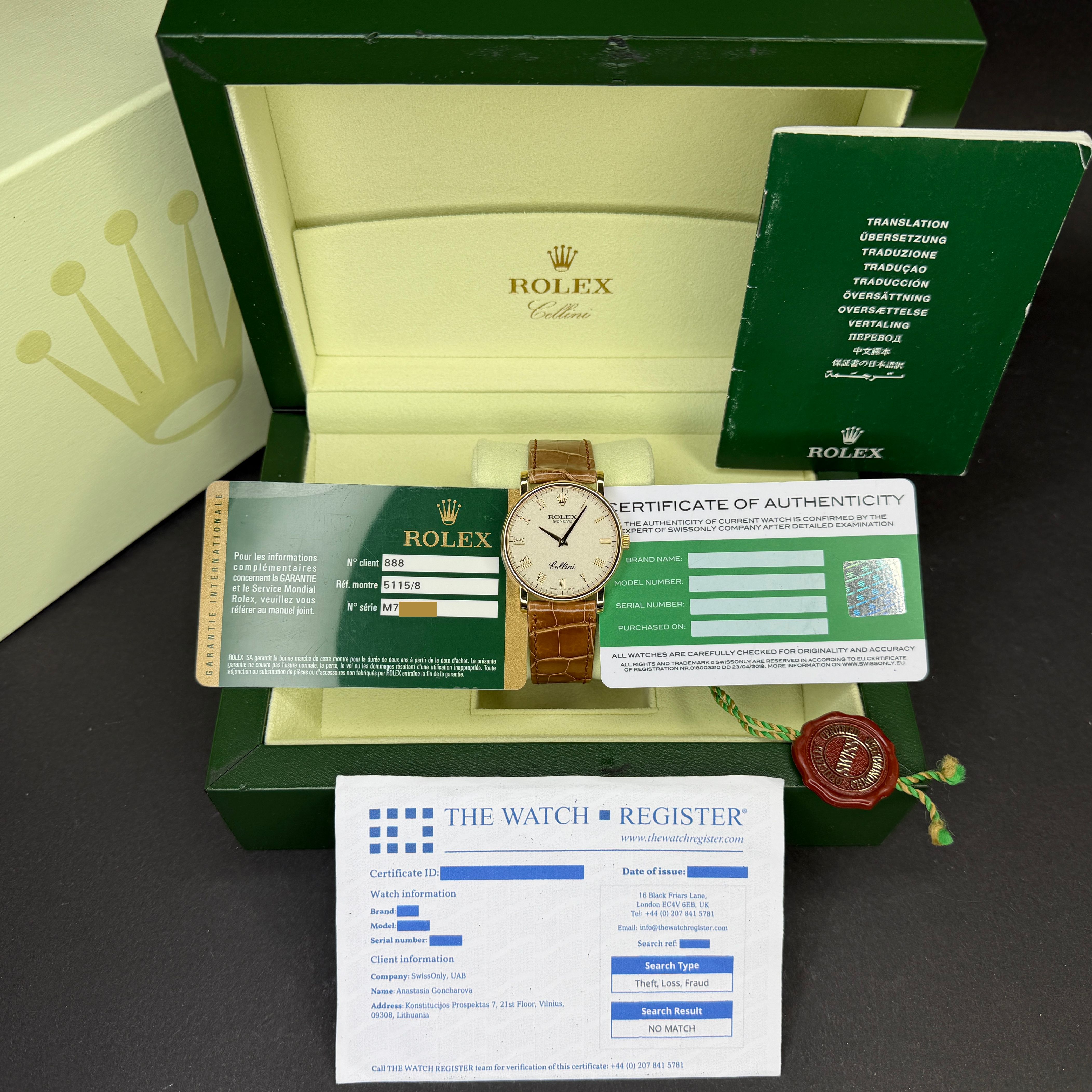 This Rolex Cellini 5115/8 features an Ivory jubilee Roman dial and is crafted from 18K yellow gold, with a production year of 2008.