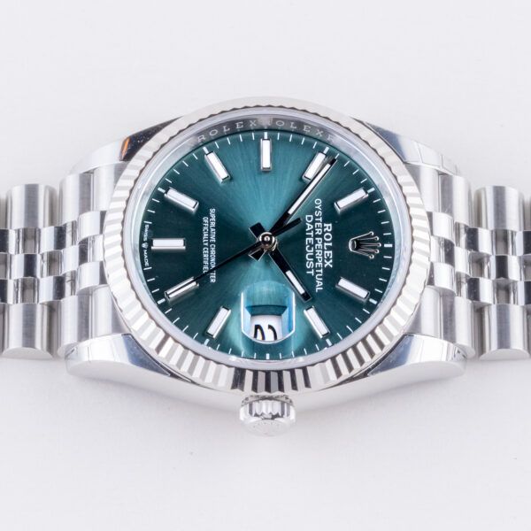 Rolex Oyster Perpetual Datejust reference 126234 from 2025 including full set. The Datejust 126234 measures a 36mm stainless steel case, a stainless steel Jubilee bracelet with Oysterclasp and a 18k white gold fluted bezel. This Datejust 126234 features an automatic movement caliber 3235 with quickset date function, scratch resistance sapphire crystal and a mint green dial with chromalight hands and markers.
