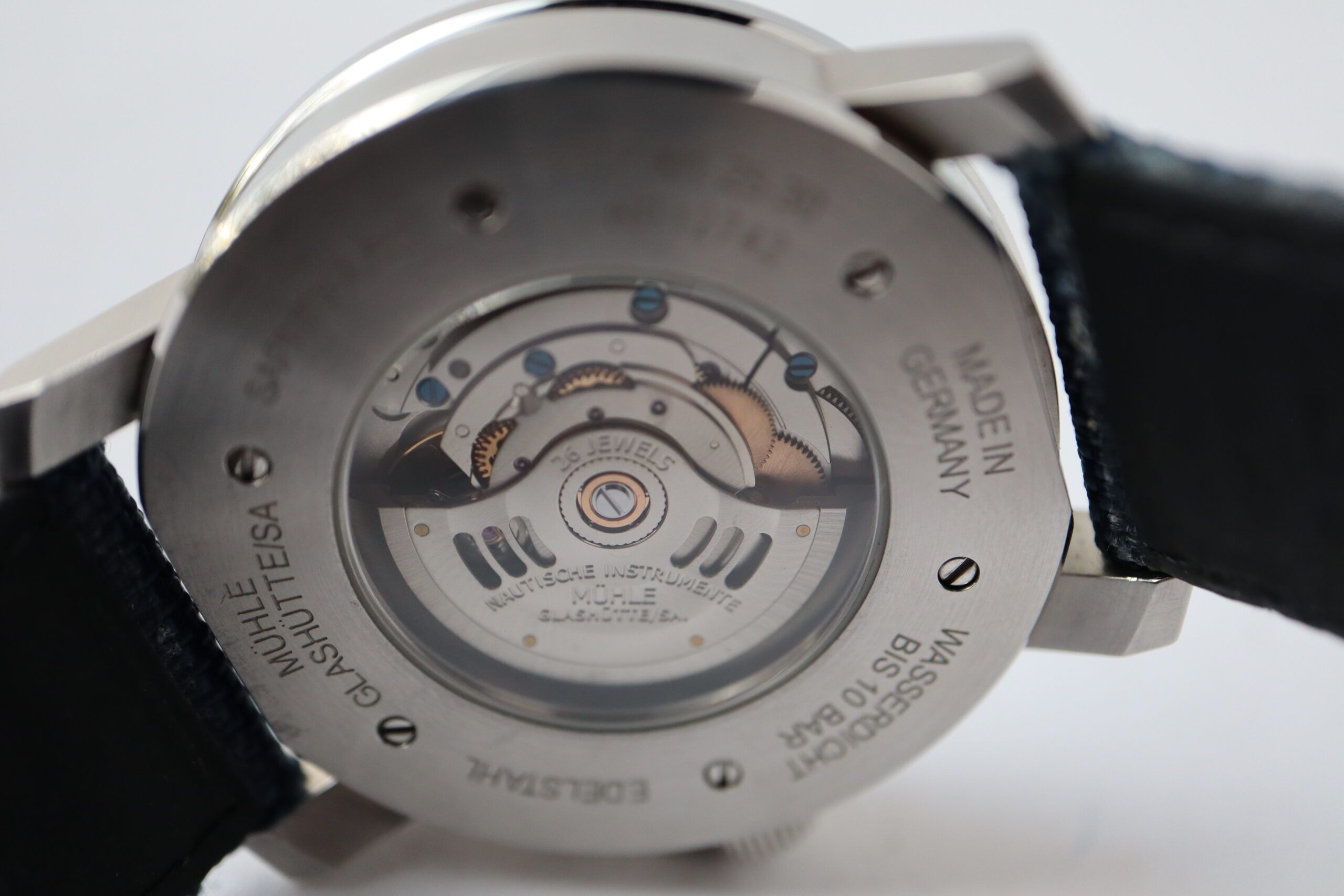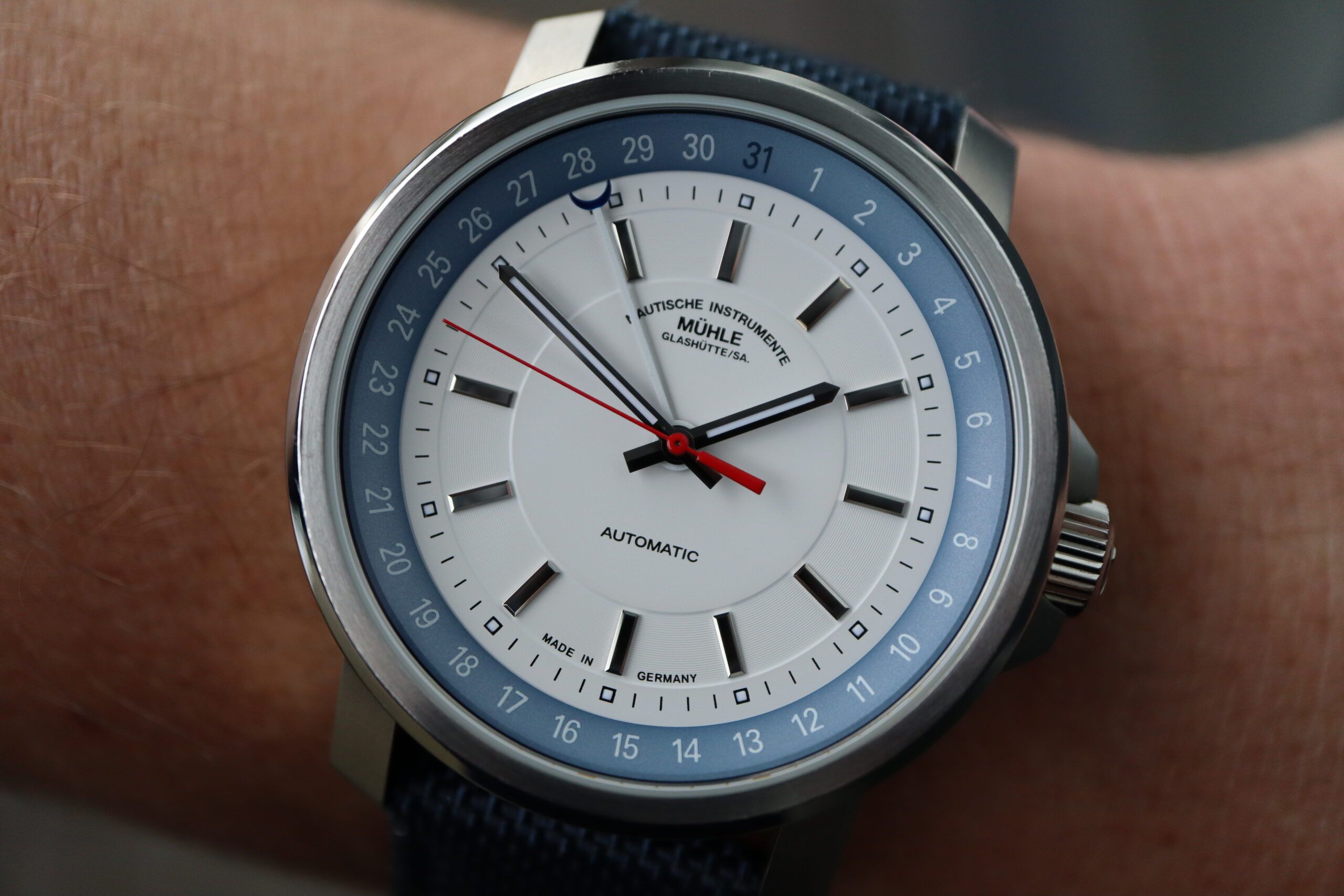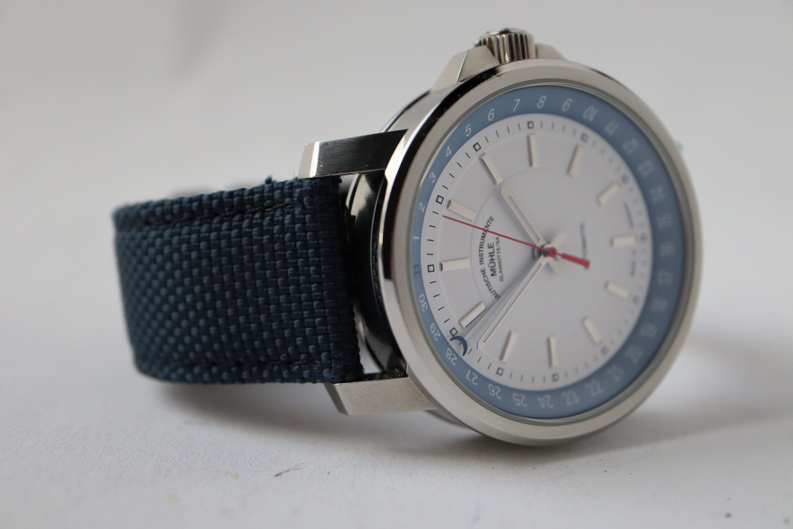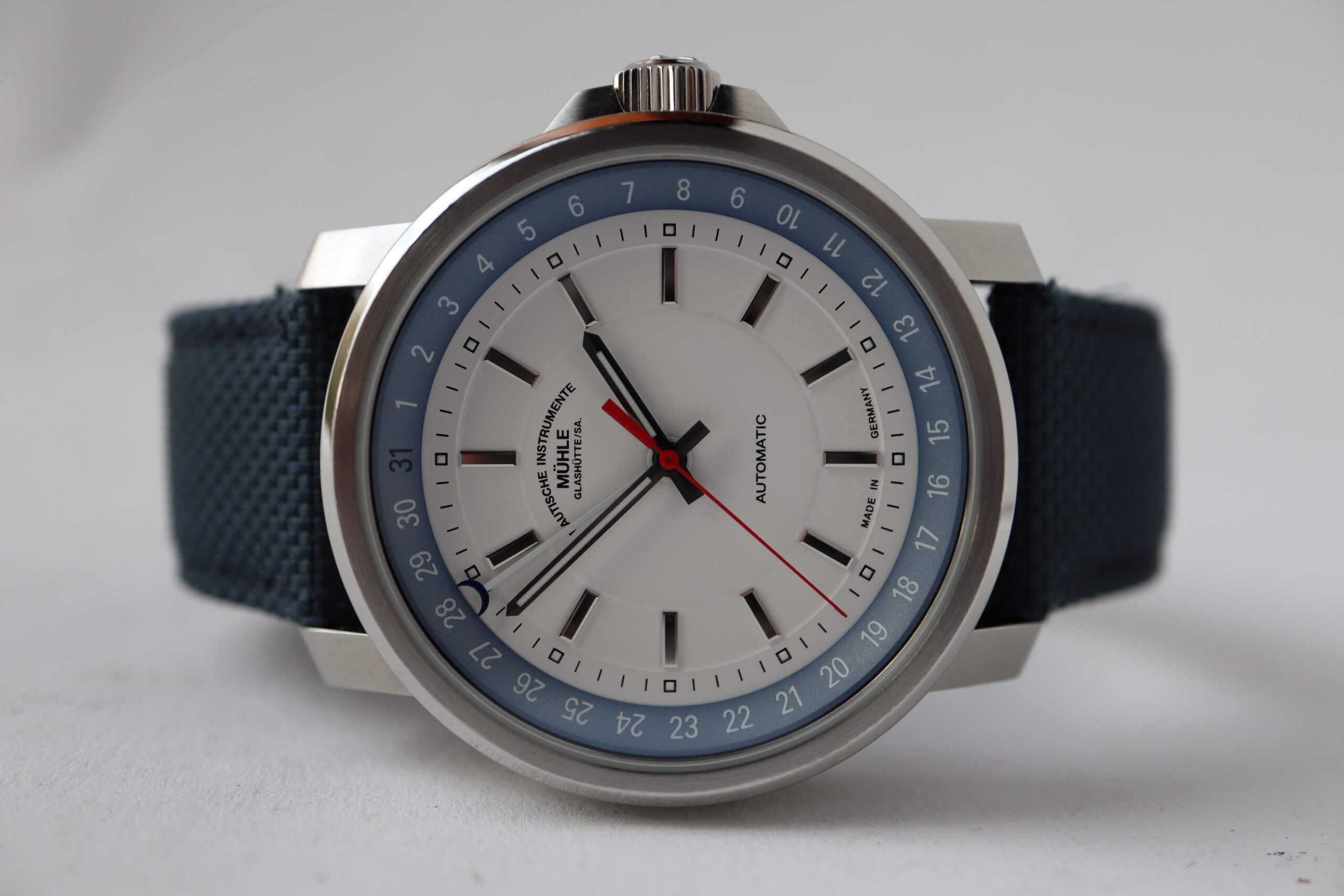 Muhle Glashutte Watch 29er Zeigerdatum M1-25-32-NB. A sporty timepiece for everyone who wants to set a steady course without running aground. The analogue Zeigerdatum brings an element of watchmaking nostalgia to its wearers day to day lives and enables them to navigate their way through the seas of time in a relaxed yet highly precise manner. The face is framed by the Zeigerdatums light blue weekday display on the flange. This type of date display features a date hand that makes one revolution around its axis every 31 days and provides an analogue display of the current day, which is framed by a classic dark blue crescent on the tip of the hand. In contrast with the watch's waves of blue colour, its red second-hand clearly stands out against the face and emphasises the timepiece's sporty design. Although dynamic sailing is important on the high seas, maximum precision and complete reliability play an even more essential role when it comes to setting a secure course.