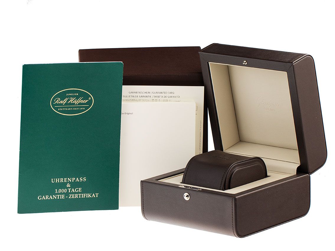 Inklusive Uhrenpass mit einem Farbbild, der genauen Beschreibung sowie dem Wiederbeschaffungswert der Uhr über 7400,-€ und 1000 Tage Garantie ab Kaufdatum.