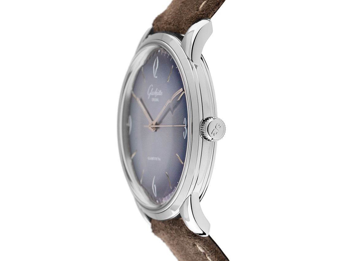 Gehäuse Edelstahl poliert, Gehäusedurchmesser ohne Krone 39mm, Gehäusehöhe 9,4mm. Lünette Edelstahl glatt und poliert. Armband Leder braungrau mit Ziernaht, Anstoßbreite 19mm, Glashütte Original Stiftschließe Edelstahl mit Hersteller-Logo. Ziffernblatt gletscherblau lackiert mit Dégradé-Effekt, arabischen Ziffern und Indexen sowie polierten Leuchtzeigern. Uhrwerk Automatik, Glashütte Original Manufakturkaliber 39-52 mit 25 Edelsteinen. Gangreserve ca. 40 Stunden, 28.800 A/h, skelettierter Rotor mit 21kt Gold Schwungmasse, Schwanenhals Feinregulierung. Anzeige von Stunde, Minute und Sekunde über Zeiger aus der Mitte mit Sekundenstopp zur sekundengenauen Einstellung der Uhrzeit. Saphirglas gewölbt kratzfest. Krone mit Hersteller-Logo. Boden Edelstahl 5-fach verschraubt und graviert mit Saphirglas Sichtfenster. Gewicht der Uhr inklusive Armband 50g. Referenznummer: 1-39-52-14-02-04, ID: ST1160102201225H-7400, Artikelnummer. 10000083900. Original Glashütte Box und Garantie Papiere von November 2025 sowie Beschreibung, Full Set. Ungetragen. Lieferzeit sofort.